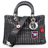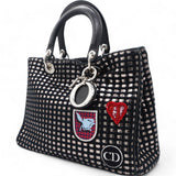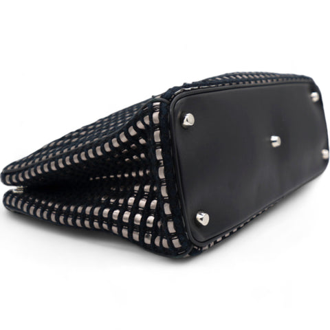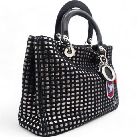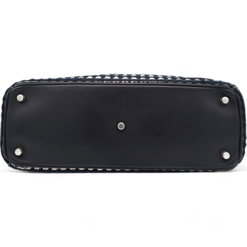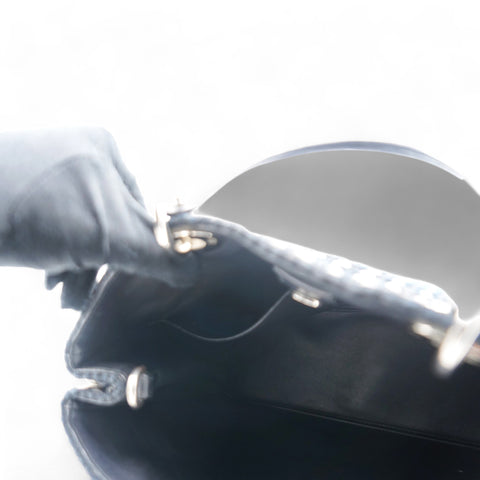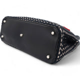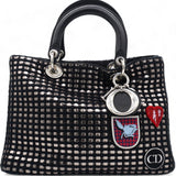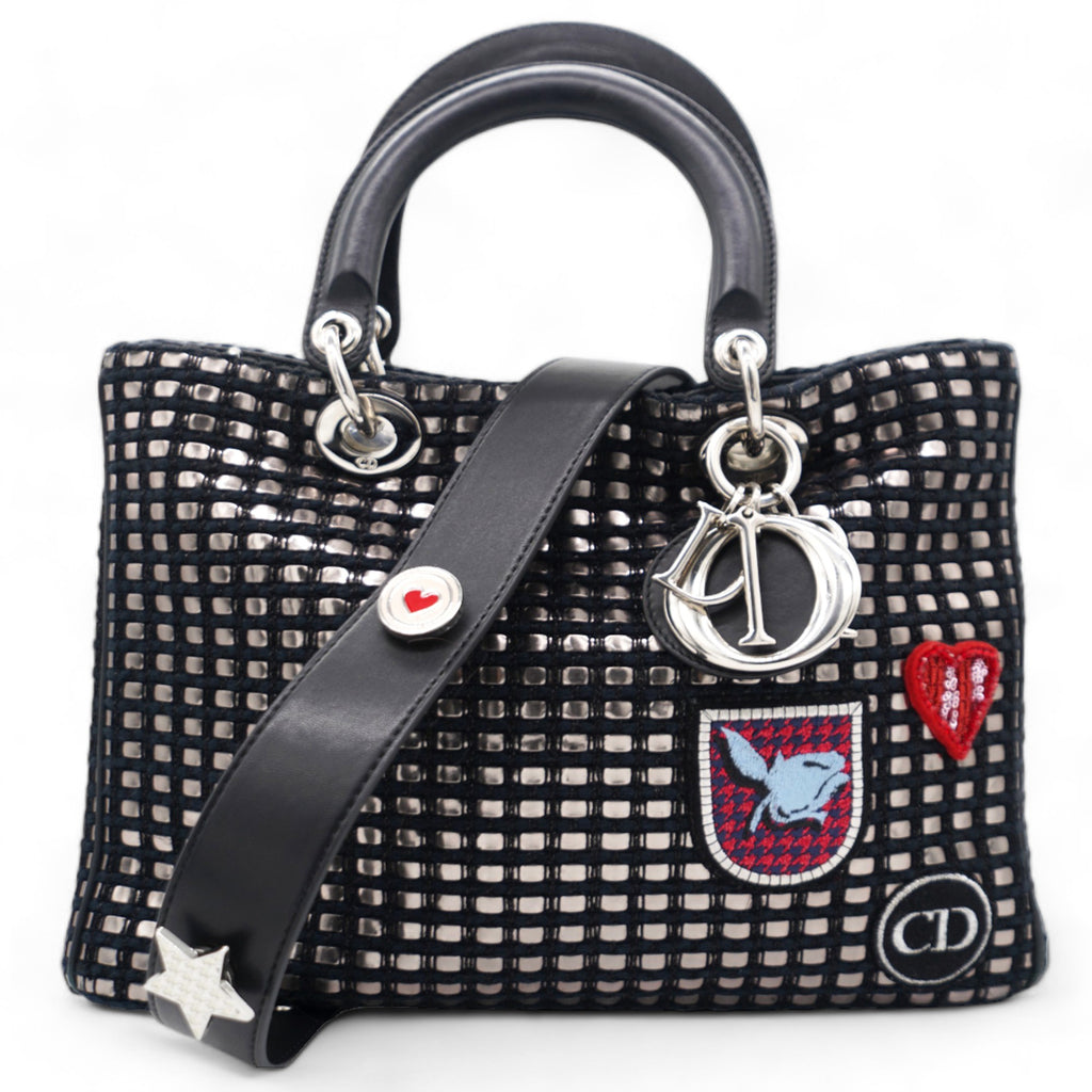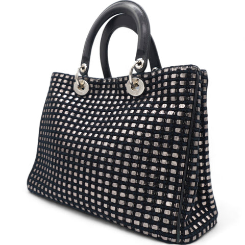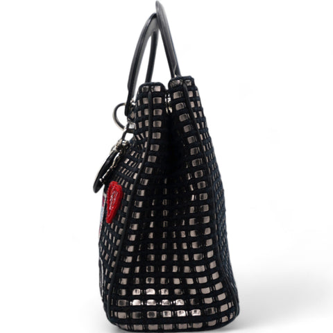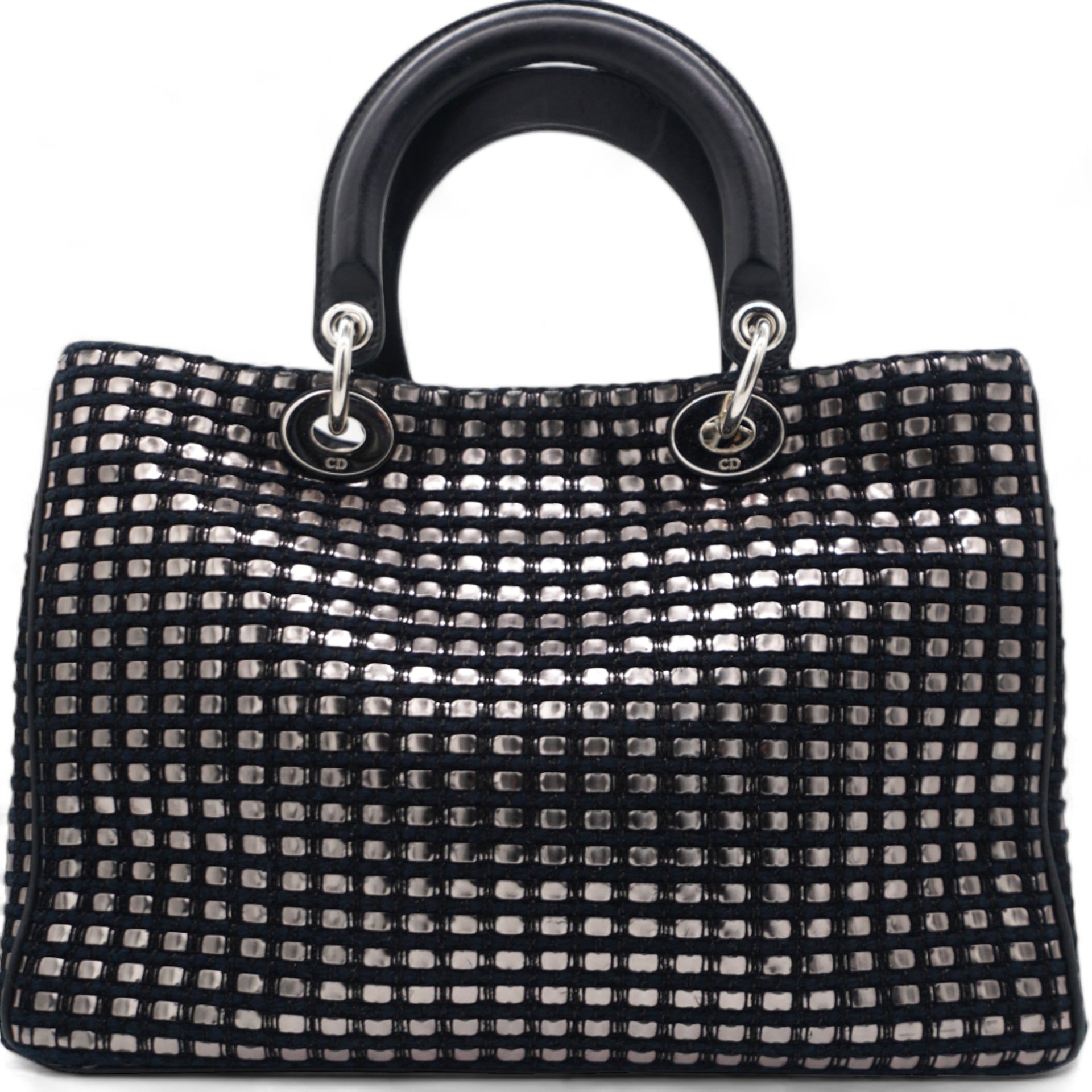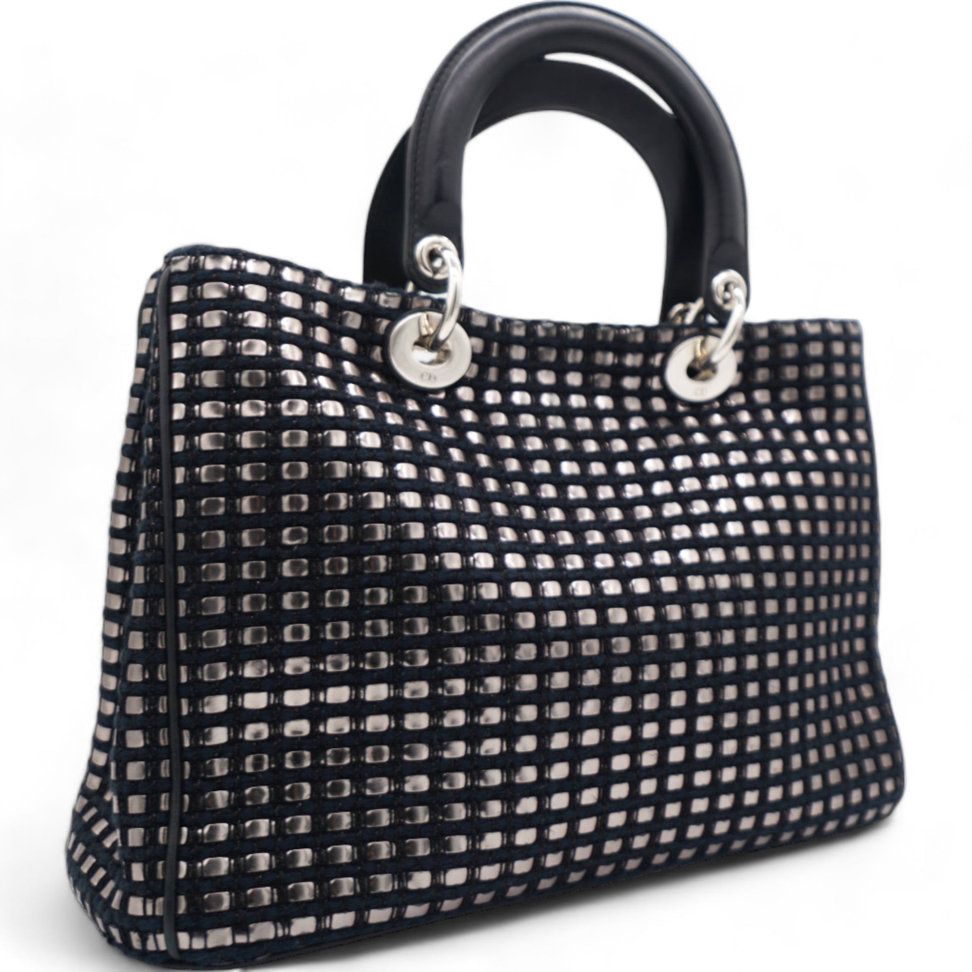 | This lovely tote is crafted of metallic tweed fabric in silver and black. The bag features reinforced black leather top handles, an optional shoulder strap and silver hardware. The top zipper opens to a black leather interior with patch pockets. |