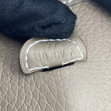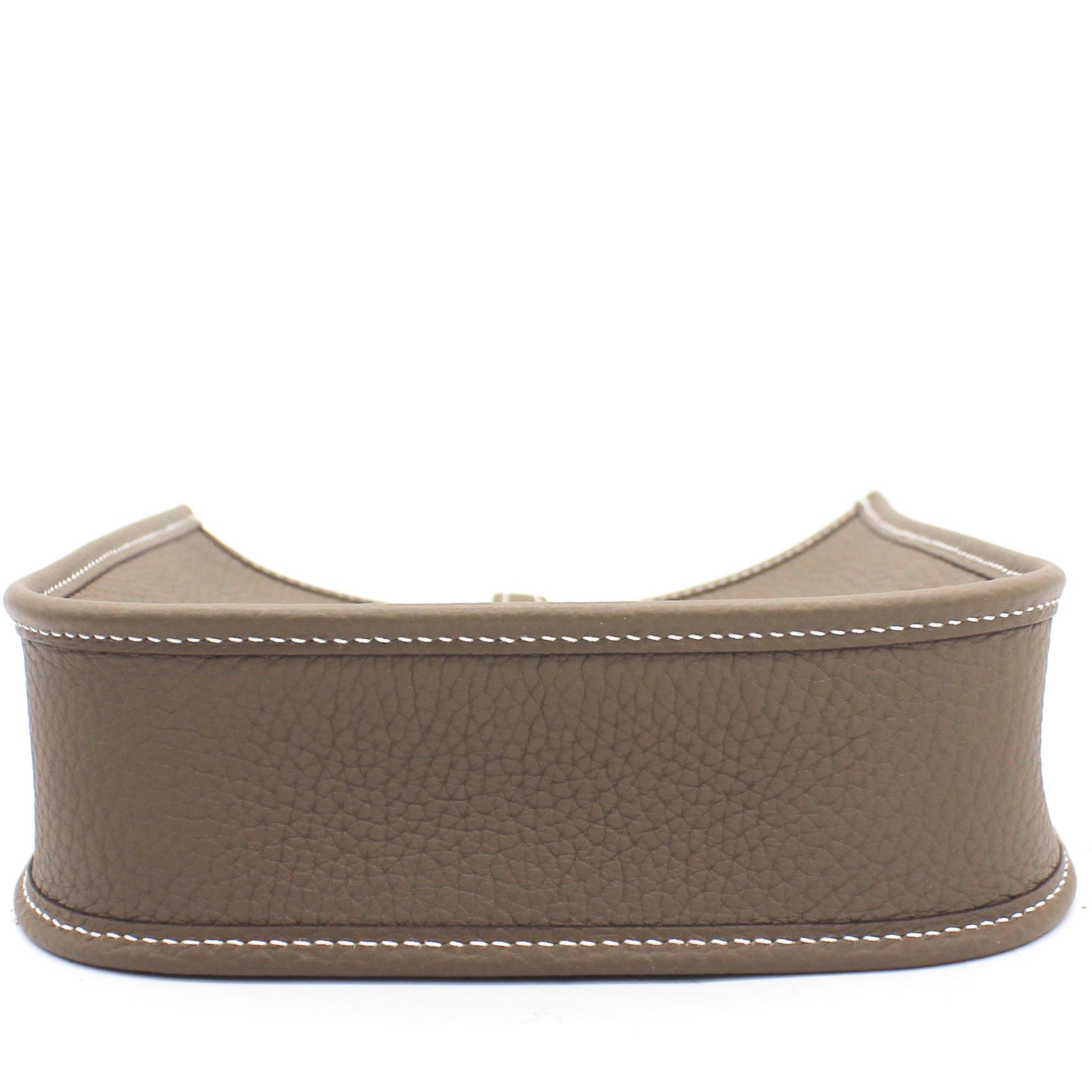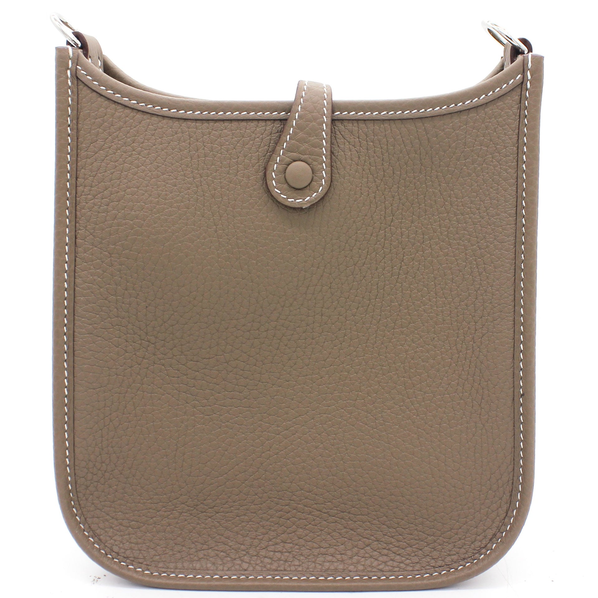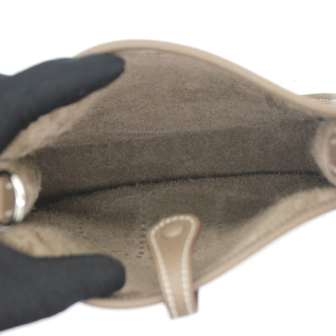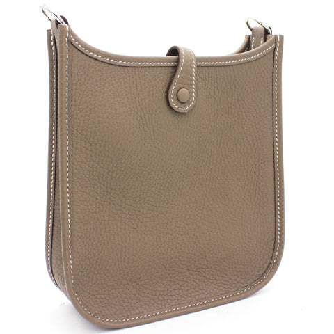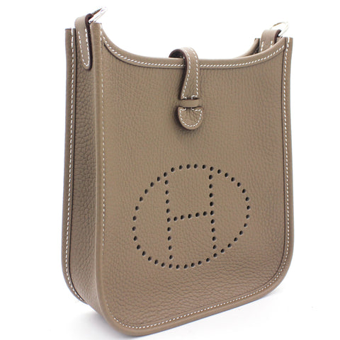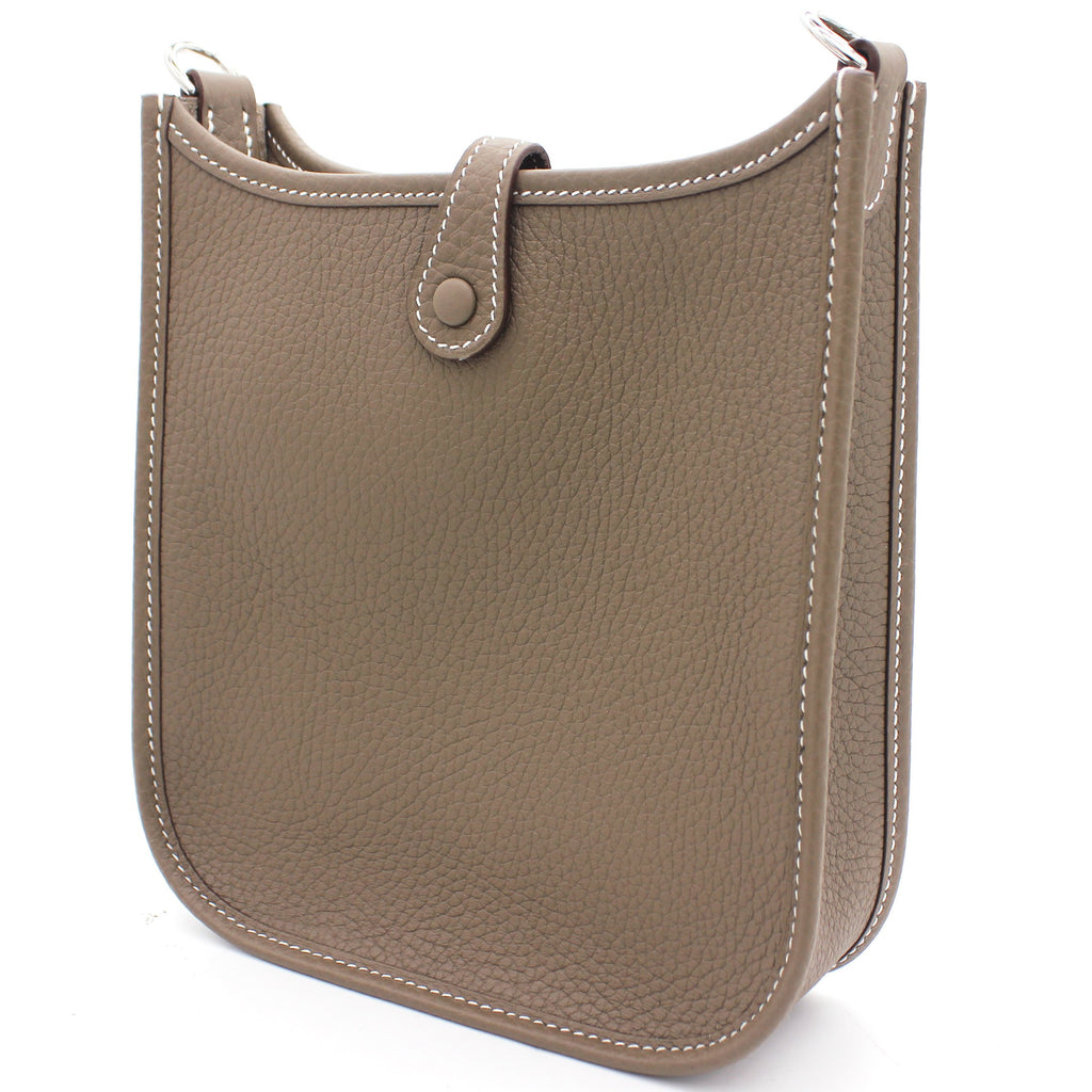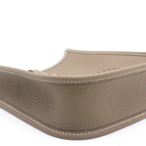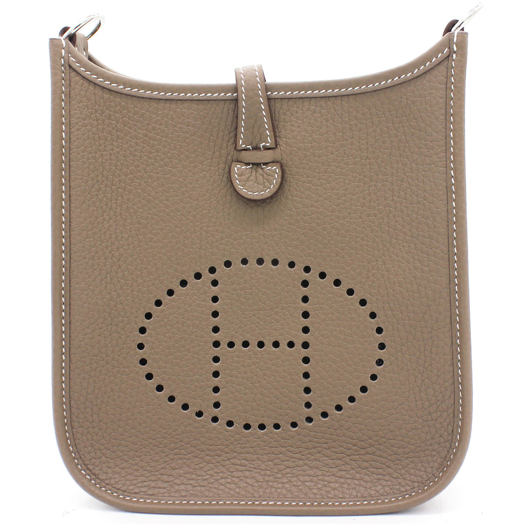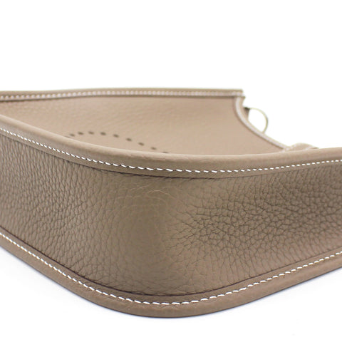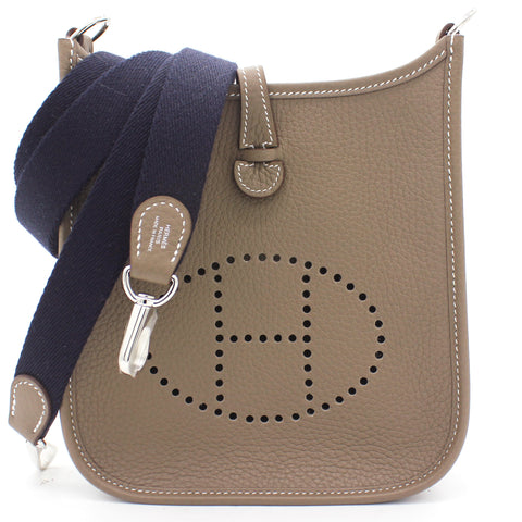 The perfect bag for the woman on the go. Crafted from etoupe leather, this Hermès mini Evelyne TPM shoulder bag is that kind of bag you throw in your essentials and just forget you've been carrying it around. Showcasing the lovely H logo in punch holes on the front, it has a navy fabric detachable shoulder strap. Minimalism and comfort walking together. Featuring silver-tone hardware, a strap closure, a detachable shoulder strap, no lining and a perforated H logo to the front.