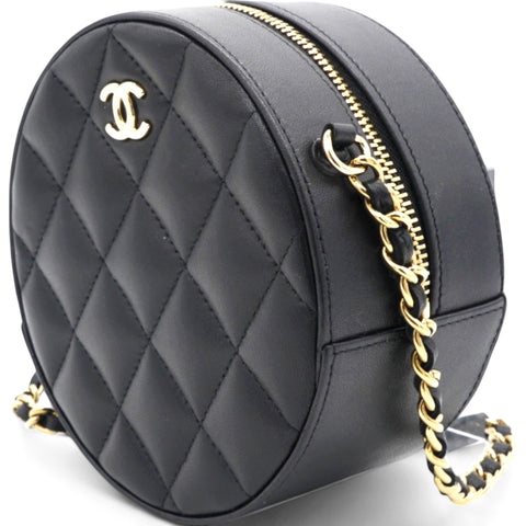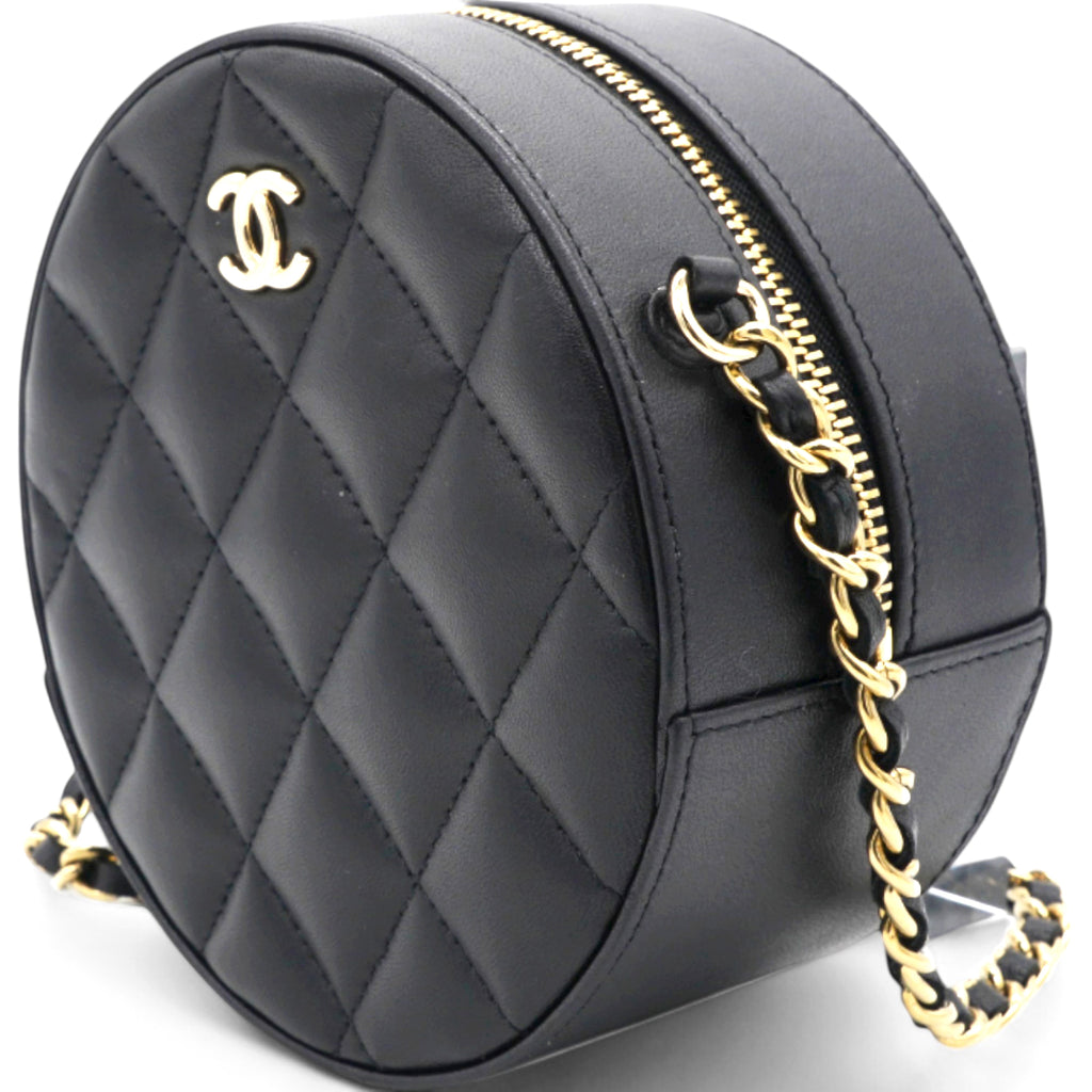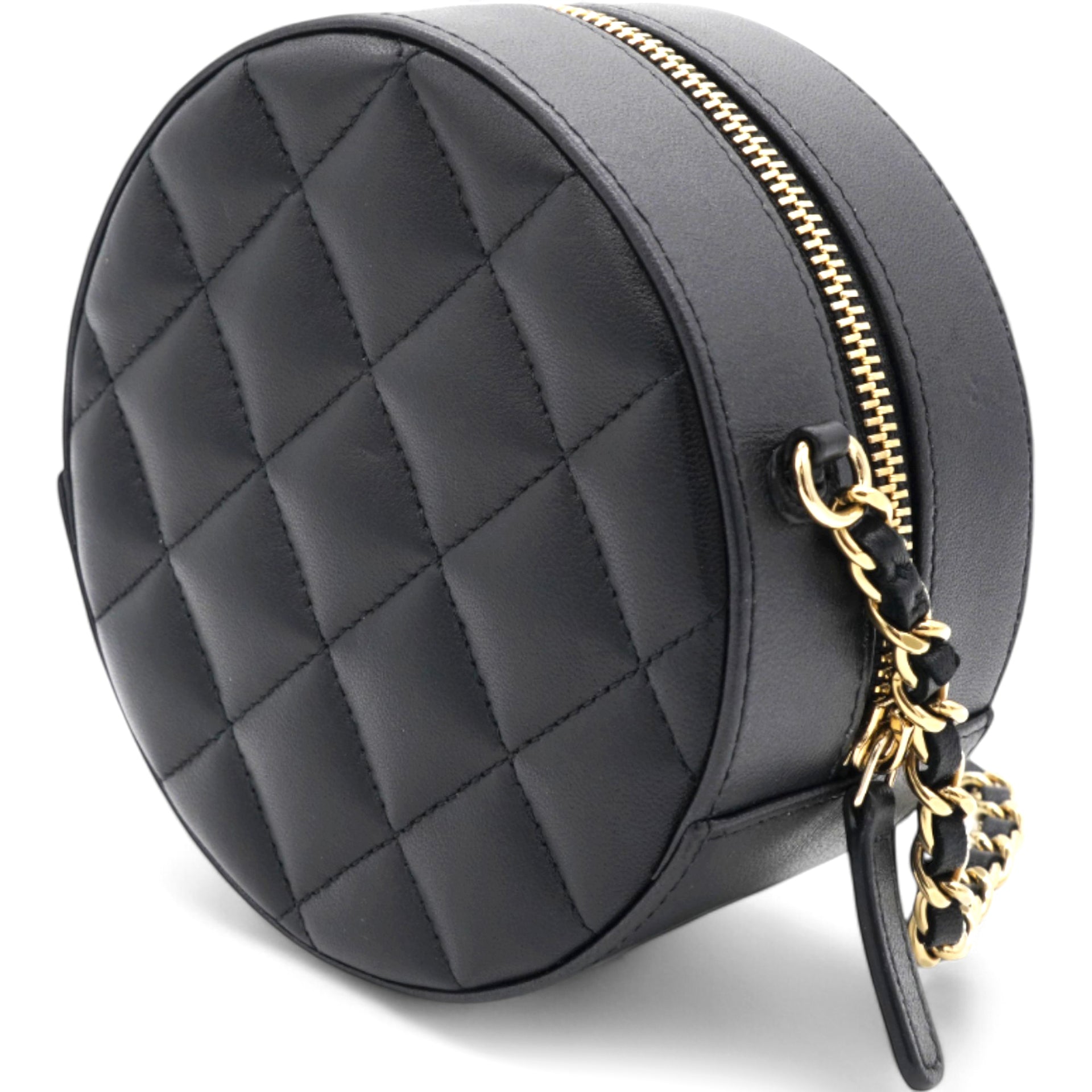 This adorable crossbody is crafted of luxurious lambskin leather in black. The bag features a leather threaded gold chain-link shoulder strap. The handbag features two 3/4 wrap-around zipper that opens to a black fabric interior. This is a stylish mini shoulder bag for all of your needs, from Chanel!