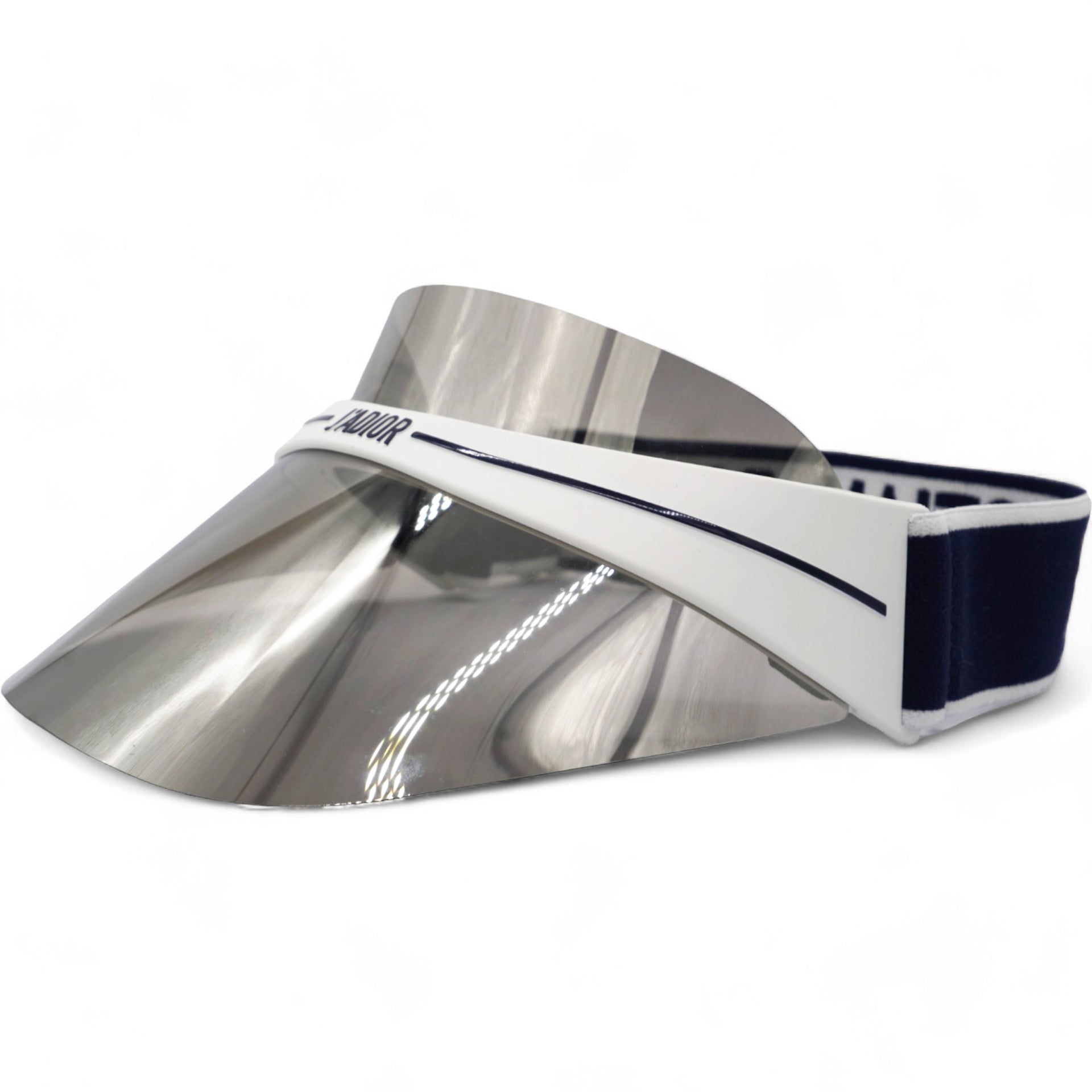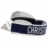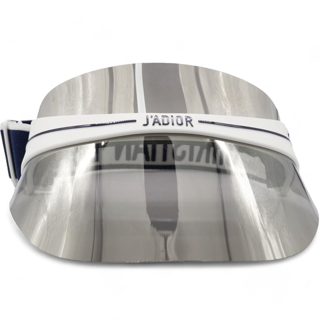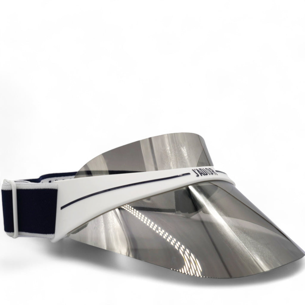 This ultra-chic visor has a white frame with J'Adior logo in navy blue across the front. The visor stays on with an elastic black and white band featuring the Christian Dior name.