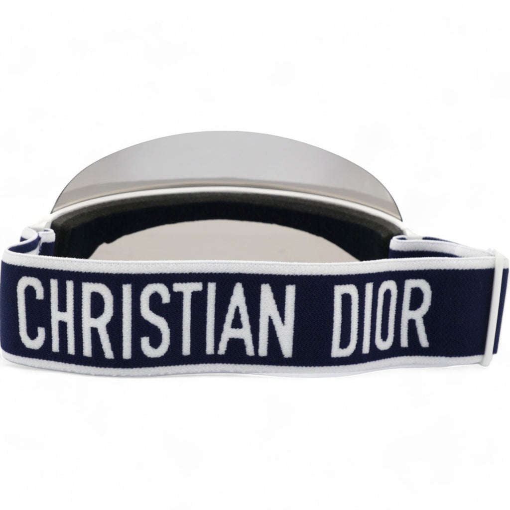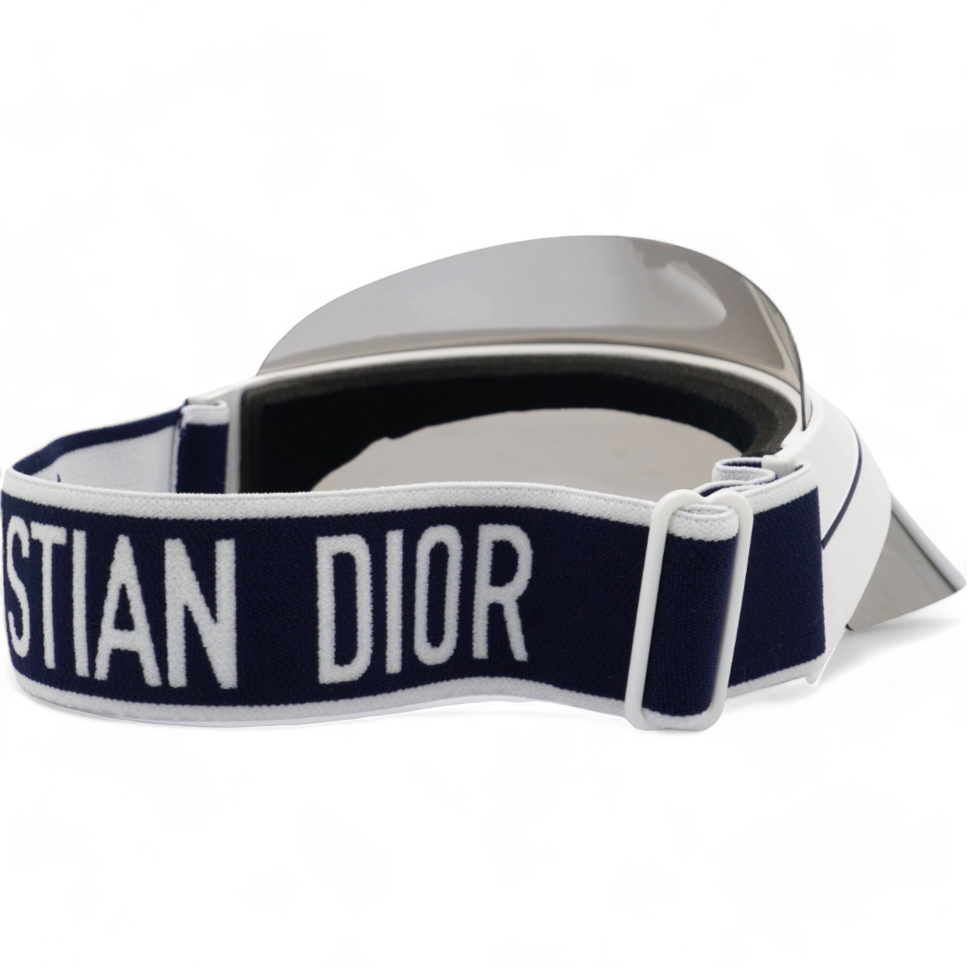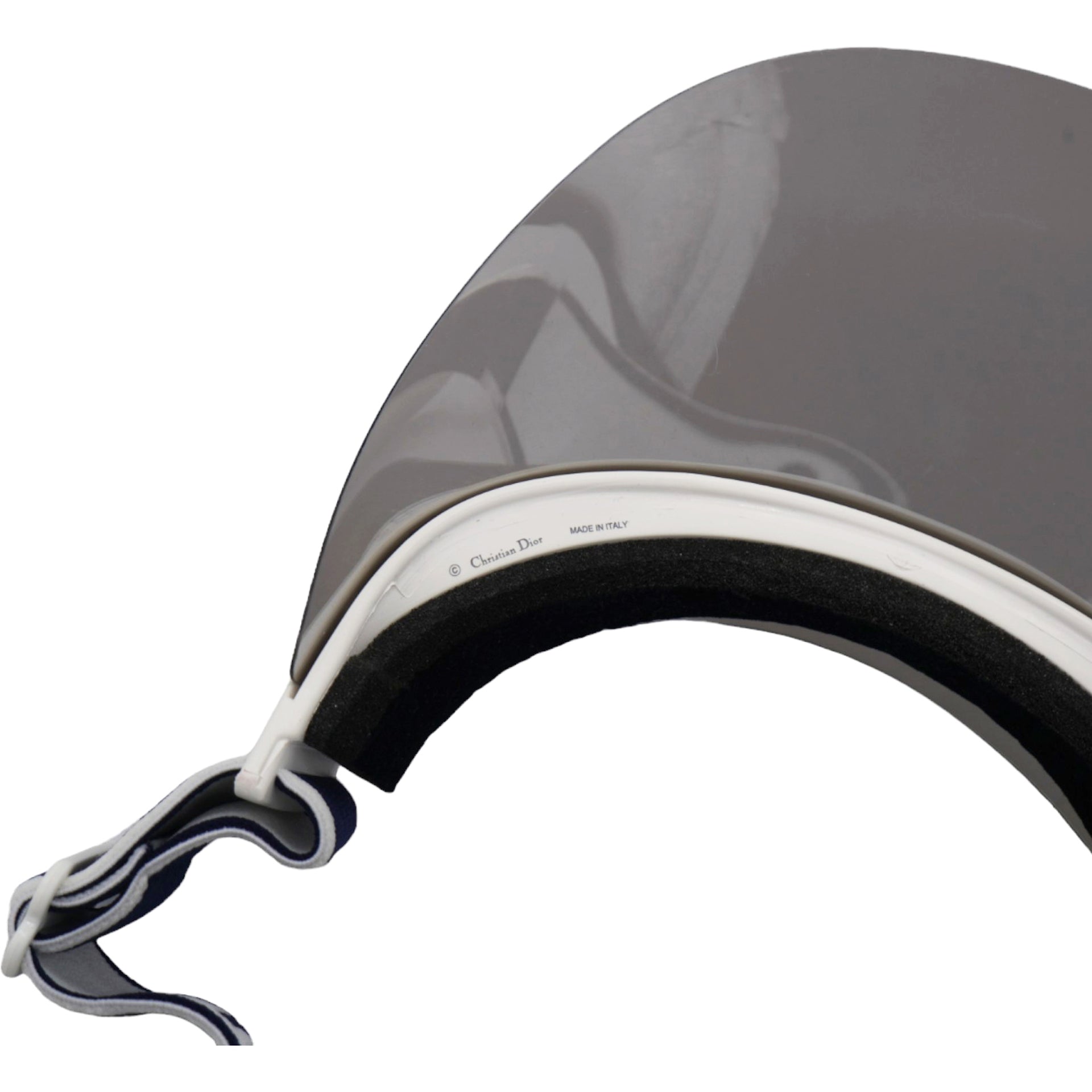 This ultra-chic visor has a white frame with J'Adior logo in navy blue across the front. The visor stays on with an elastic black and white band featuring the Christian Dior name.