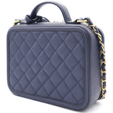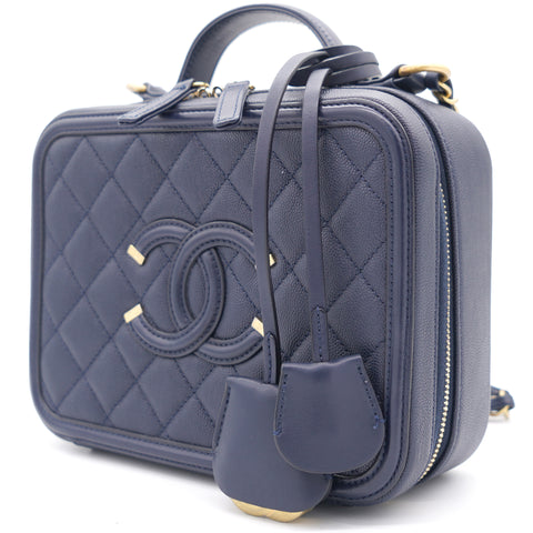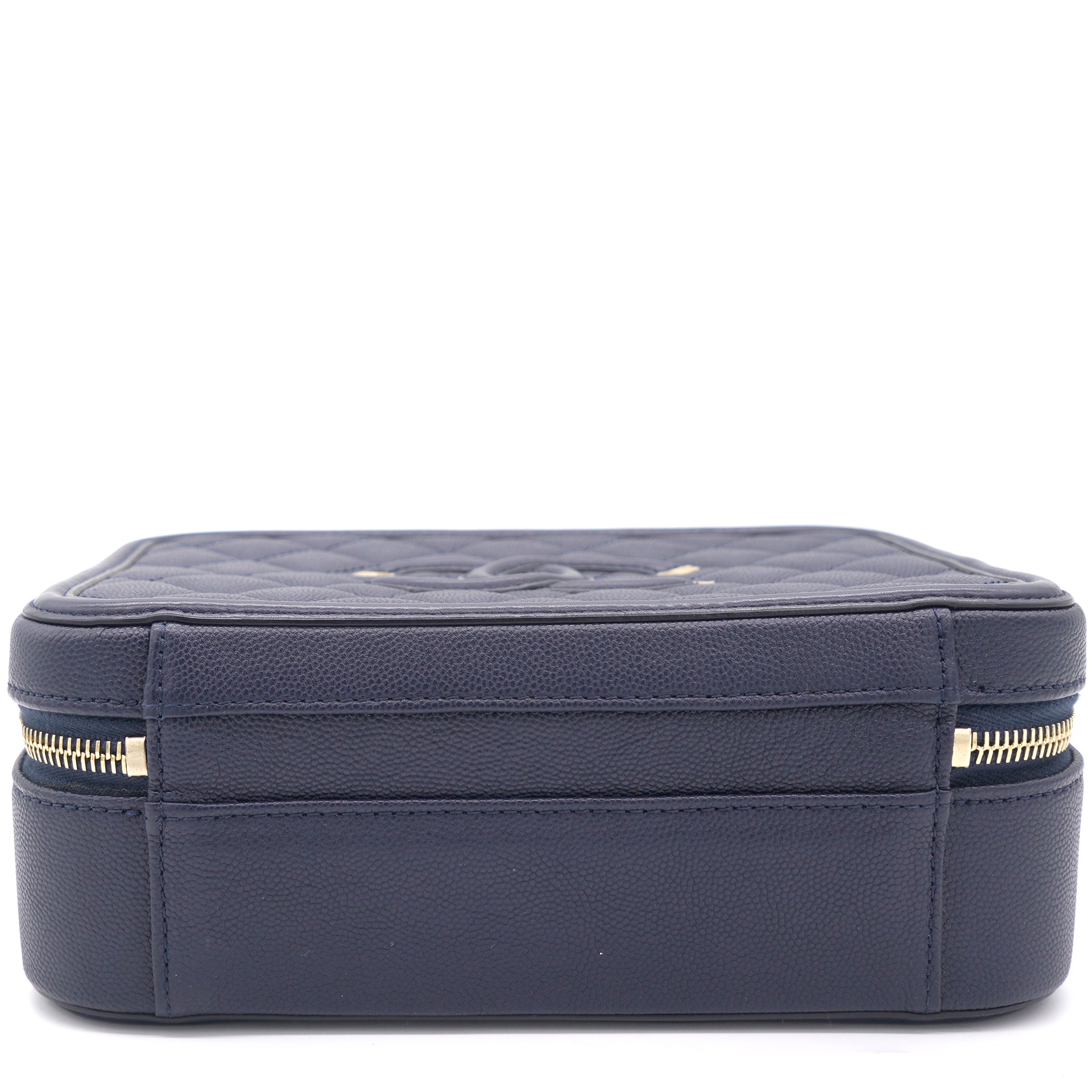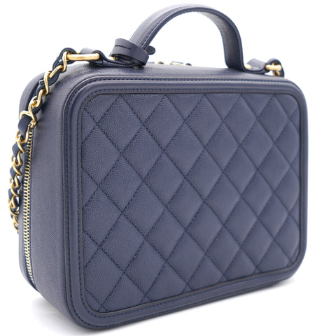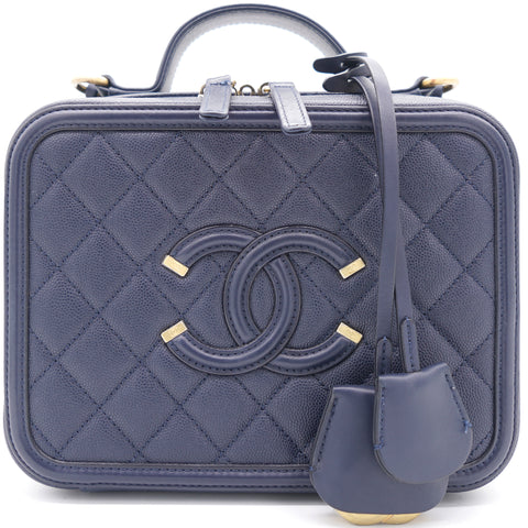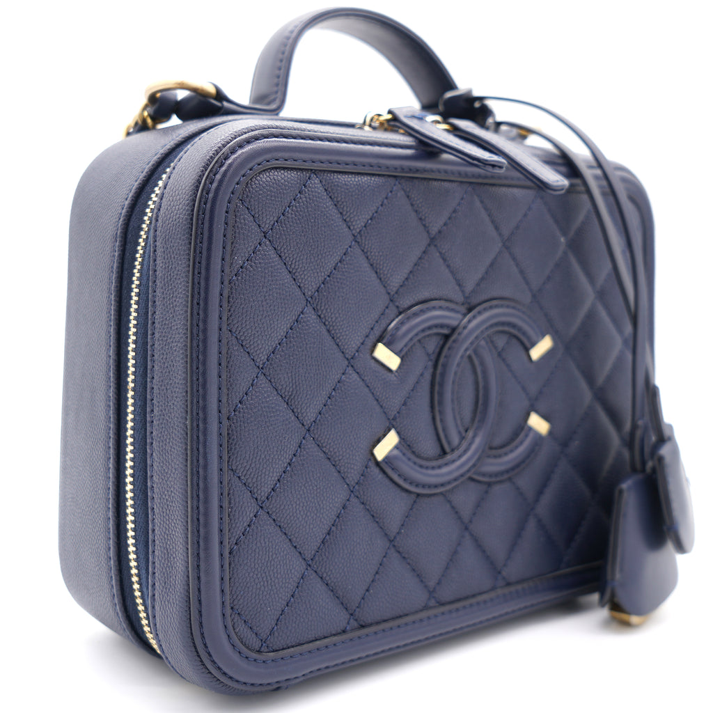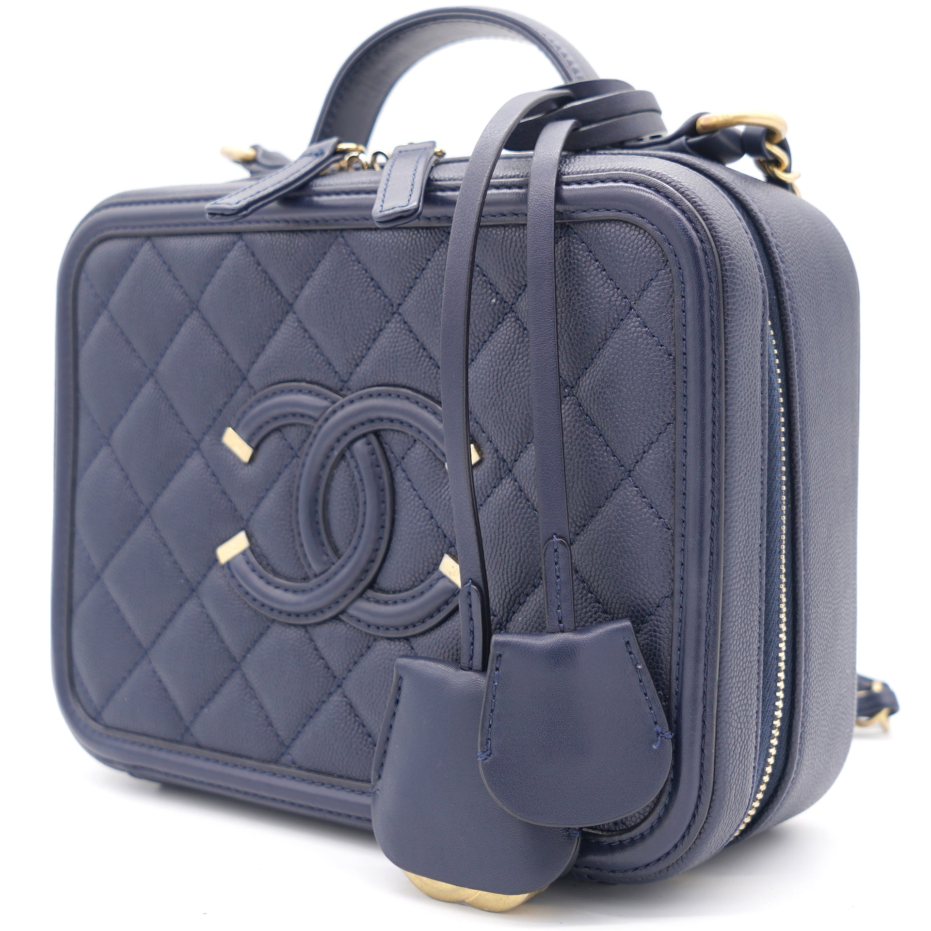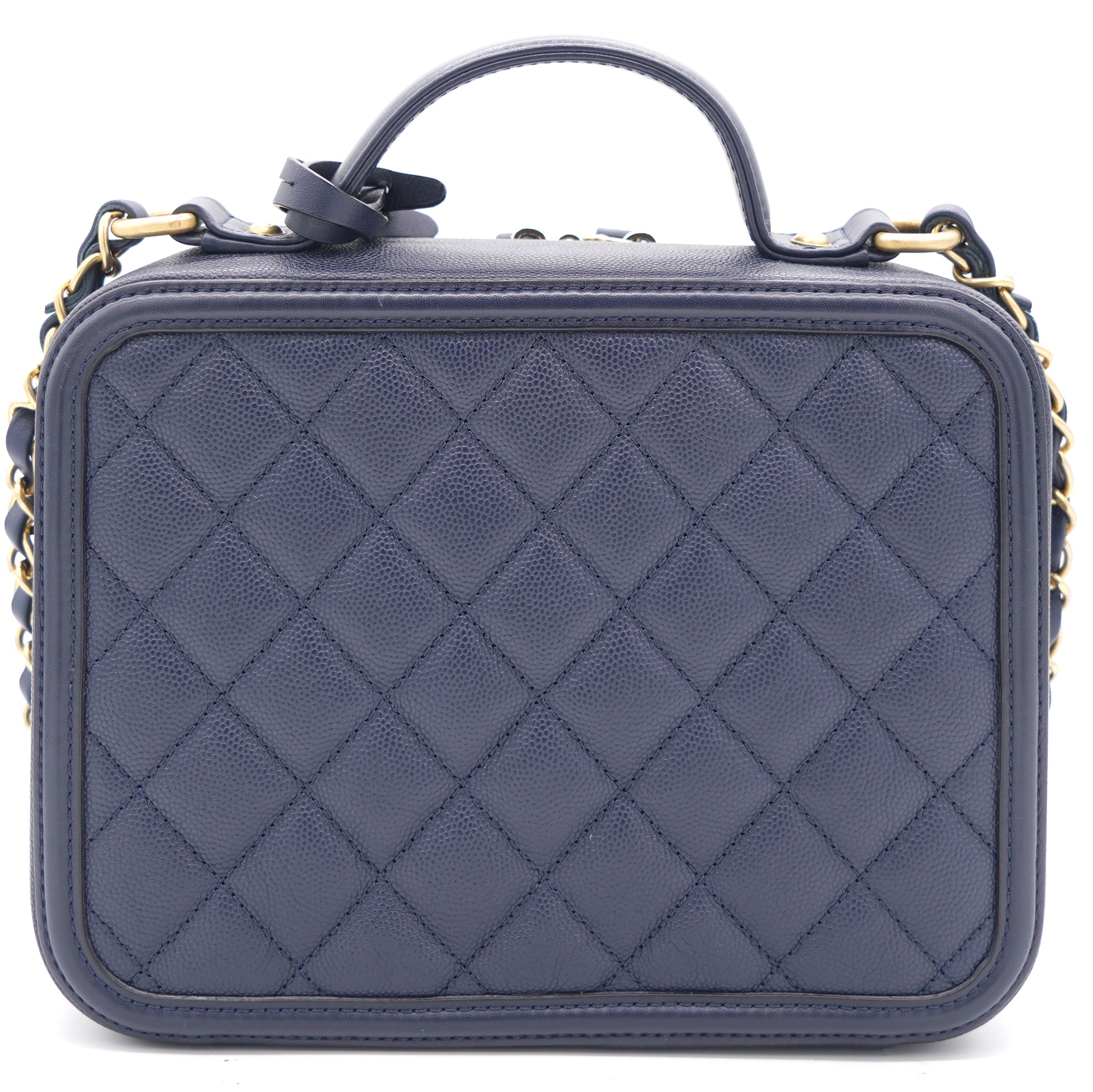 | It really does take a few seconds to believe that there could be anything as chic as this Vanity case bag from Chanel! The bag is perfect for your fashion arsenal, bringing along the iconic CC logo on the exterior, an interwoven leather-chain strap, the signature quilts, and a sturdy handle on top. It is crafted from leather and equipped with a zip-around that reveals a compact interior. |
