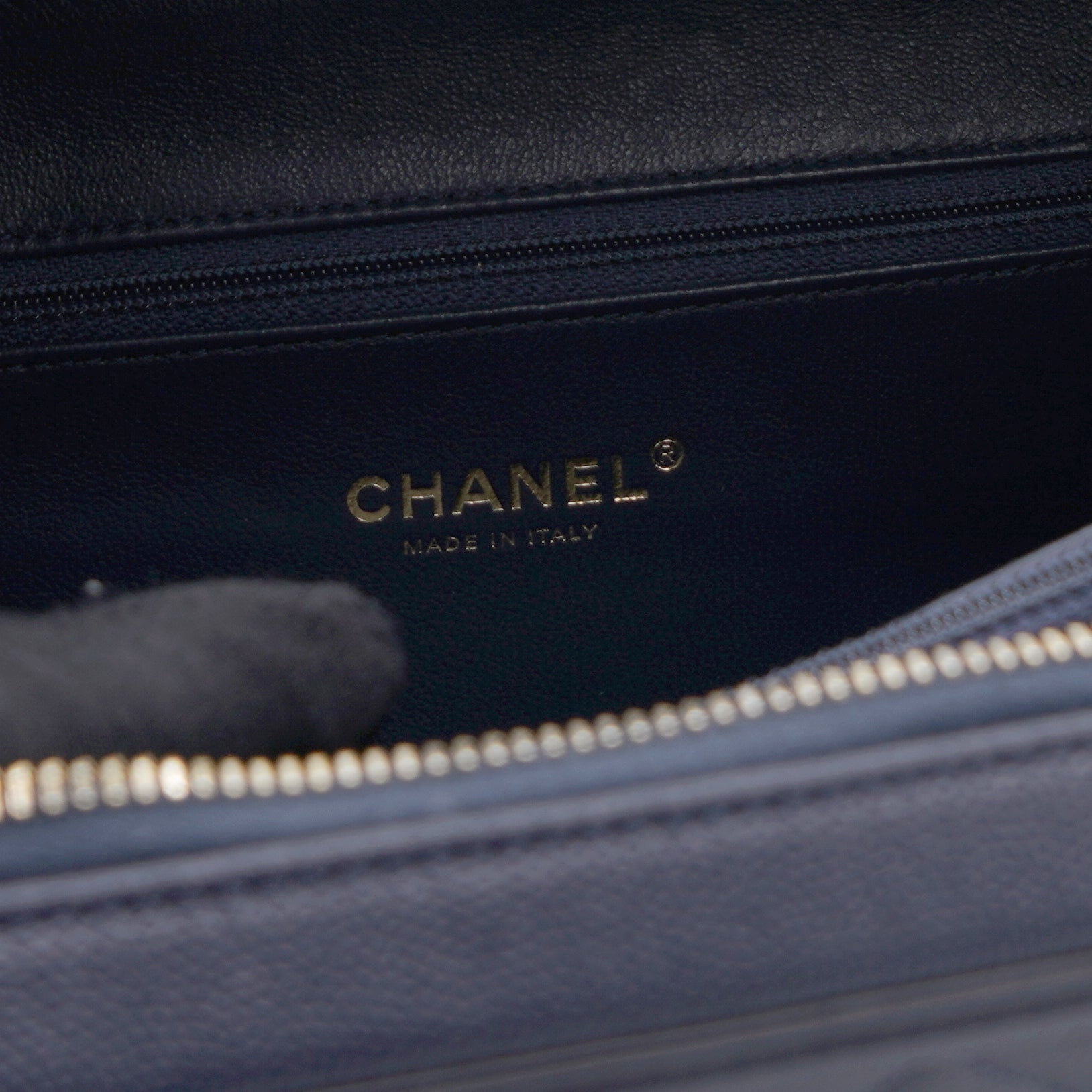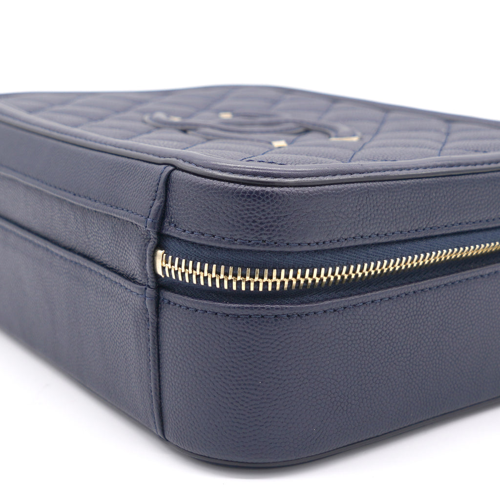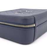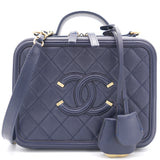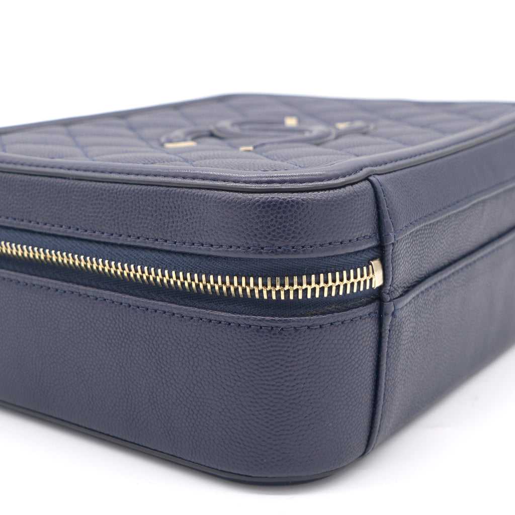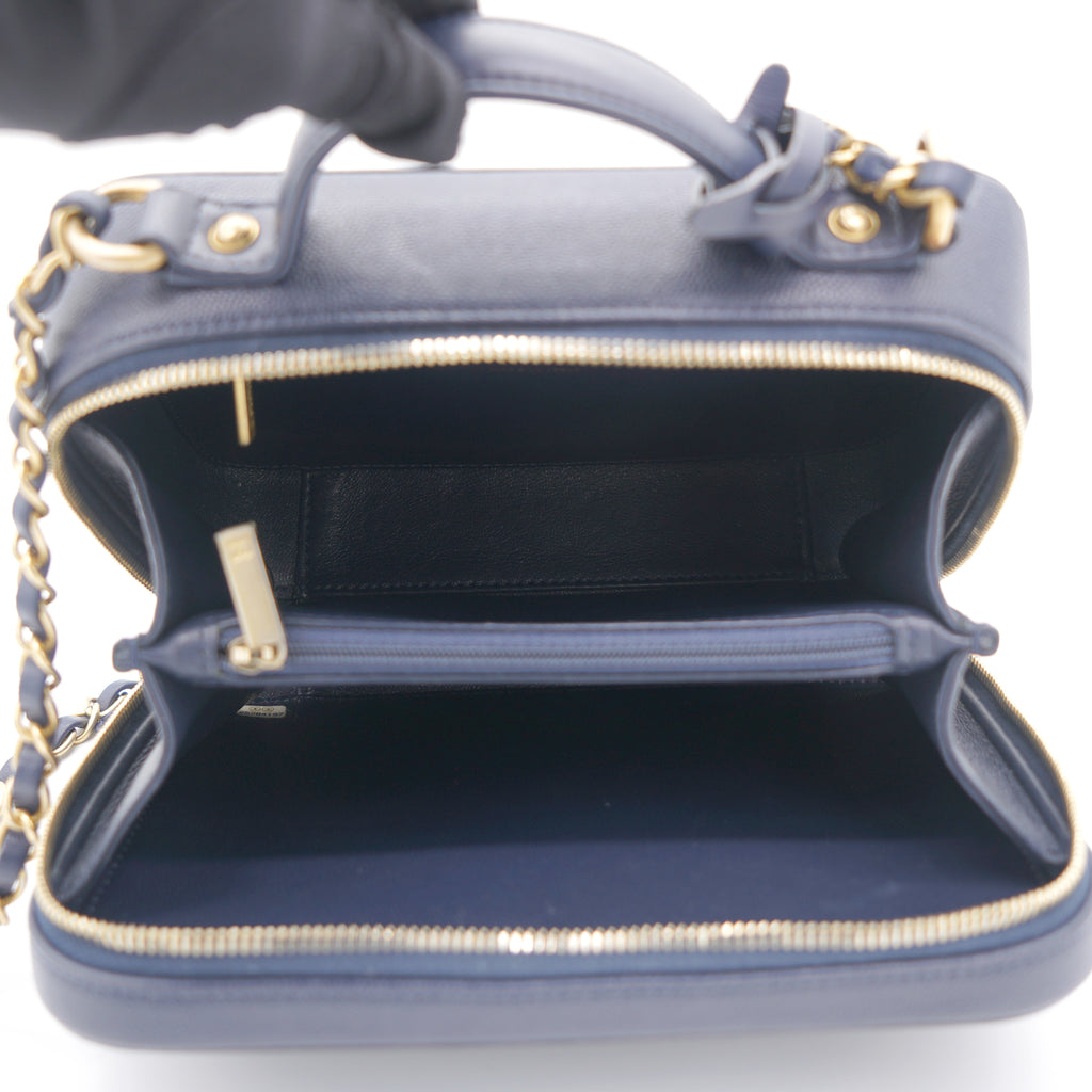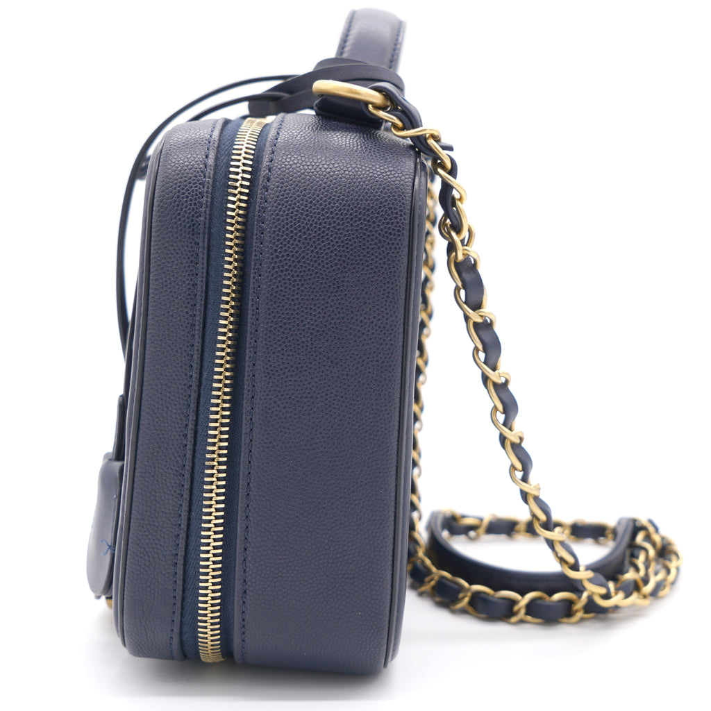 | It really does take a few seconds to believe that there could be anything as chic as this Vanity case bag from Chanel! The bag is perfect for your fashion arsenal, bringing along the iconic CC logo on the exterior, an interwoven leather-chain strap, the signature quilts, and a sturdy handle on top. It is crafted from leather and equipped with a zip-around that reveals a compact interior. |