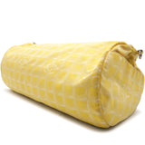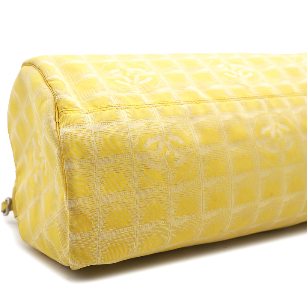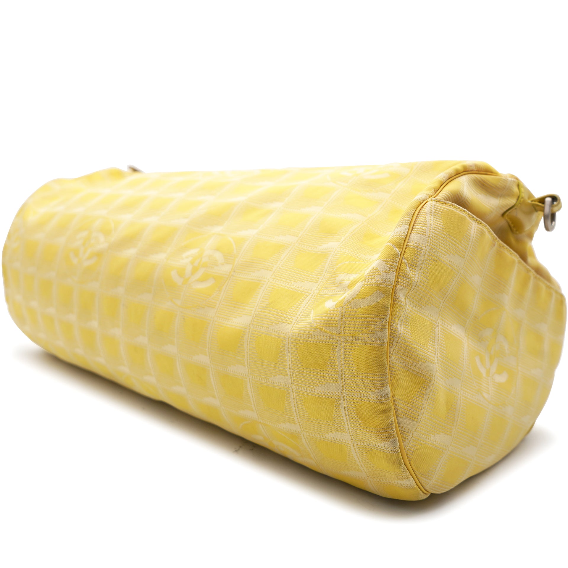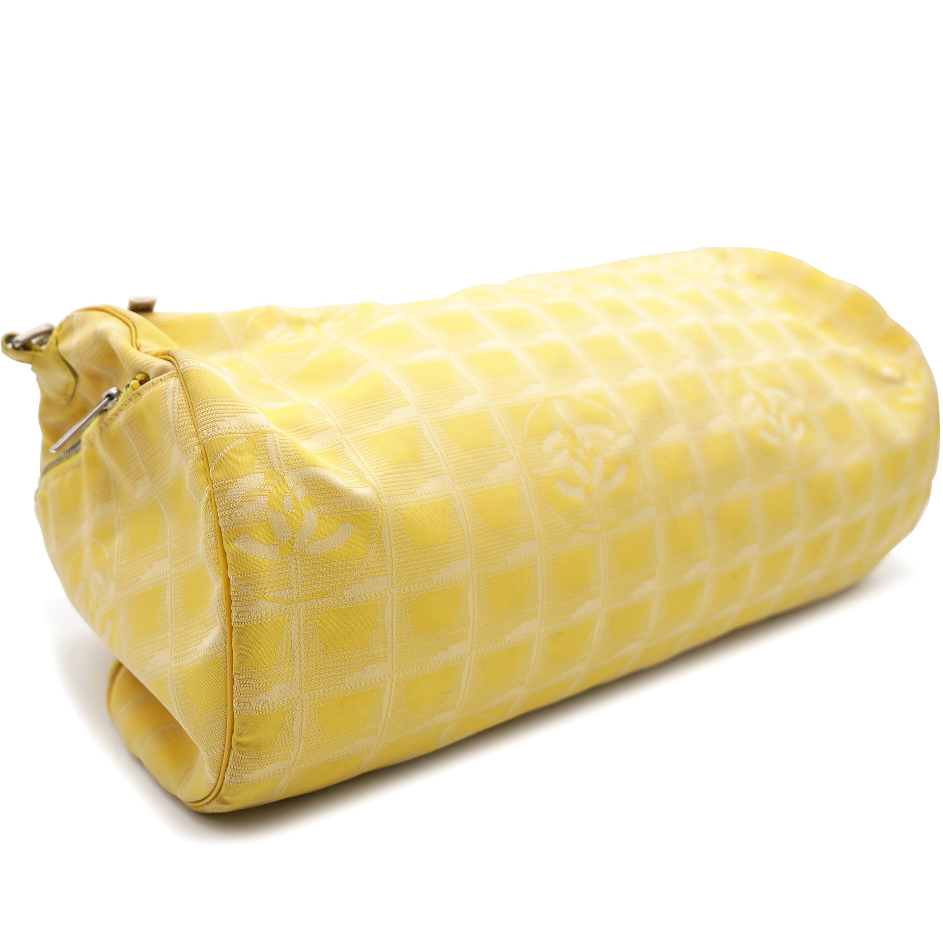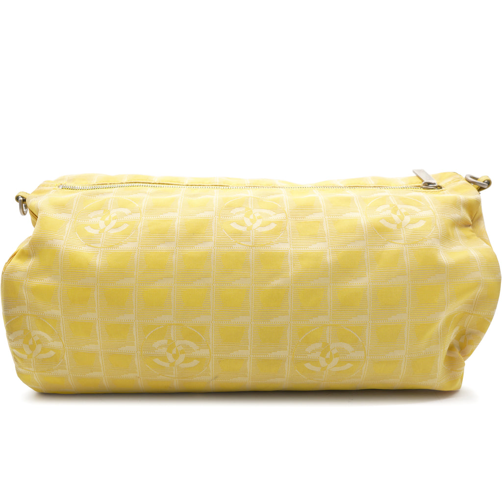 | This casual crossbody bag is beautifully created of fine nylon jacquard in yellow. The bag features a textile shoulder strap and Chanel CC logo impressions across the bag. The top is open to a nylon interior with zipper pockets. |