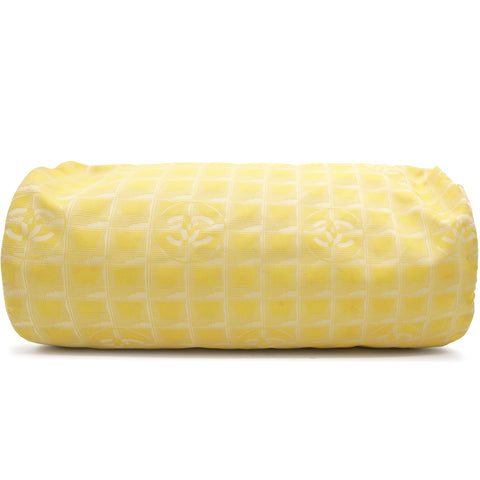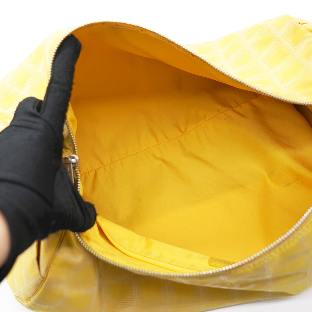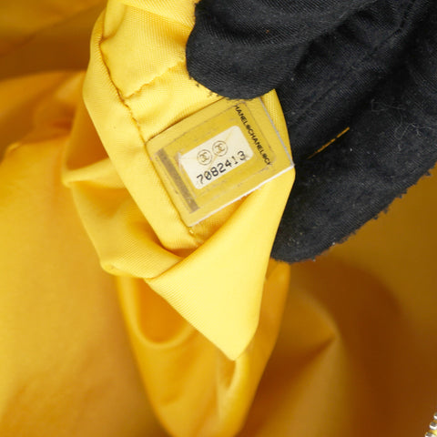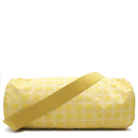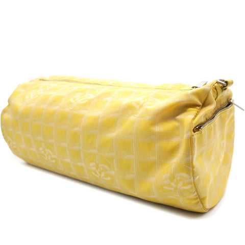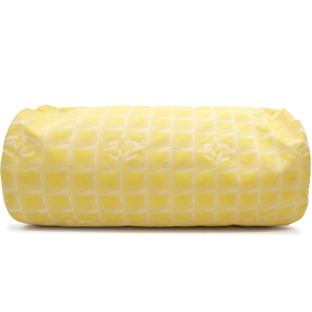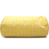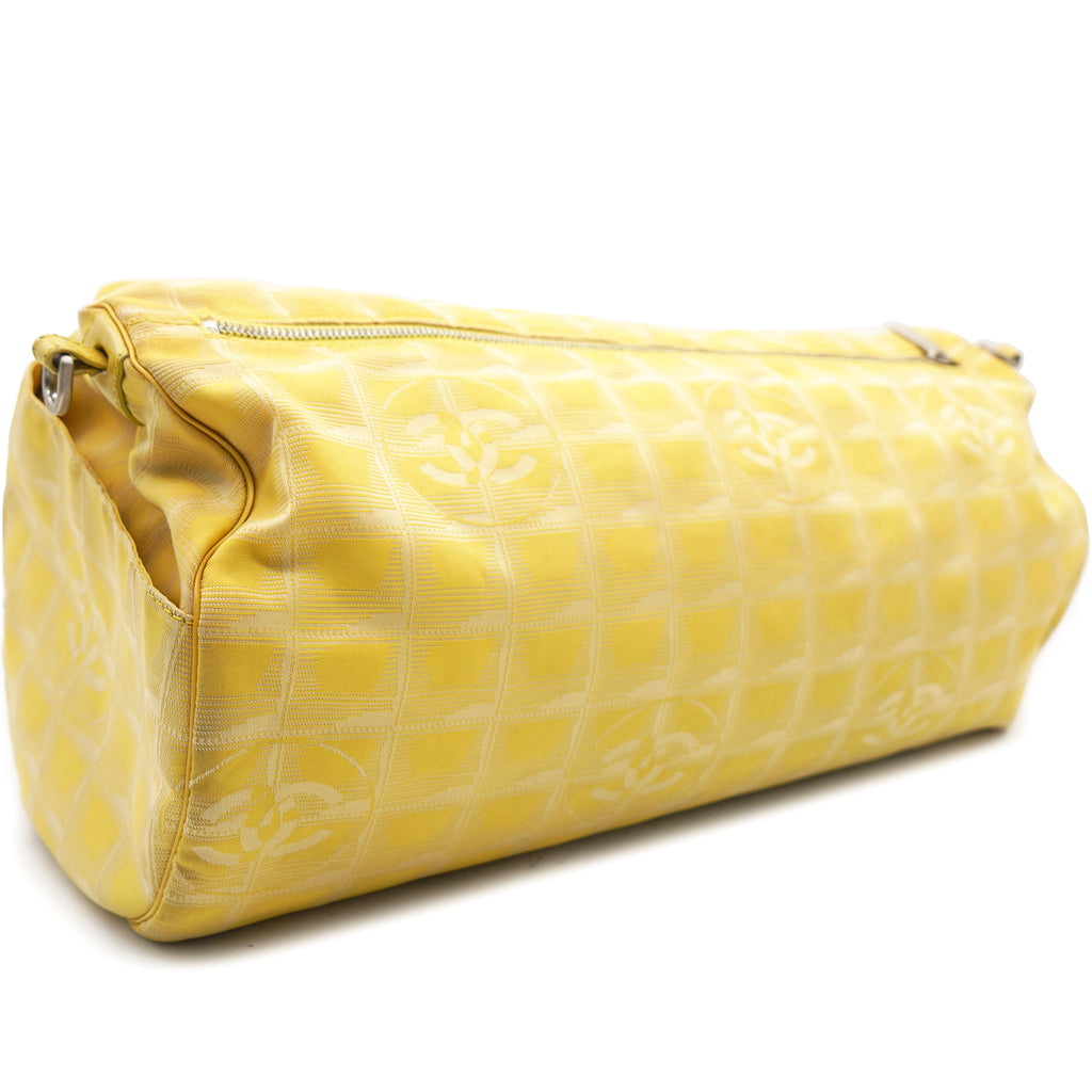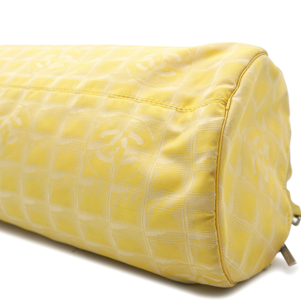 | This casual crossbody bag is beautifully created of fine nylon jacquard in yellow. The bag features a textile shoulder strap and Chanel CC logo impressions across the bag. The top is open to a nylon interior with zipper pockets. |