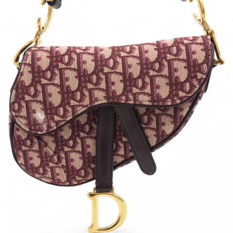 This saddlebag is made of burgundy on beige Dior monogram canvas. The bag features burgundy cowhide leather trim including a looping top handle and brass hardware. The flap opens to a beige fabric interior with a pocket.