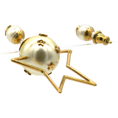 | These trendy earrings feature a small faux pearl set on a gold star metal hoop; one featuring a star and the other the CD logo motif. |