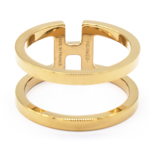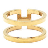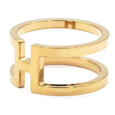 | This chic scarf ring is crafted of gold plated brass. The scarf ring features an H design for a decorative and stylish look to your Hermes scarf. |