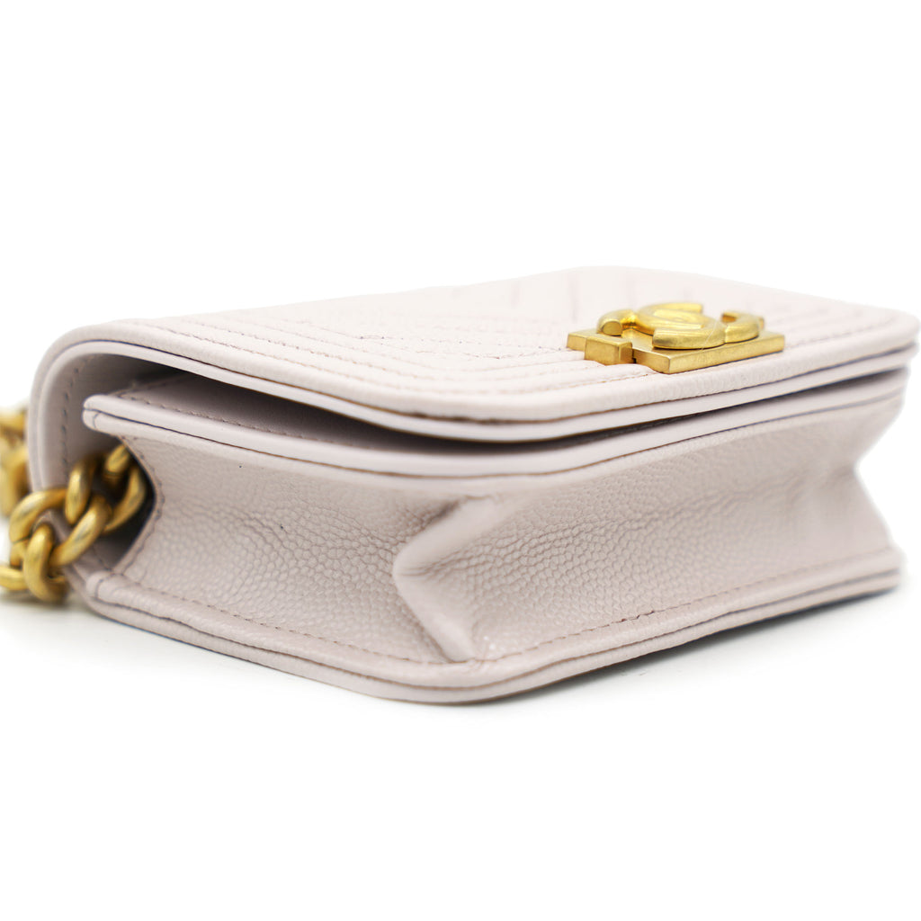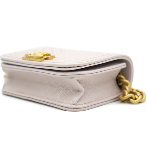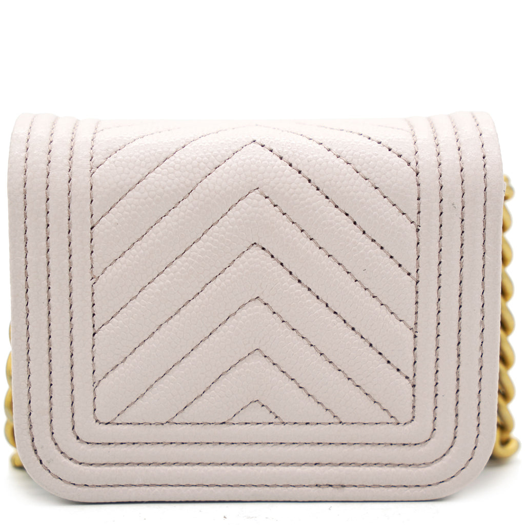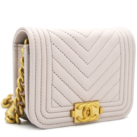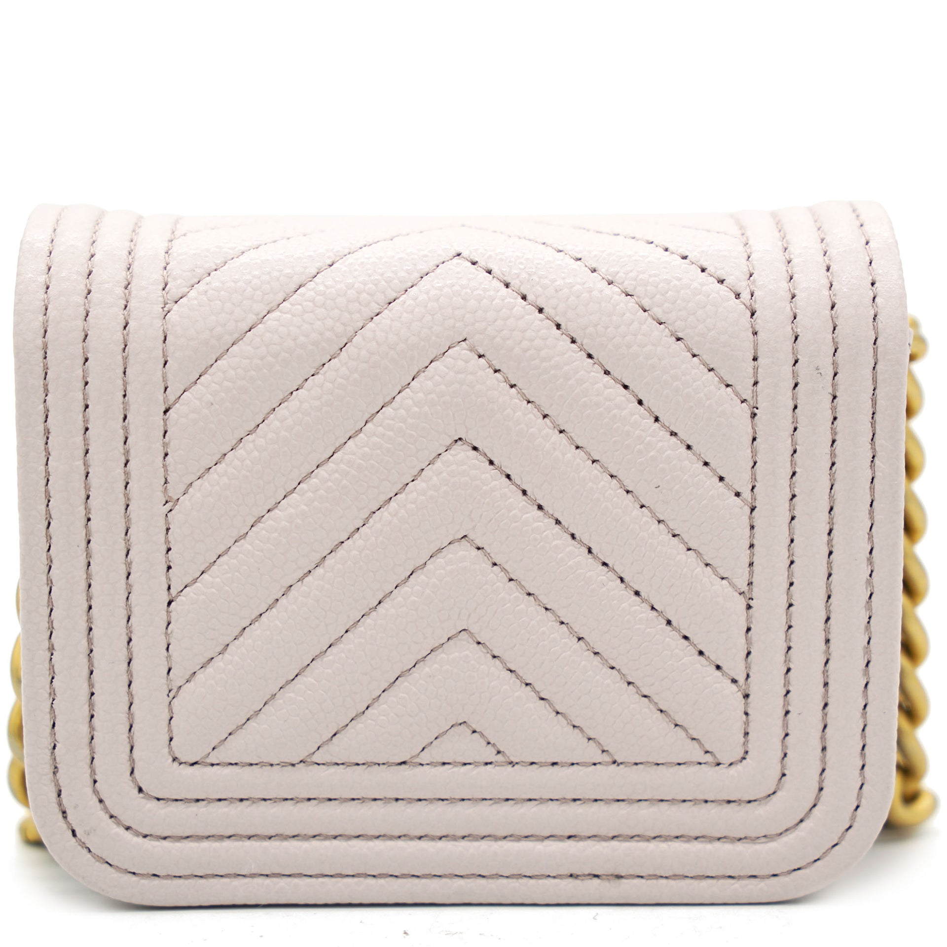 | This cardholder from Chanel is absolutely gorgeous to look at! Crafted from caviar leather in pink, it features the signature quilts, the Boy CC logo on the front flap, and an intertwined chain link for you to parade it in style. Organize your essentials in style with this beautiful creation. |