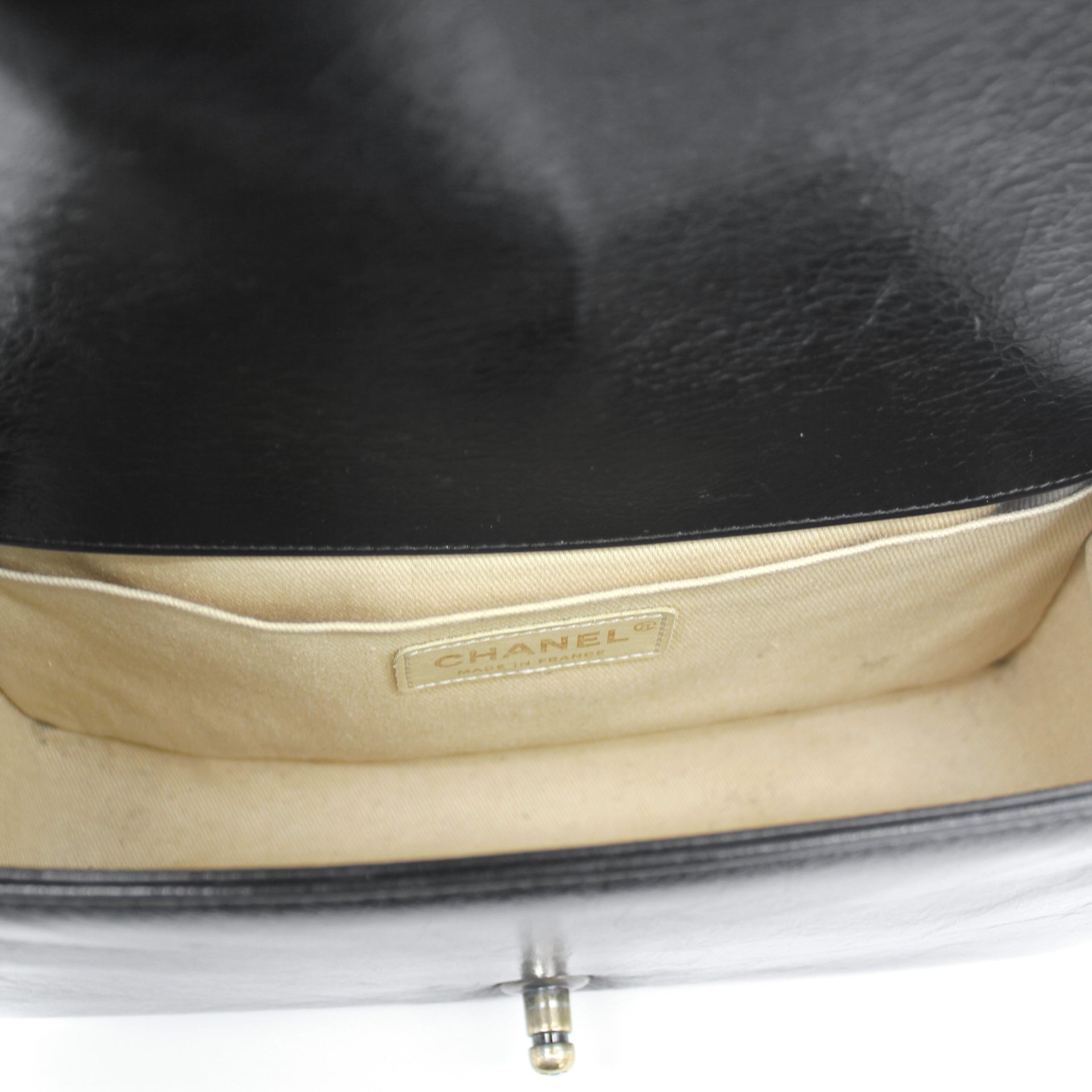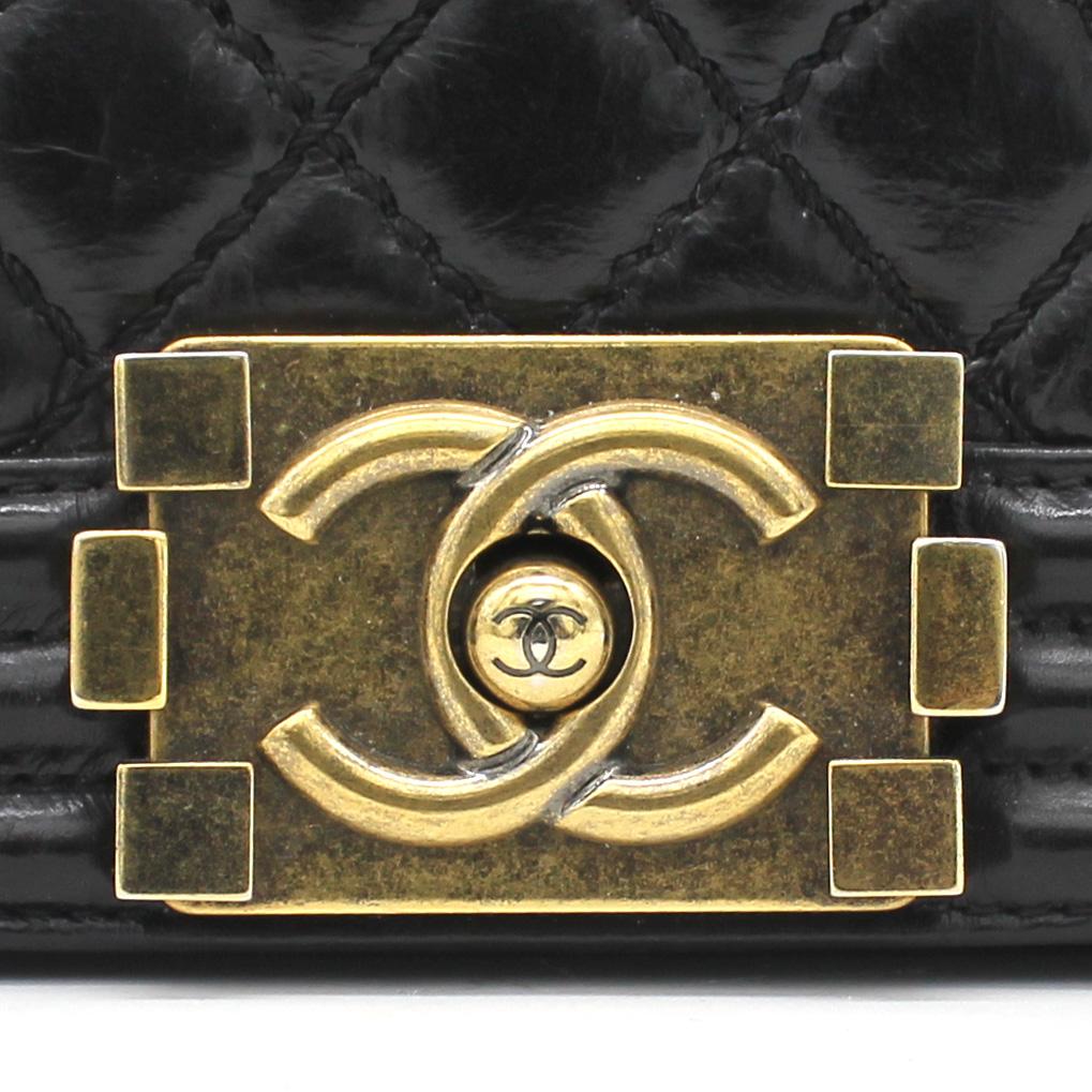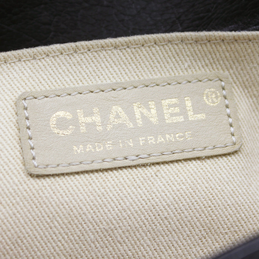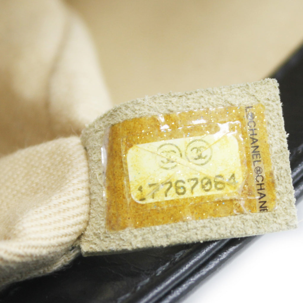 Exterior Material: Glazed Black quilted leather with gold-tone hardware, chain-link shoulder strap and CC push-lock closure at front flap. Interior Material: Beige fabric lining with one main compartment and one single slip pocket at wall. Accessories: Dust Bag;