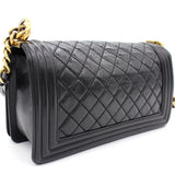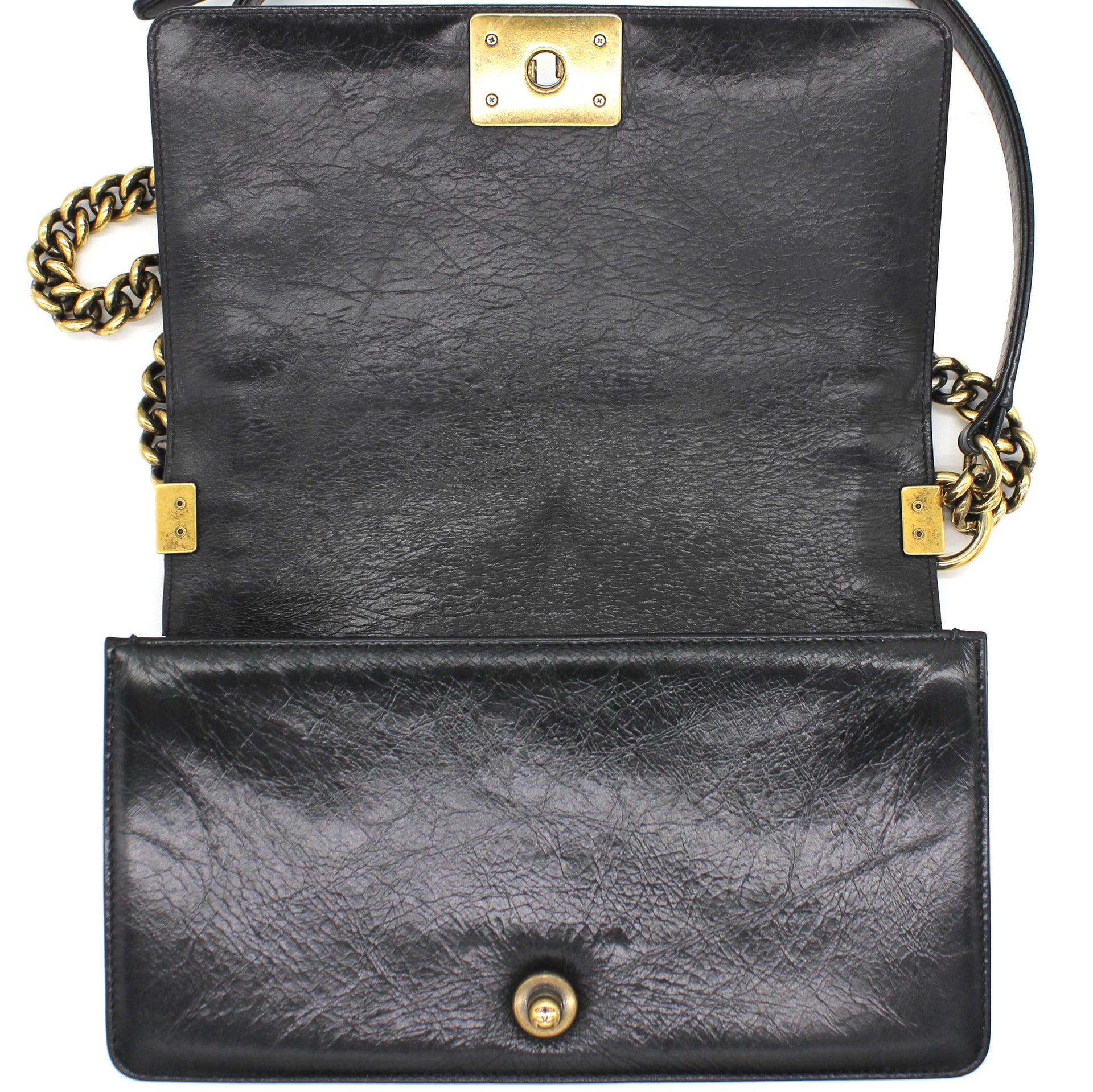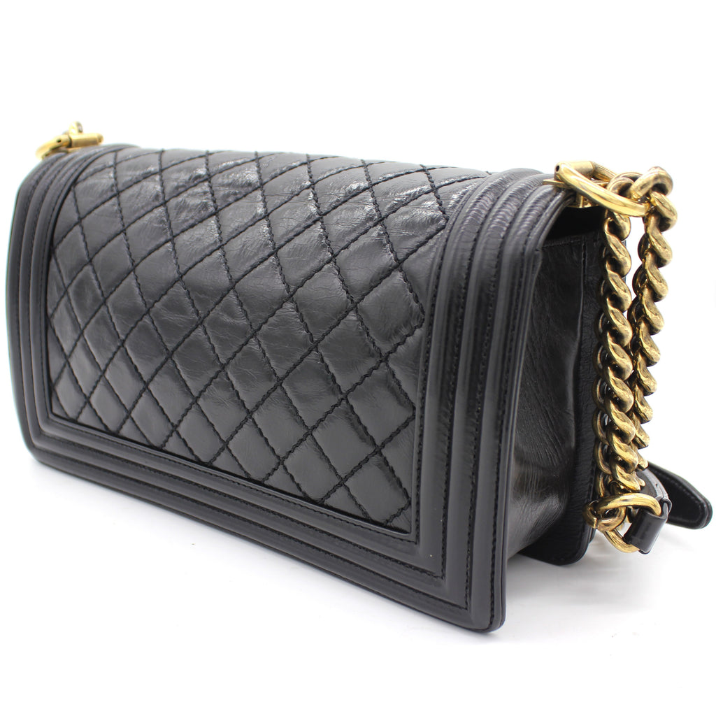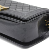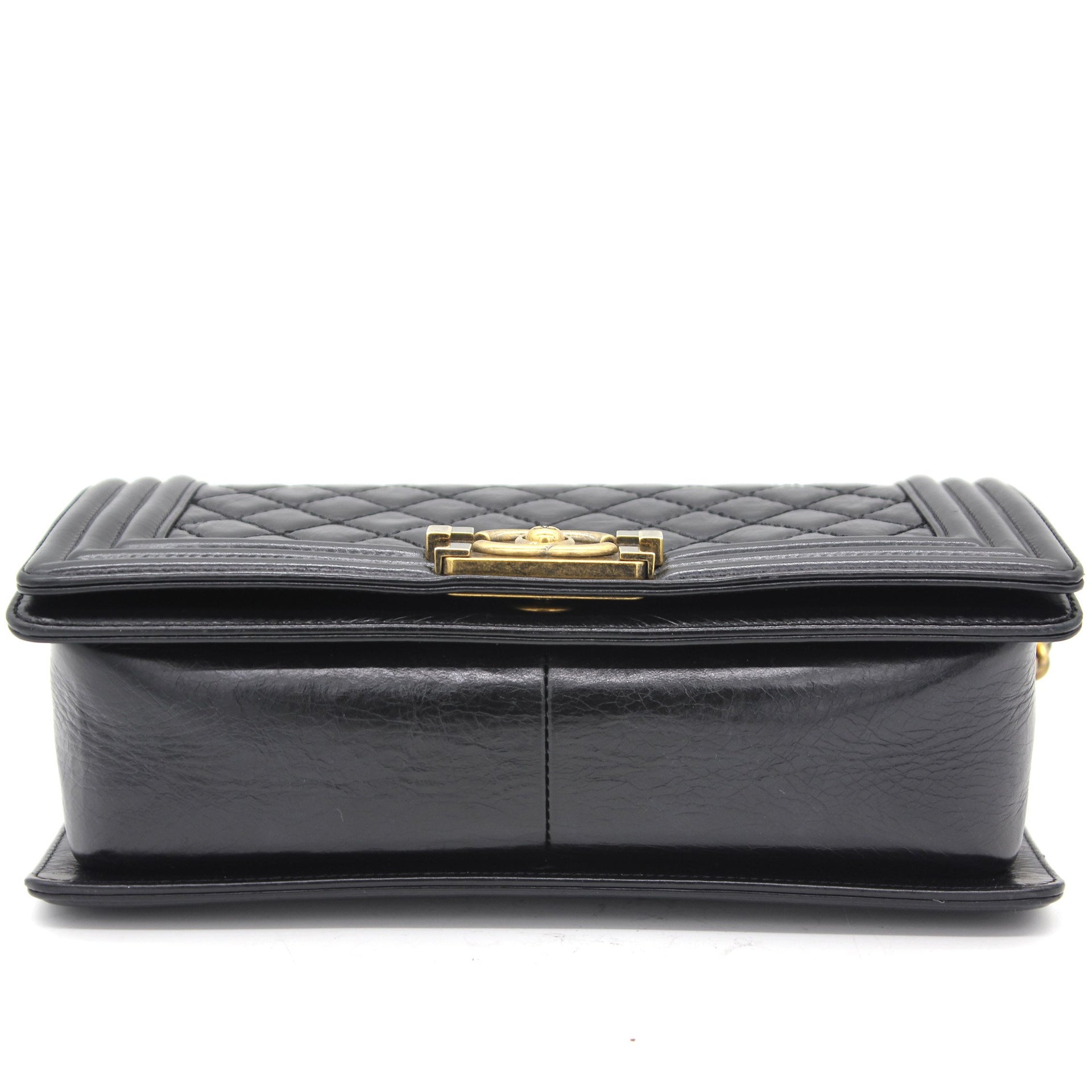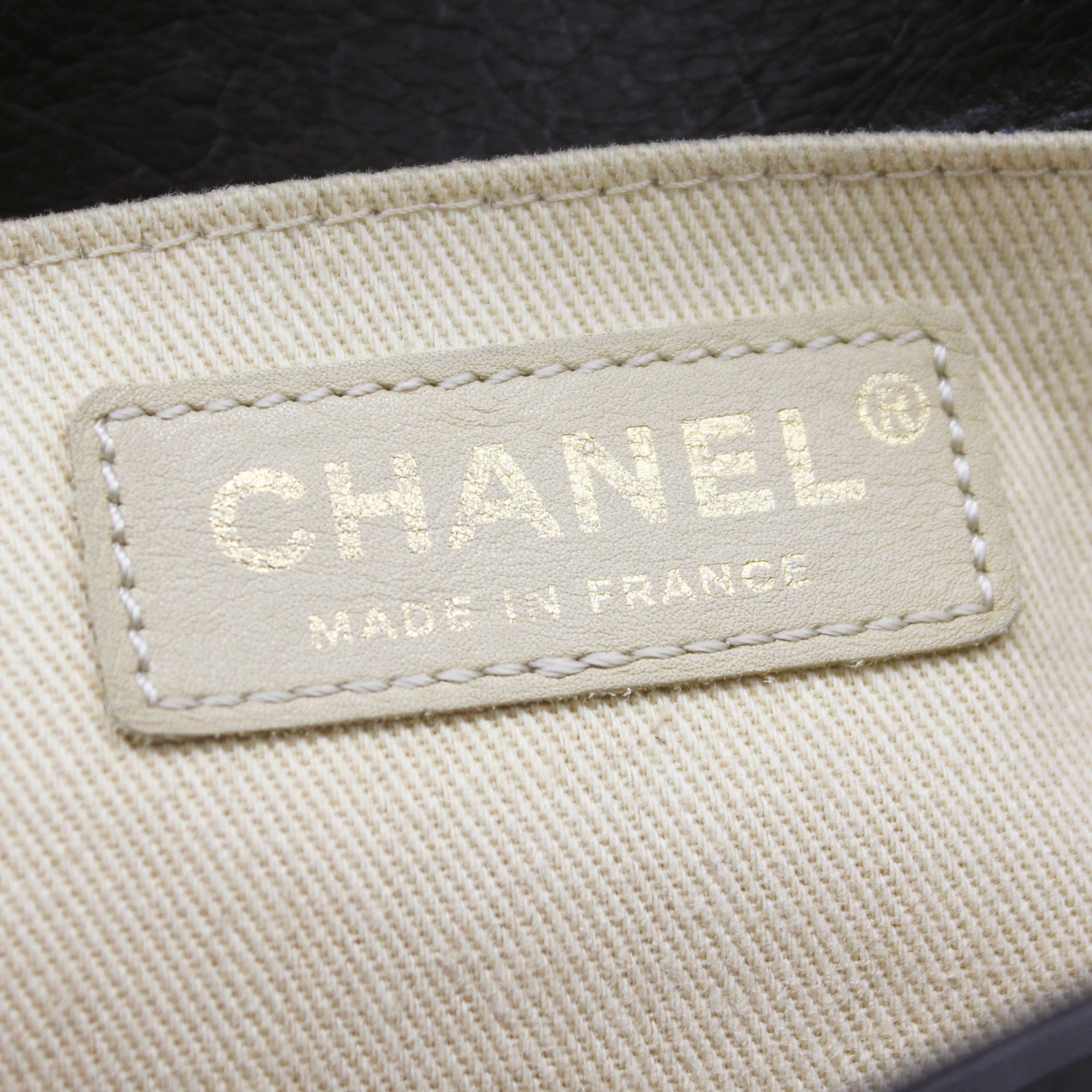 Exterior Material: Glazed Black quilted leather with gold-tone hardware, chain-link shoulder strap and CC push-lock closure at front flap. Interior Material: Beige fabric lining with one main compartment and one single slip pocket at wall. Accessories: Dust Bag;