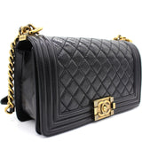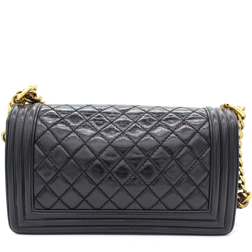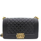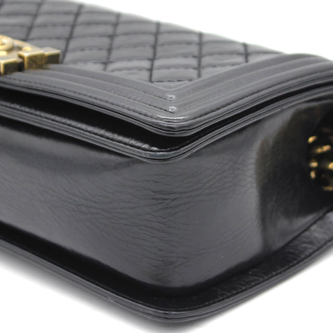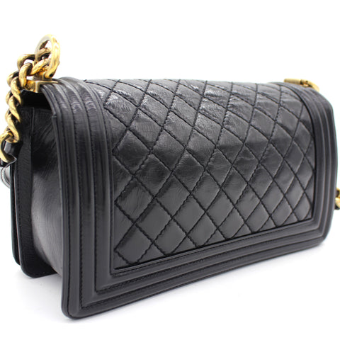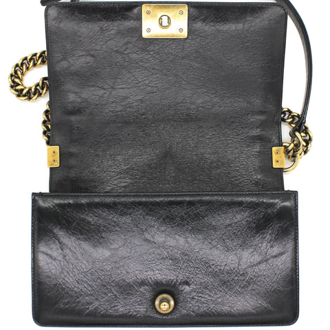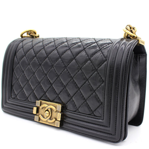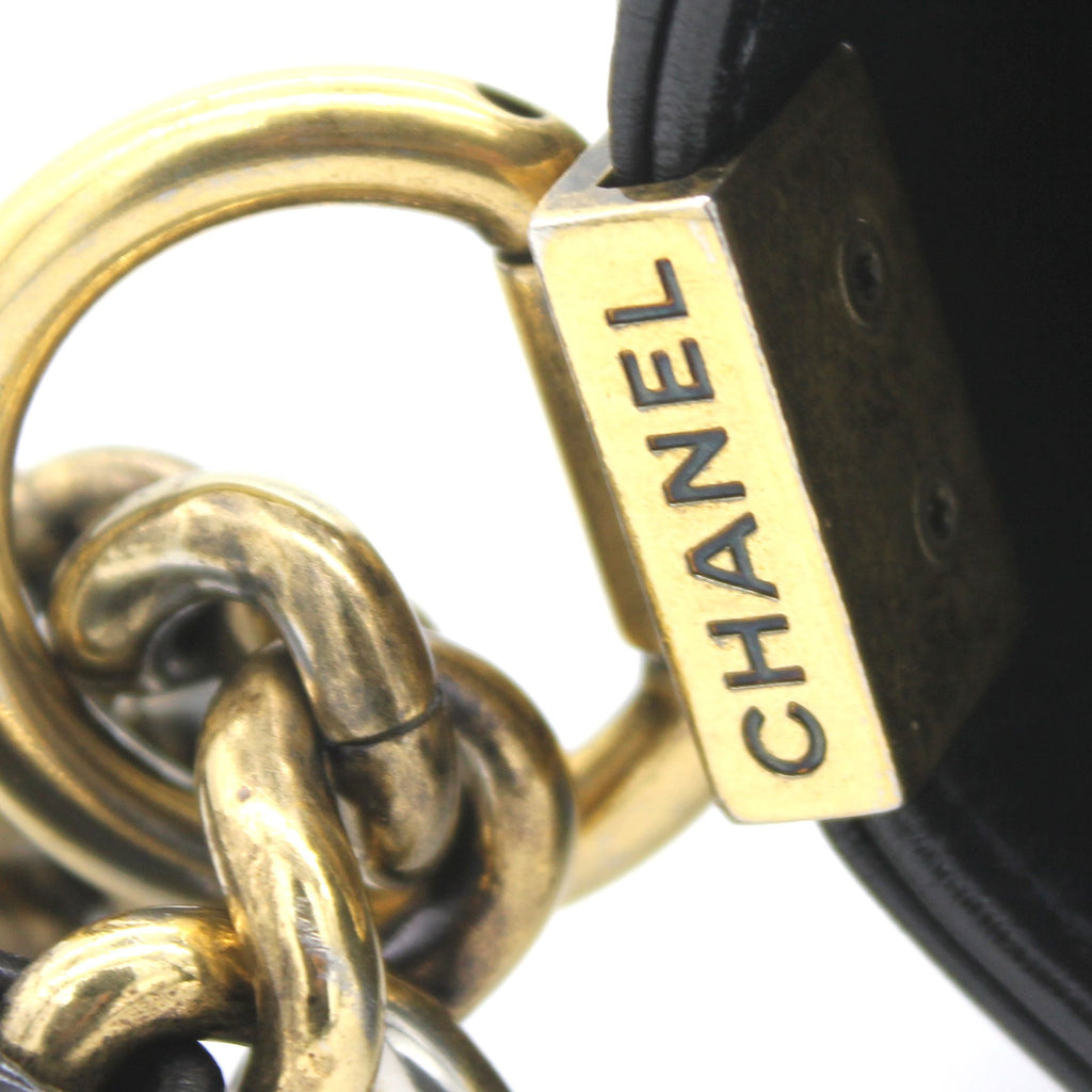 | Every Chanel creation deserves to be etched with honour in the history of fashion as they carry irreplaceable style. Like this stunner of a Boy Flap that has been exquisitely crafted from leather. It does not only bring a black shade but also their signature label on the fabric interior and the iconic CC push lock on the flap. The piece has aged gold-tone hardware, and a lovely chain link just so you can easily parade it. This flap bag, with its structured silhouette and classy style, is eyed by women worldwide. Cease the wait and make this luxurious bag yours today with pride. |