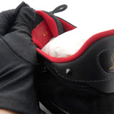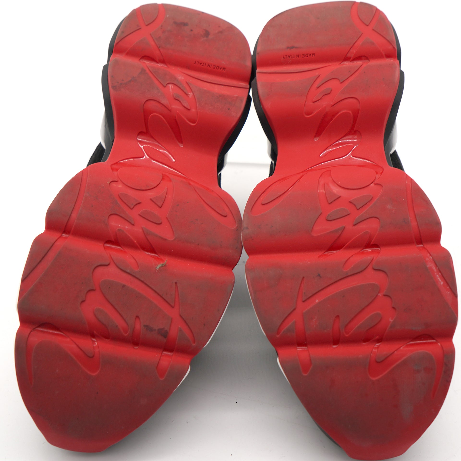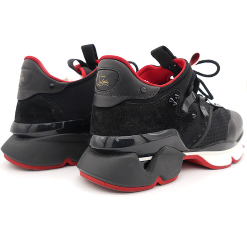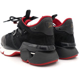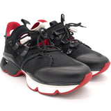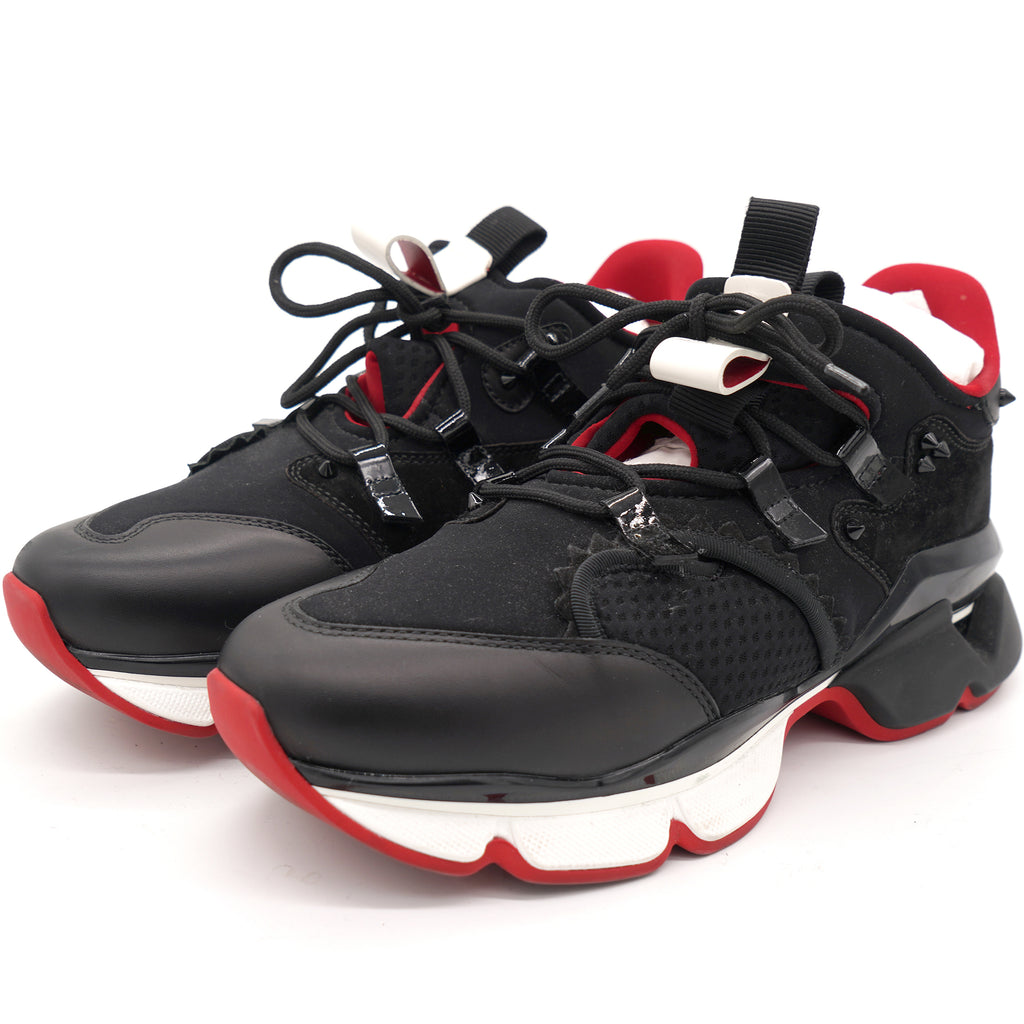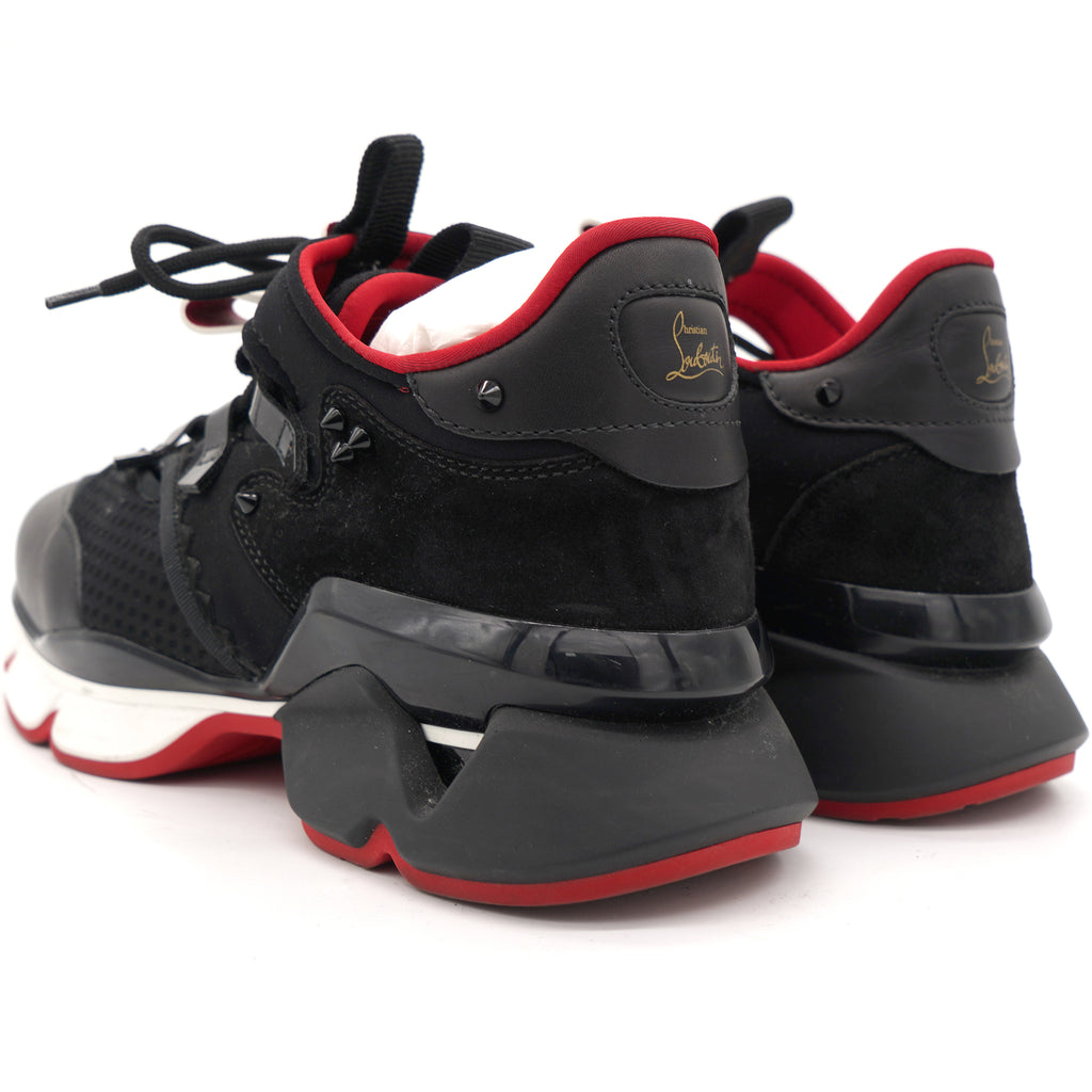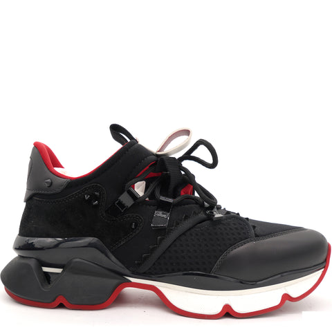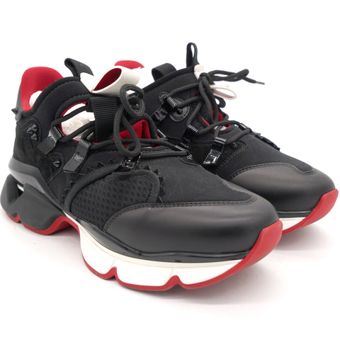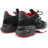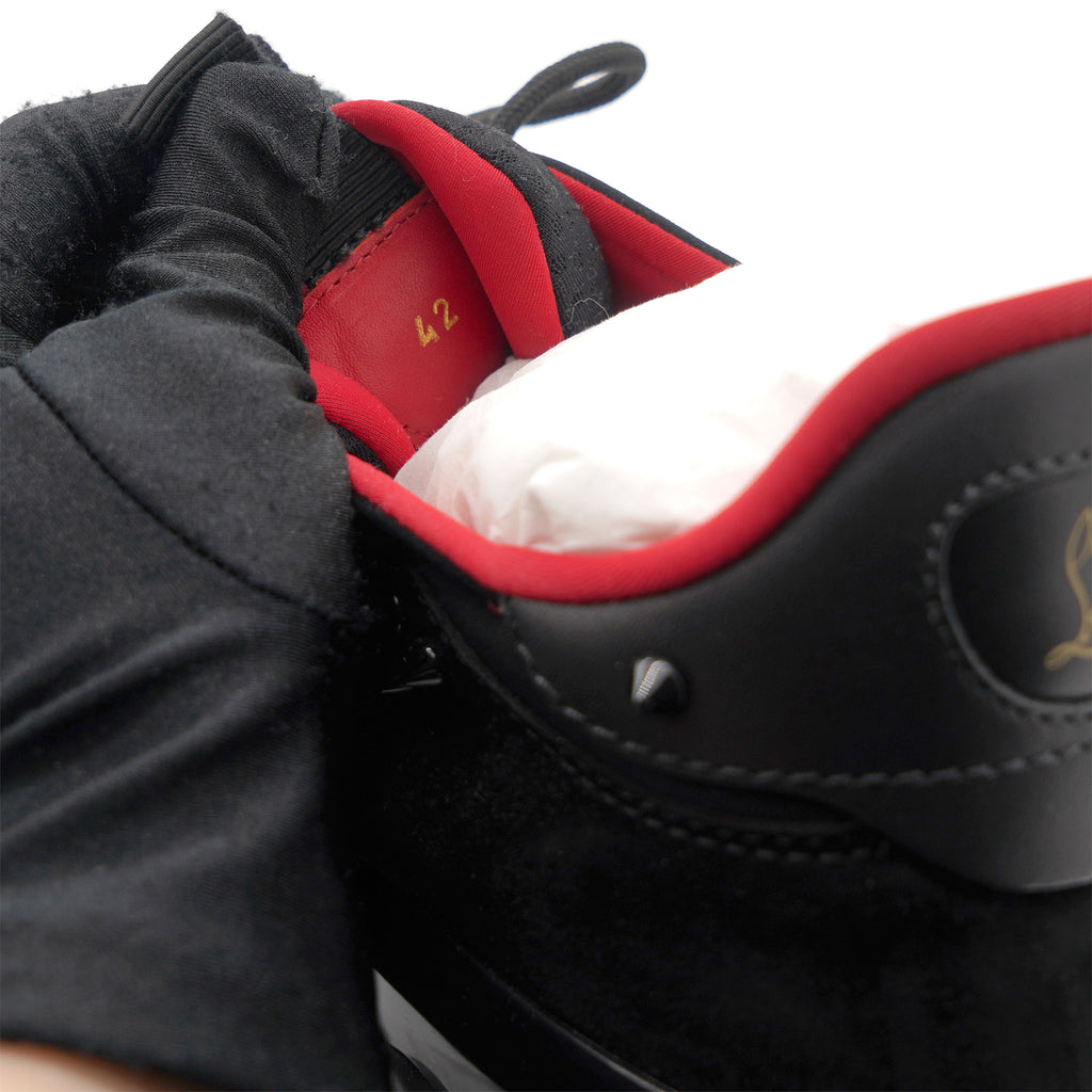 | Inspired by the classic running sneaker, the Red-Runner Flat has become an iconic model by the Maison. This version in classic black features a mix of materials in veau velours suede, calfskin leather, neoprene, velvet, patent leather and a grosgrain ribbon trim. The sneaker incorporates a sock liner in the Maison’s signature red, a detail mirrored on the black tracked platform sole, also framed with red, creating an edgy twist. |