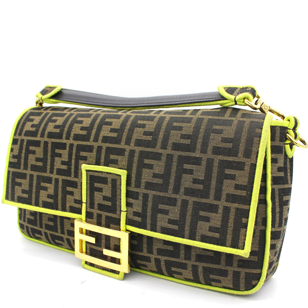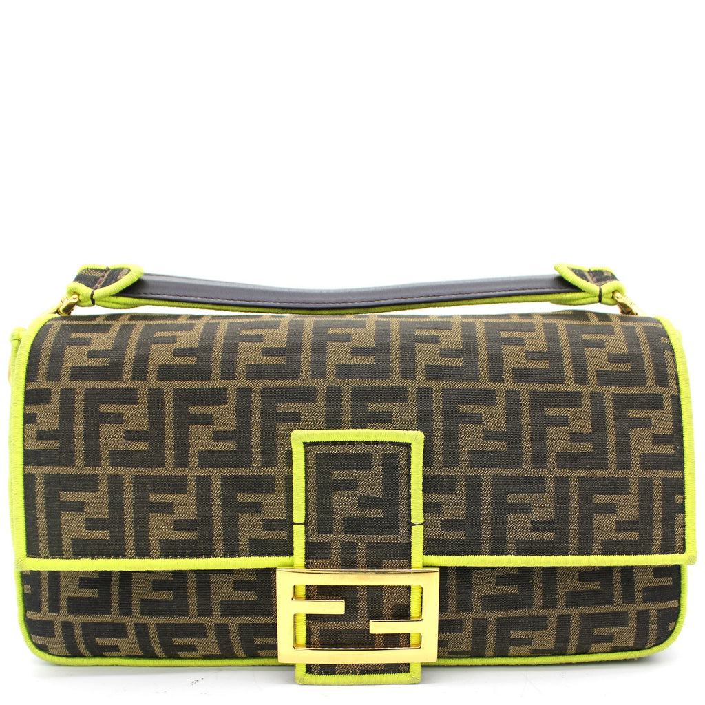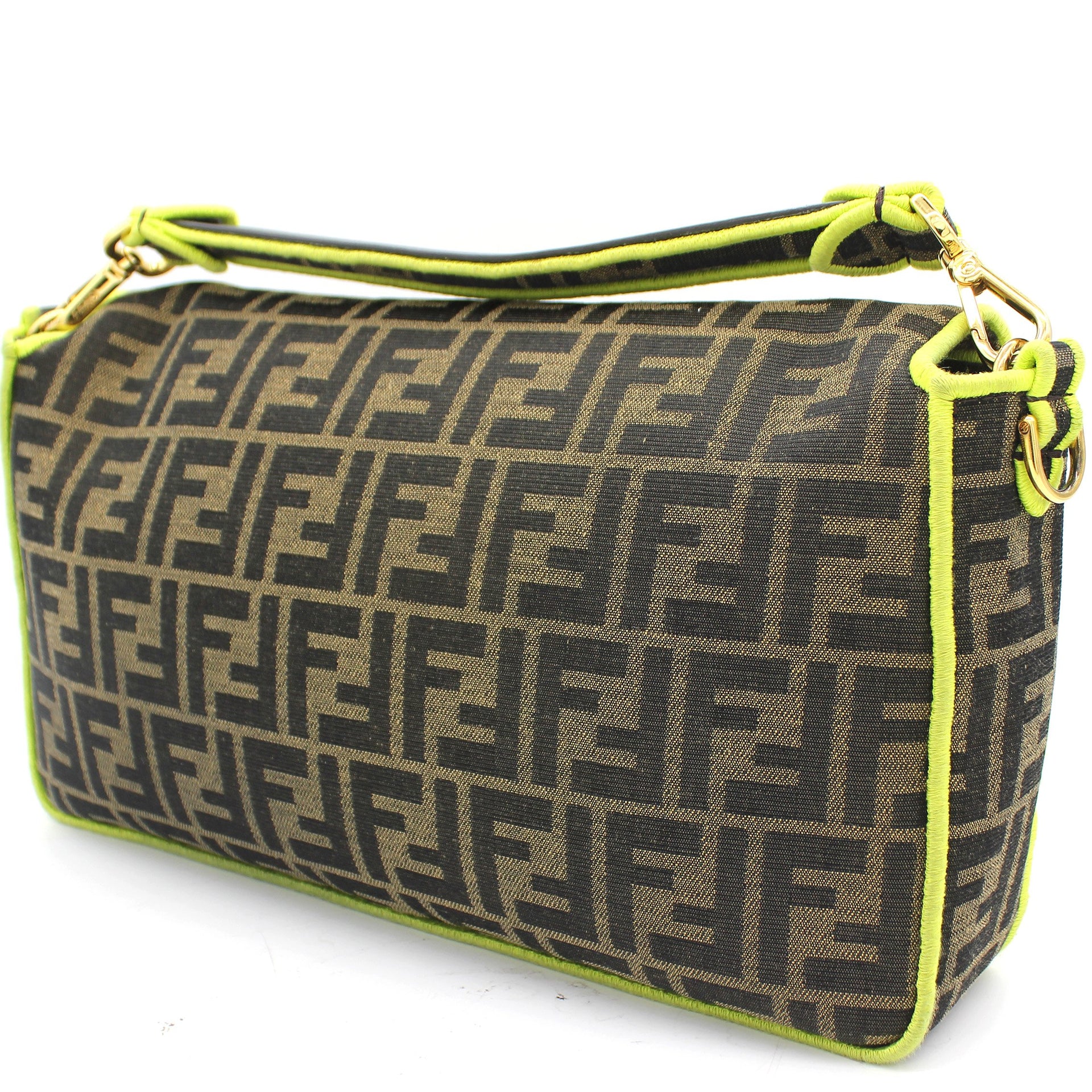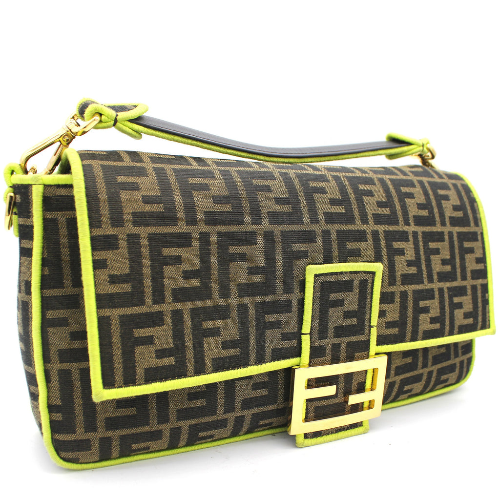 | Limited Edition 2019 Large Baguette bag made of brown jacquard fabric with an FF motif, decorated with an FF clasp and trimmed with lime green embroidery. Featuring a front flap, magnetic clasp, unlined internal compartment with zip pocket and gold-finish metalware. The bag can be carried by hand or worn either on the shoulder or cross-body thanks to the handle and shoulder strap with a Fendi Label motif, both detachable. |