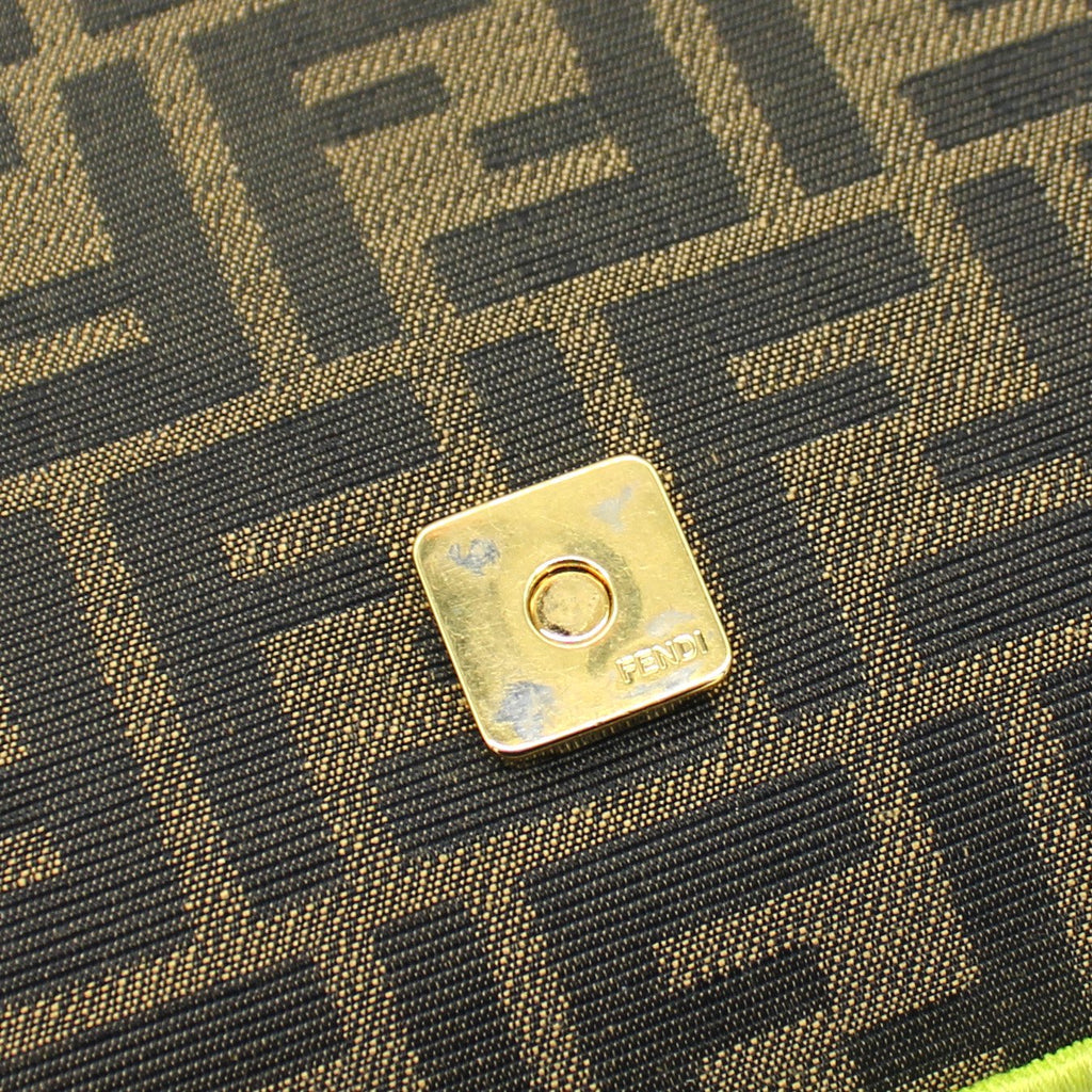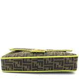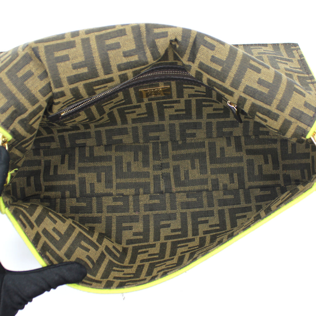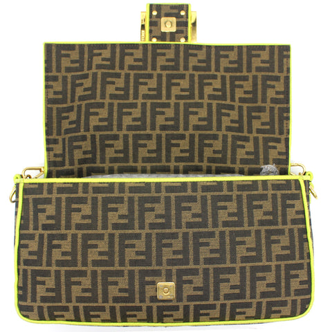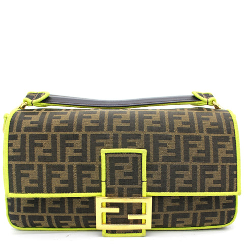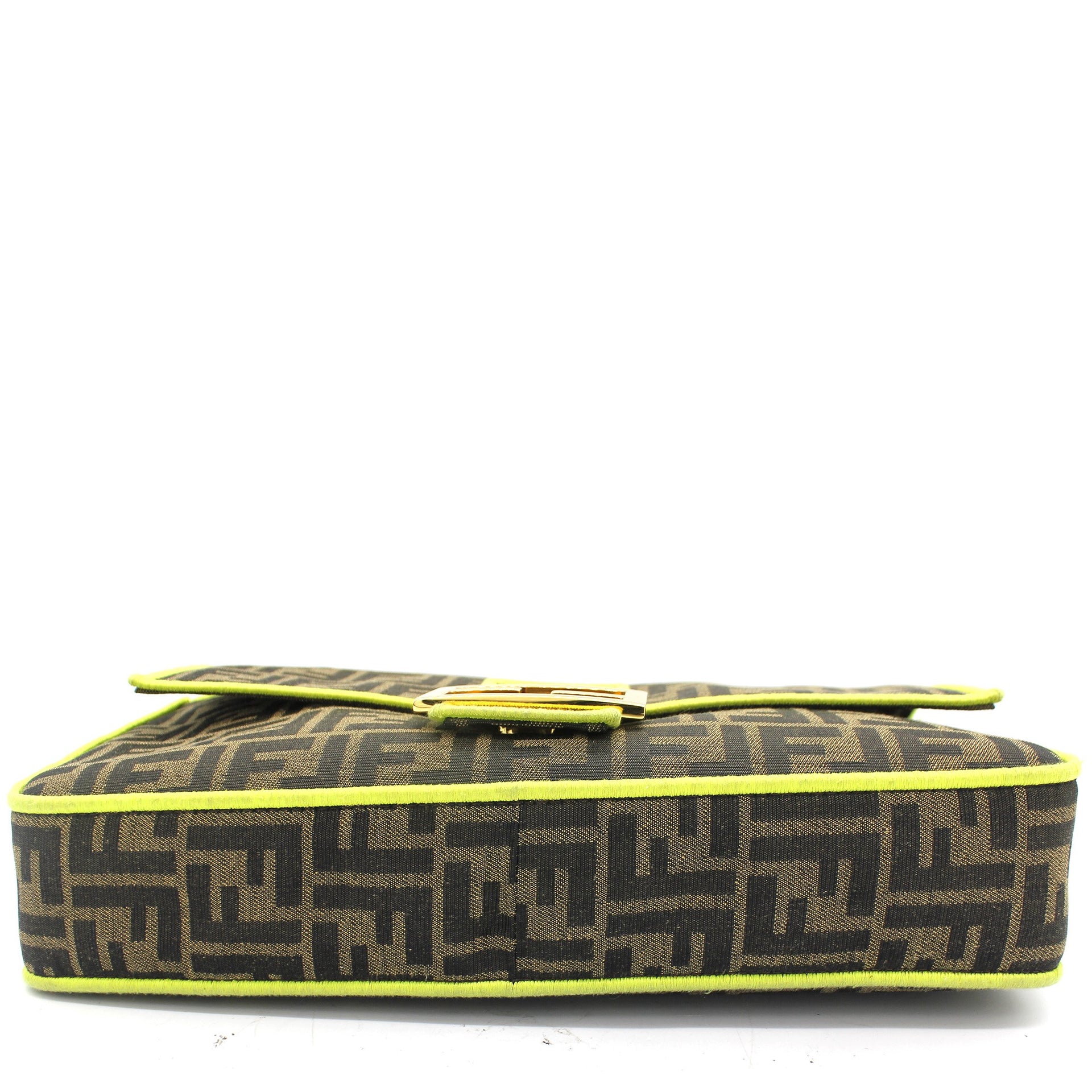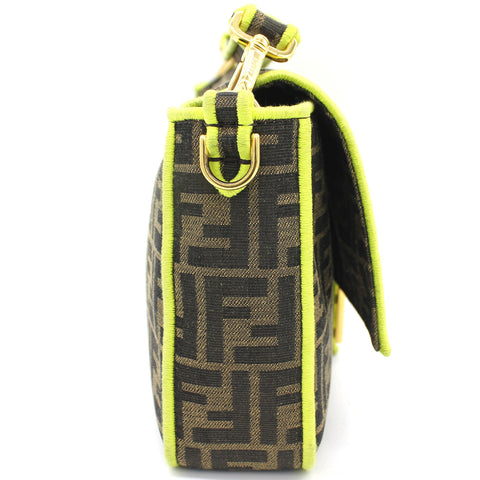 | Limited Edition 2019 Large Baguette bag made of brown jacquard fabric with an FF motif, decorated with an FF clasp and trimmed with lime green embroidery. Featuring a front flap, magnetic clasp, unlined internal compartment with zip pocket and gold-finish metalware. The bag can be carried by hand or worn either on the shoulder or cross-body thanks to the handle and shoulder strap with a Fendi Label motif, both detachable. |