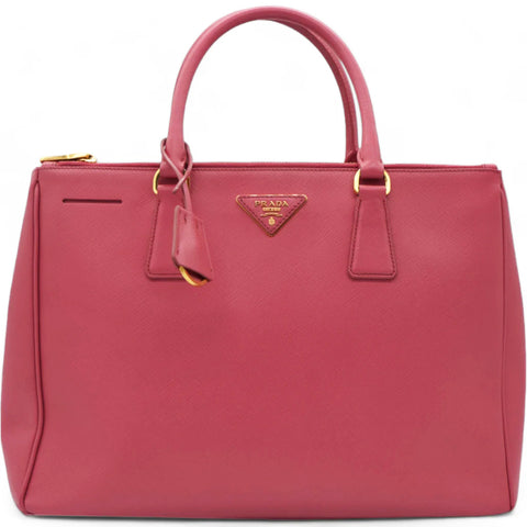 | This chic tote is crafted of Saffiano cross-grain leather in pink. The handbag features rolled leather top handles with gold links, an optional shoulder strap, gold hardware, and a hanging clochette. The top is open to a matching Prada jacquard monogram interior with full top zipper pockets, patch and zipper pockets. |