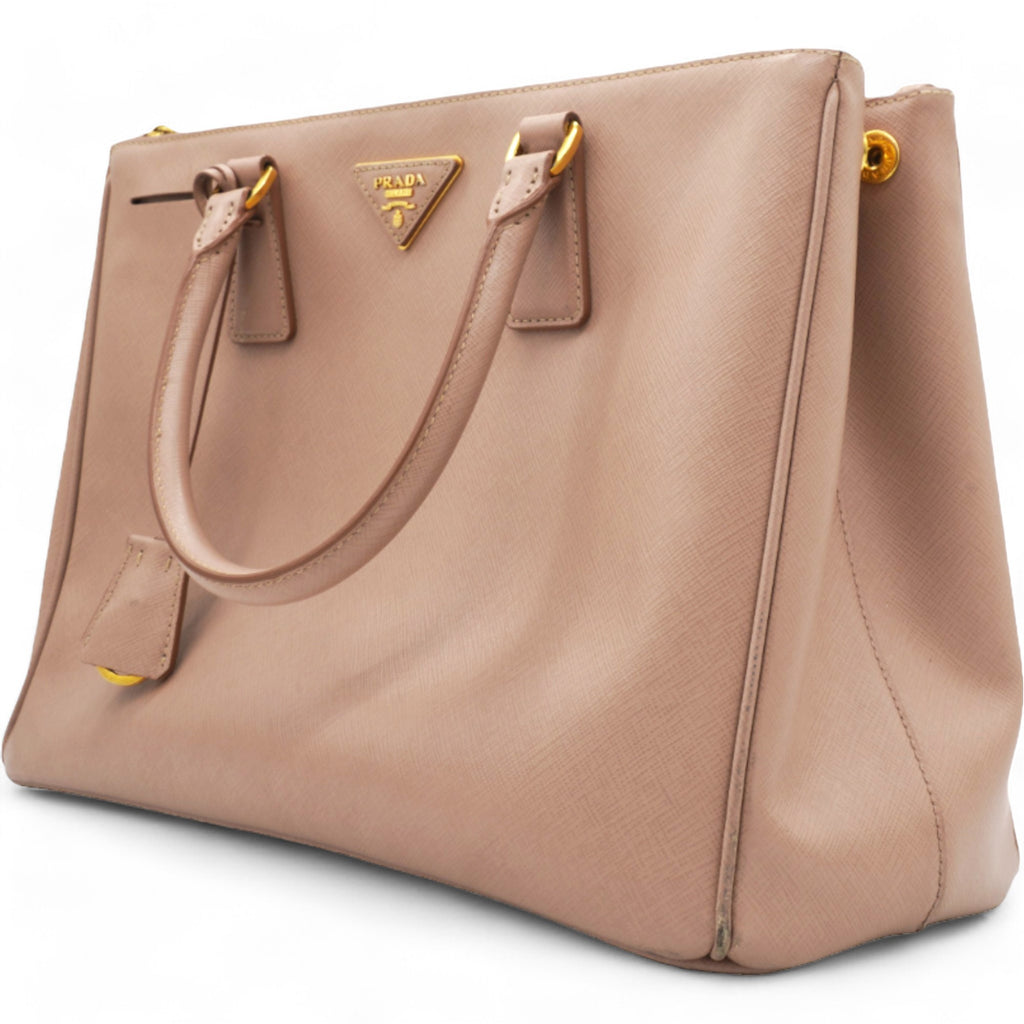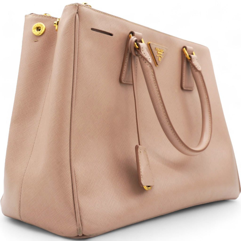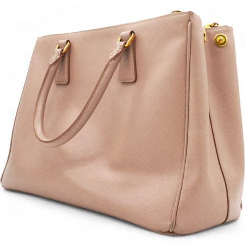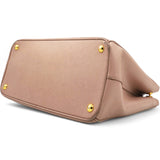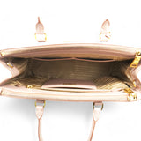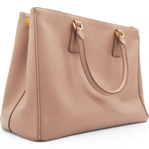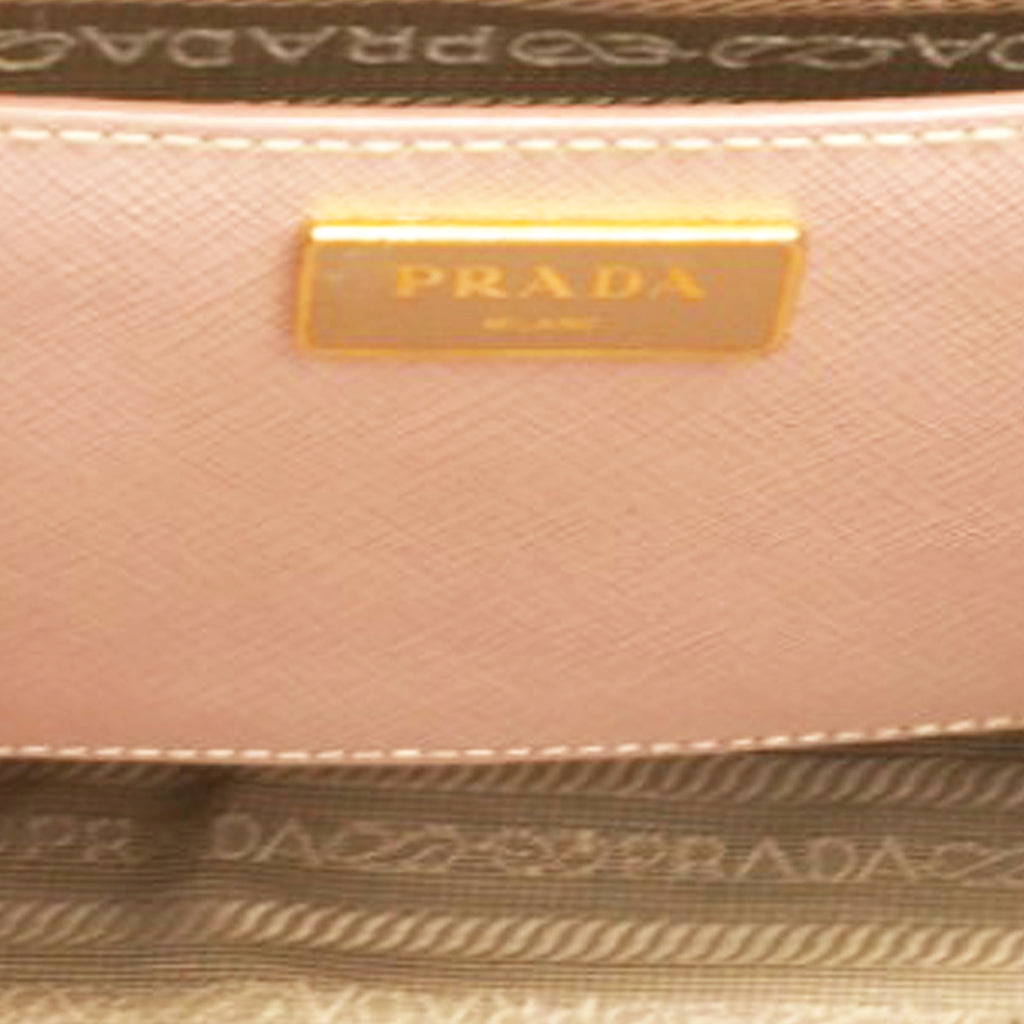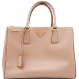 | This chic tote is crafted of beige colored Saffiano cross-grain leather. It features rolled leather top handles, an optional adjustable leather shoulder strap, a hanging key ring clochette, and polished gld hardware including a Prada triangle logo on the front. The top is open to a partitioned champagne Prada logo jacquard interior with a zipper and leather patch pockets and two zipper compartments on either side. |