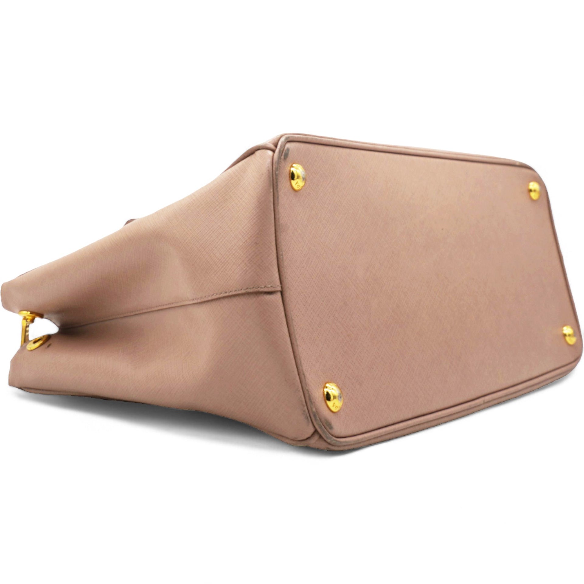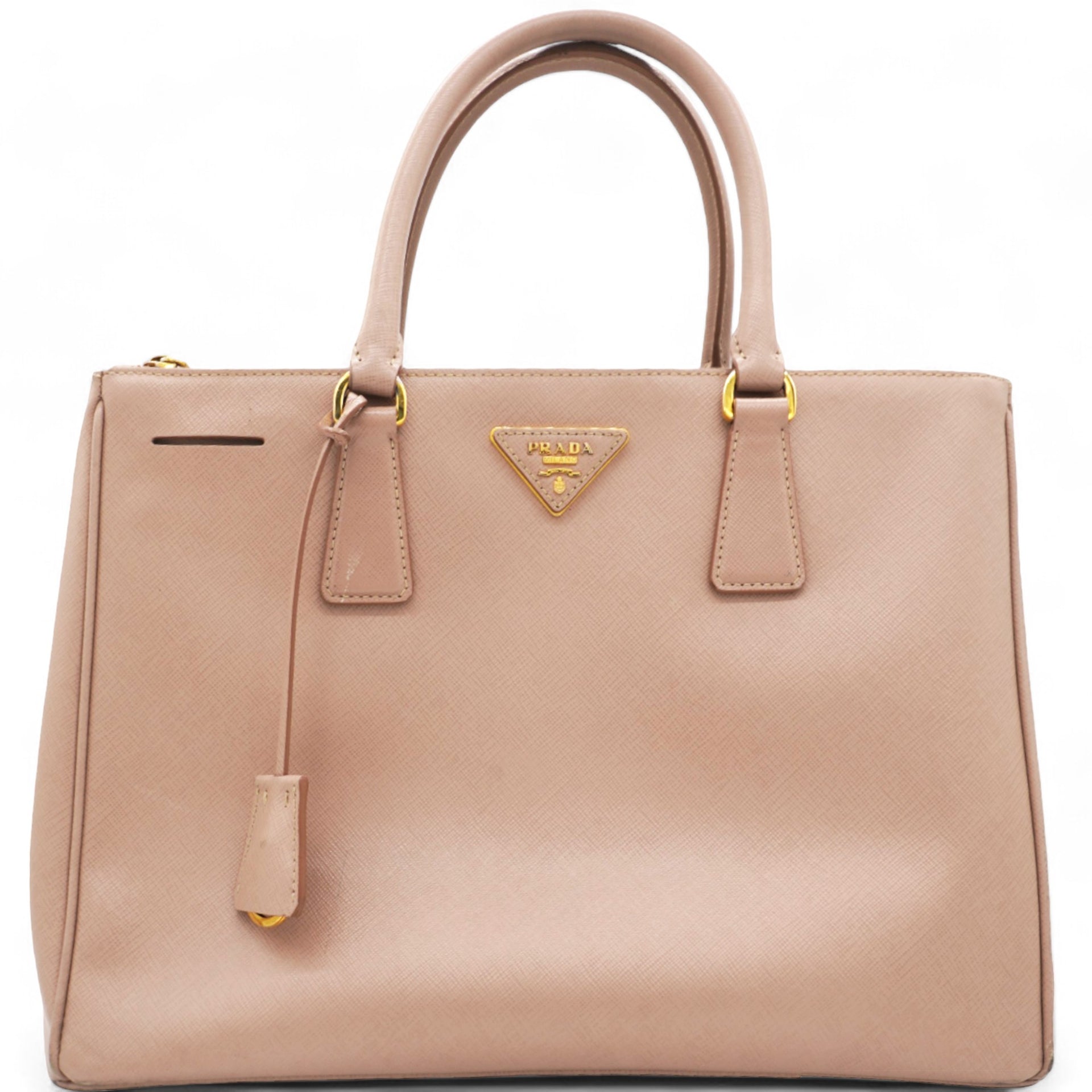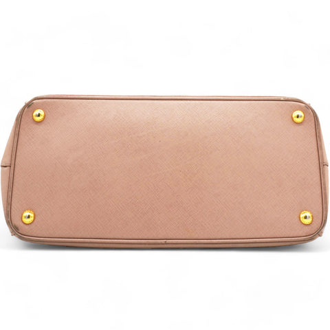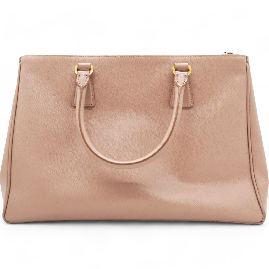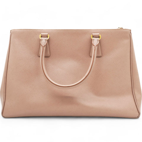| This chic tote is crafted of beige colored Saffiano cross-grain leather. It features rolled leather top handles, an optional adjustable leather shoulder strap, a hanging key ring clochette, and polished gld hardware including a Prada triangle logo on the front. The top is open to a partitioned champagne Prada logo jacquard interior with a zipper and leather patch pockets and two zipper compartments on either side. |