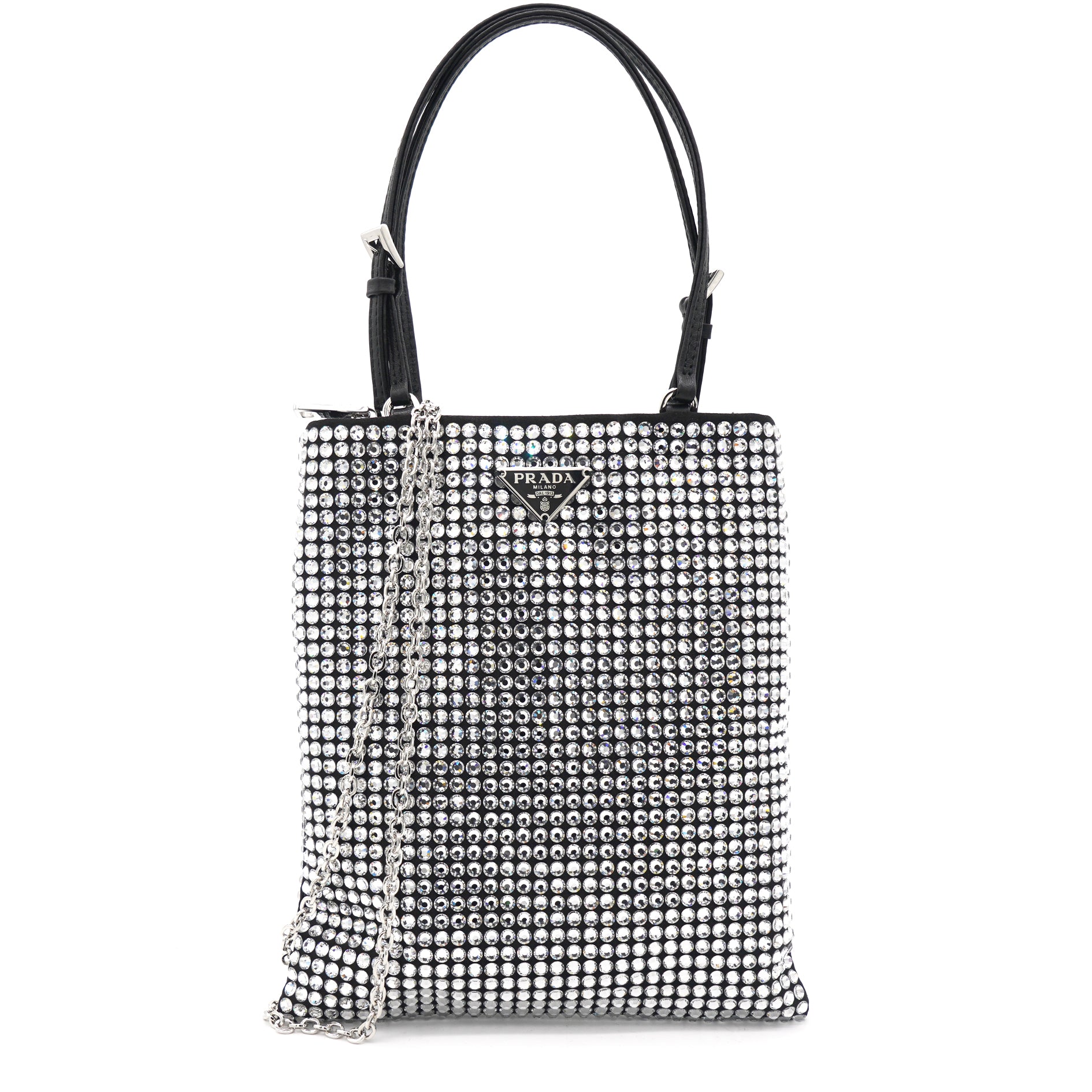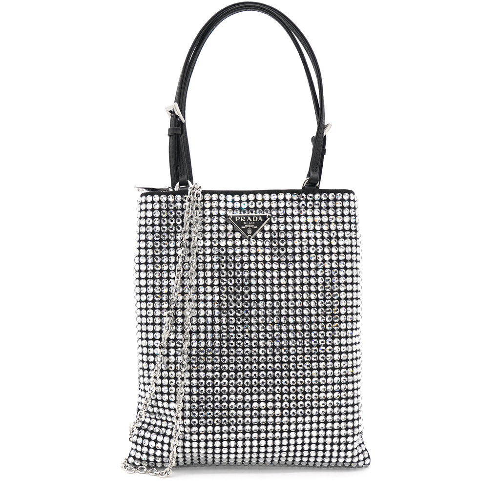 This nylon bag with all-over crystal embellishment stands out for its modern, feminine design. It features classic elements such as the triangular brand logo on the front, dual leather handles and a spacious interior.