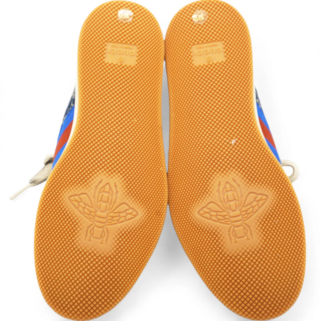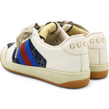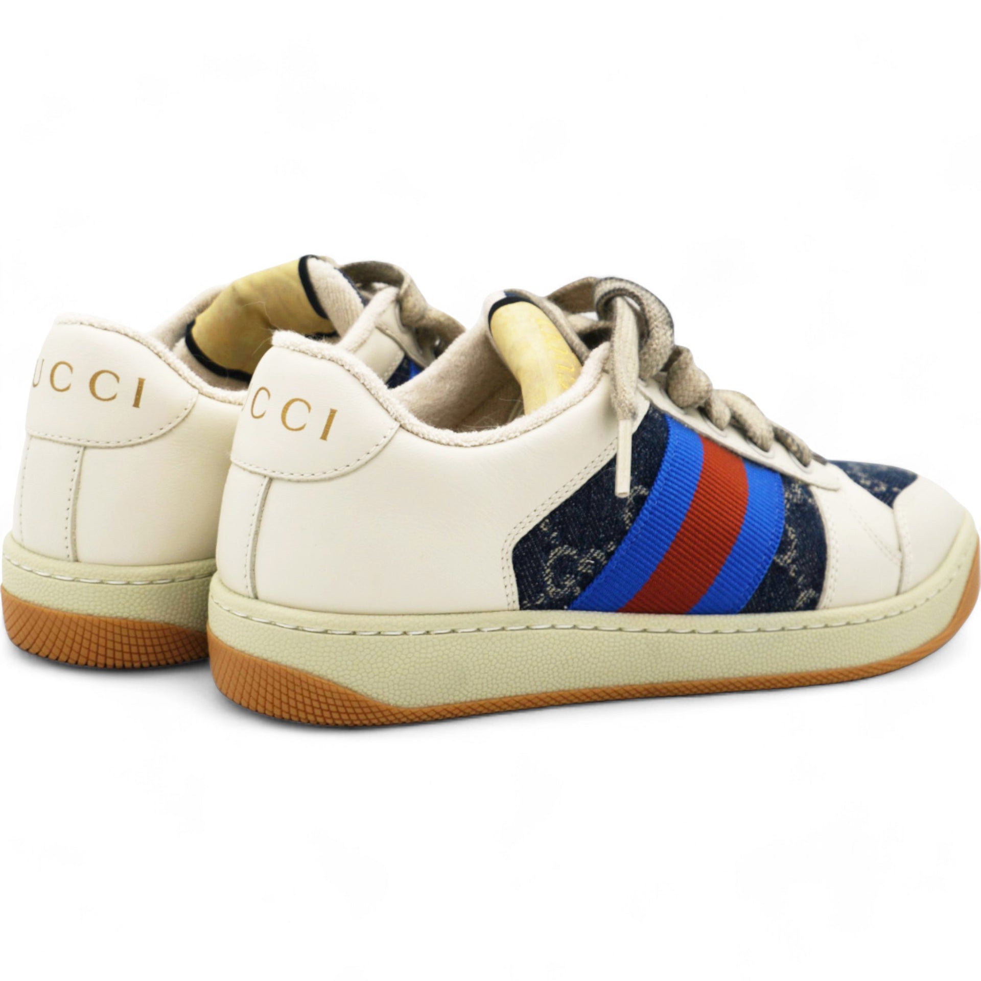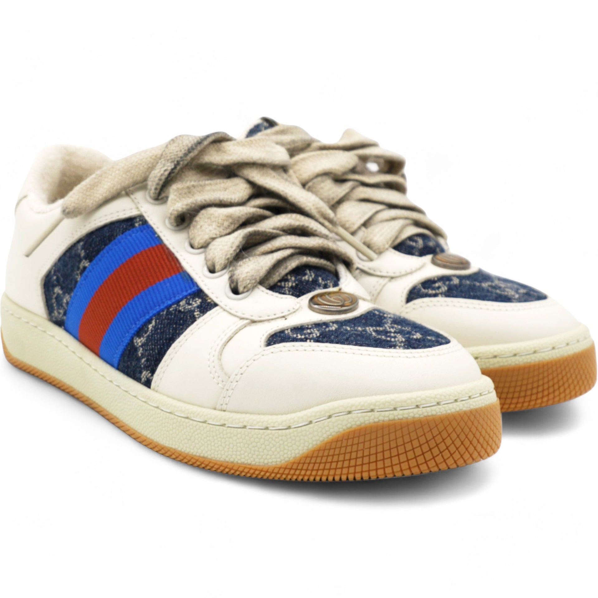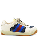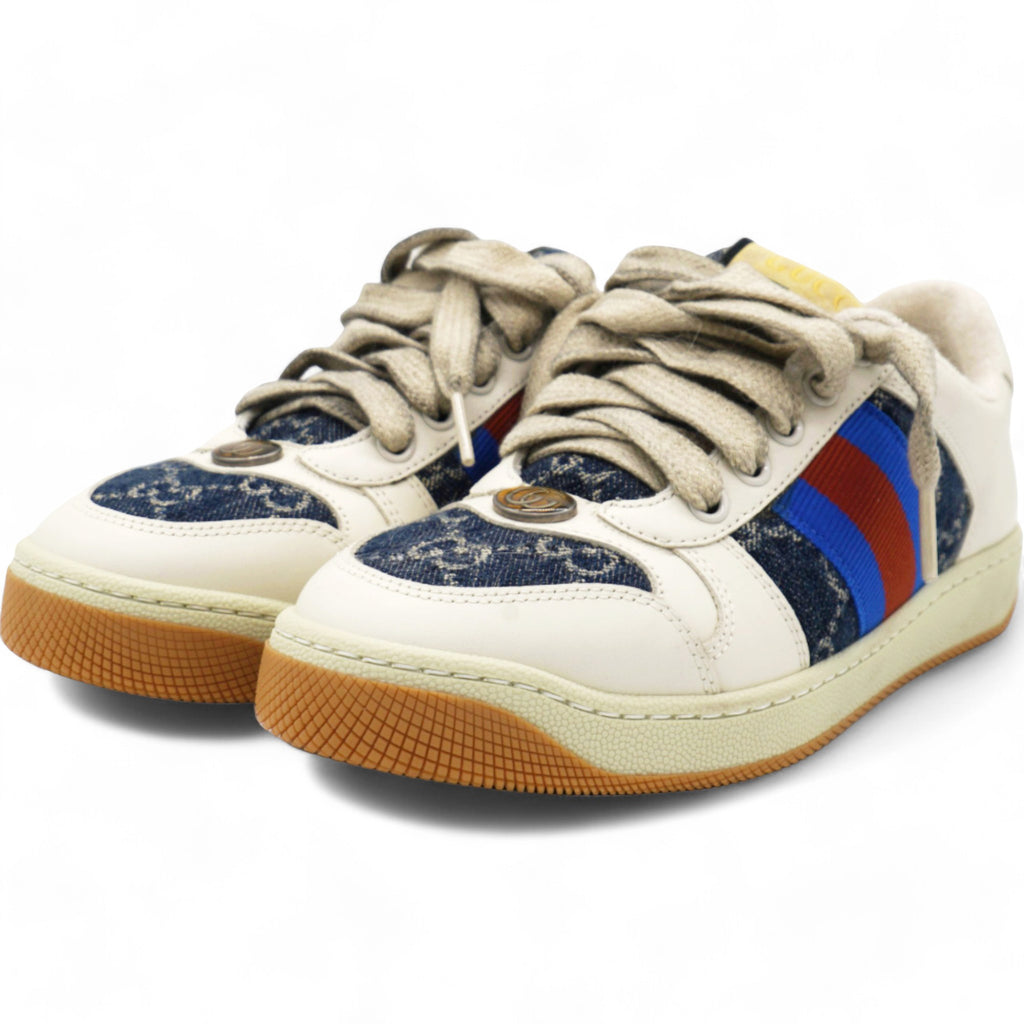 | The Screener sneakers from Gucci are designed in a mix of white leather and blue and ivory eco-washed organic GG denim. Influenced by classic trainers from the '70s, the sneaker—named for the defensive sports move—features the Web stripe on the side and a vintage-inspired Gucci logo. They're finished with a bi-colour rubber sole and oval enamelled detail with a metal Double G. |