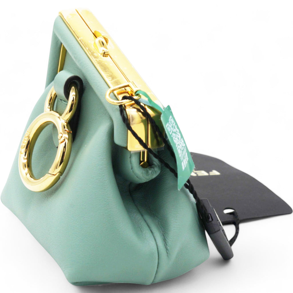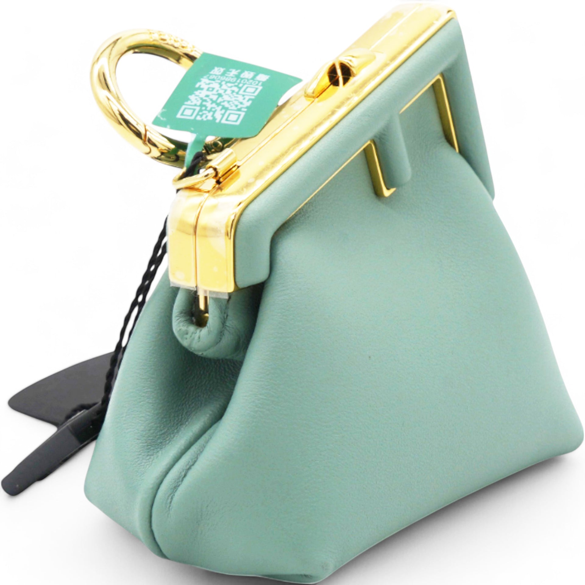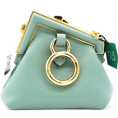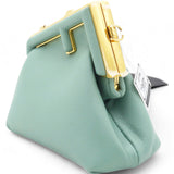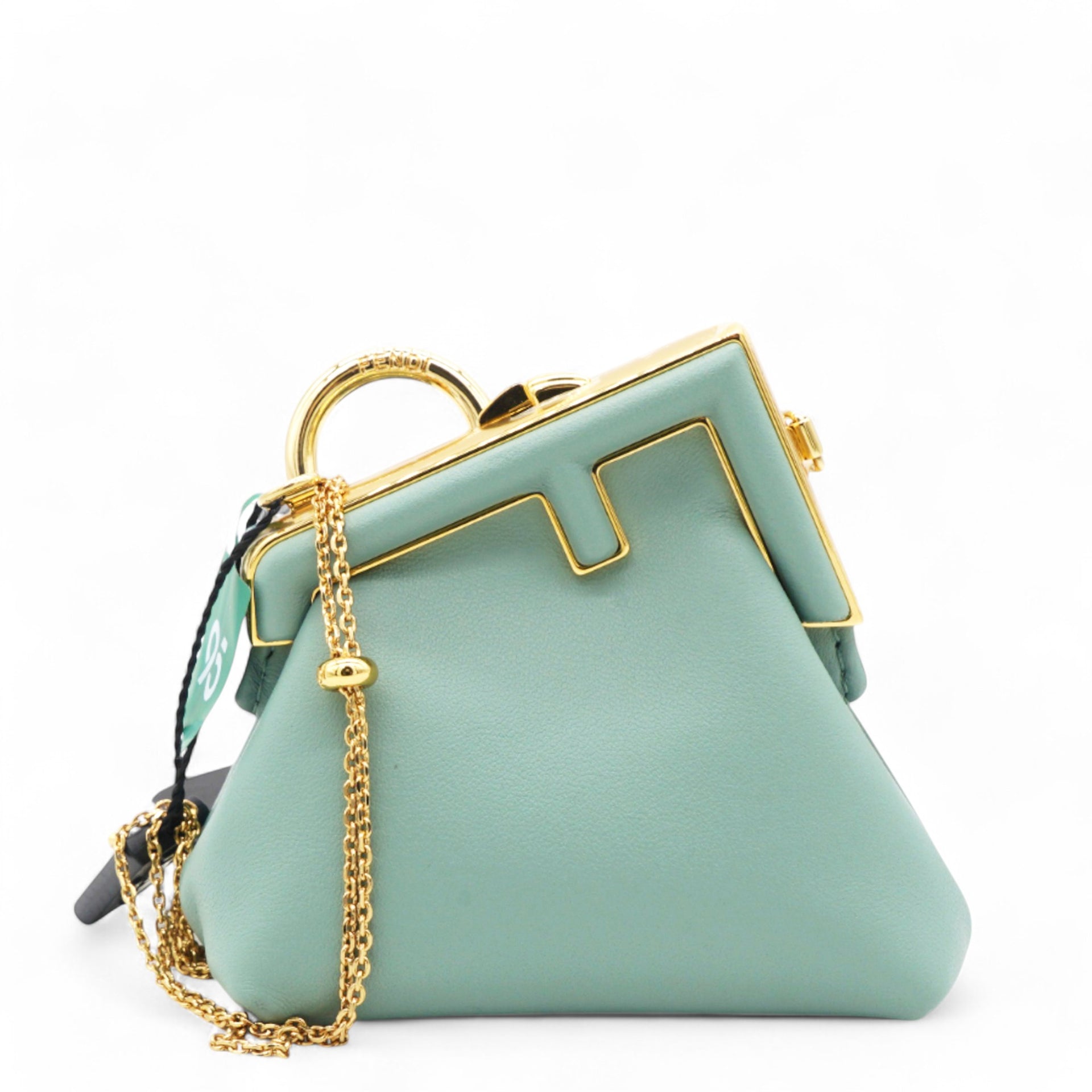 | This chic bag is crafted of leather in light blue-green. The bag features a matching optional shoulder strap with polished gold-tone hardware. The top opens with a prominent hinged, gold-tone Fendi logo detail to a spacious interior. The Fendi First can be carried like a clutch or worn as a shoulder bag. |