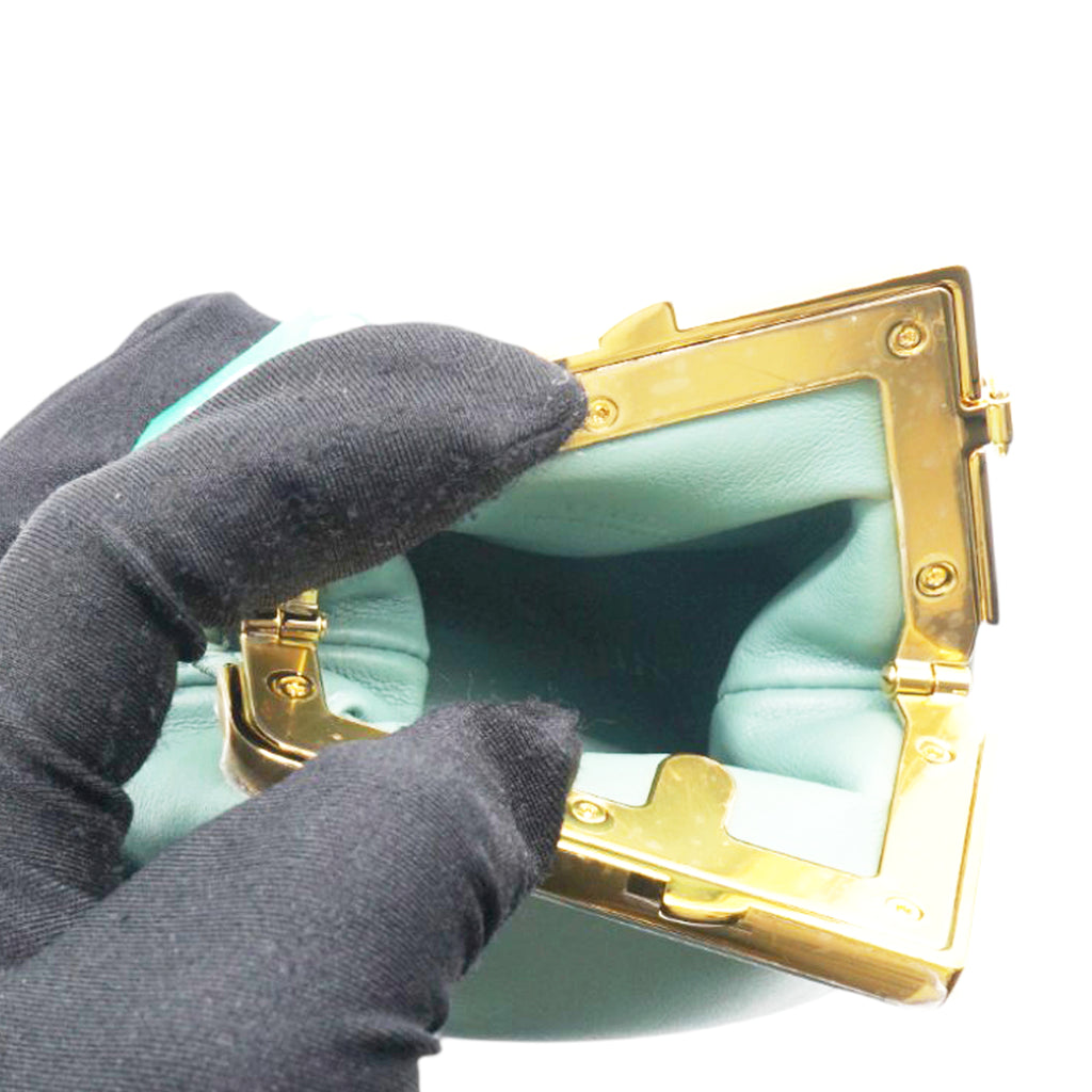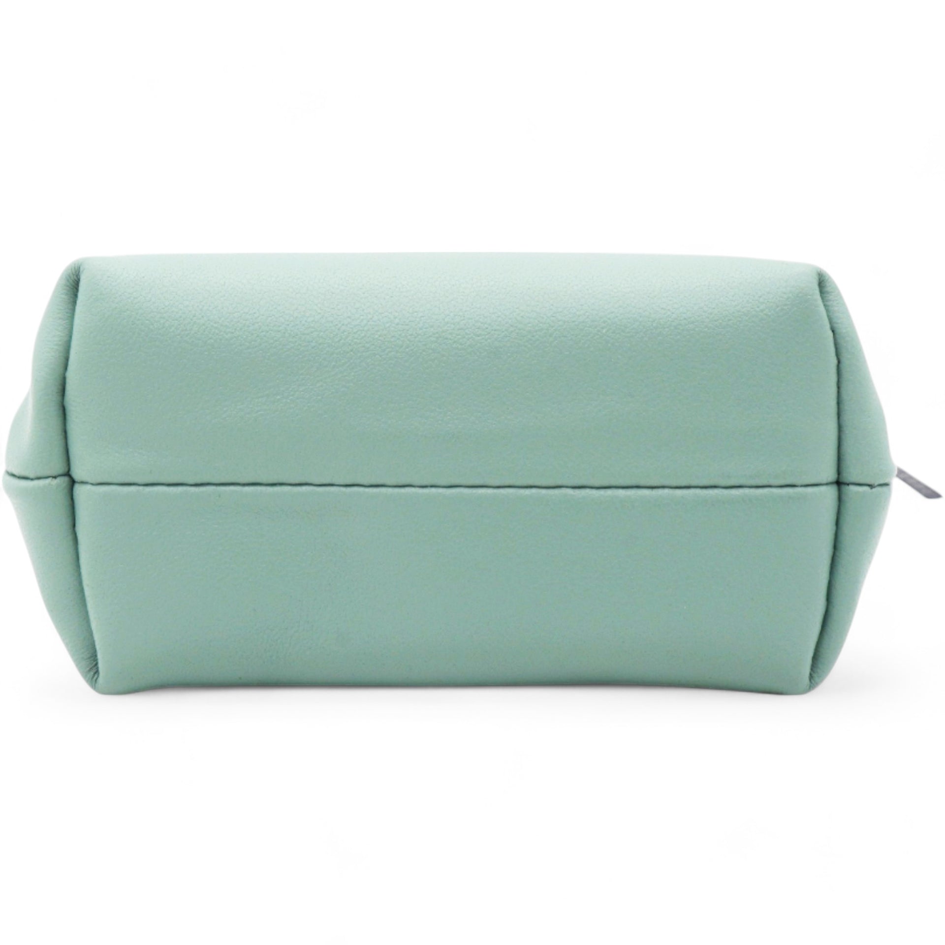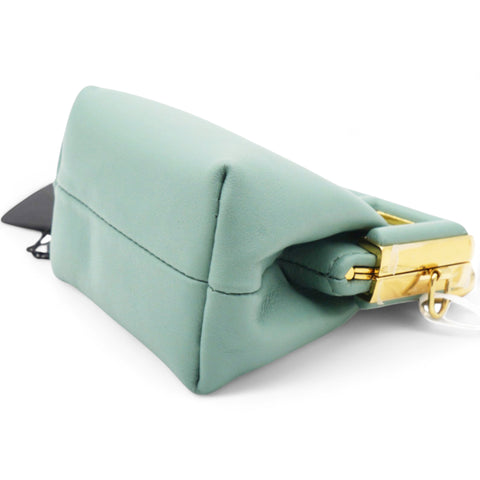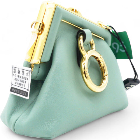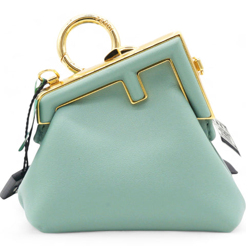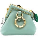 | This chic bag is crafted of leather in light blue-green. The bag features a matching optional shoulder strap with polished gold-tone hardware. The top opens with a prominent hinged, gold-tone Fendi logo detail to a spacious interior. The Fendi First can be carried like a clutch or worn as a shoulder bag. |