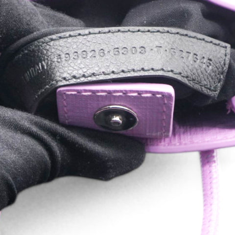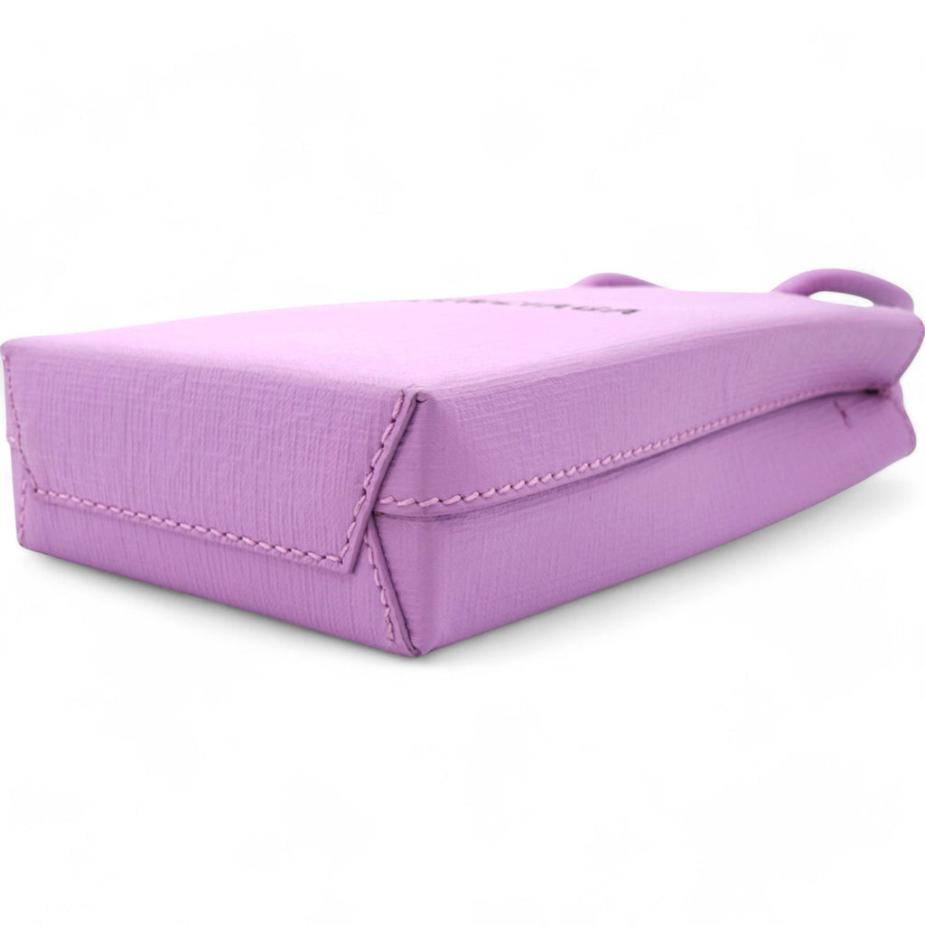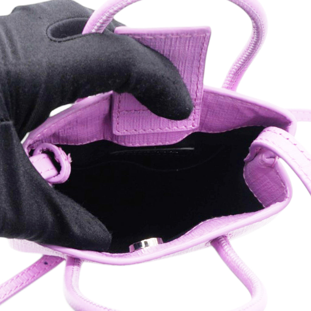 | This stylish handbag is crafted of purple leather. The handbag features thin purple leather top handles and an adjustable purple leather crossbody strap. The top is open to a black fabric interior with a patch pocket. |