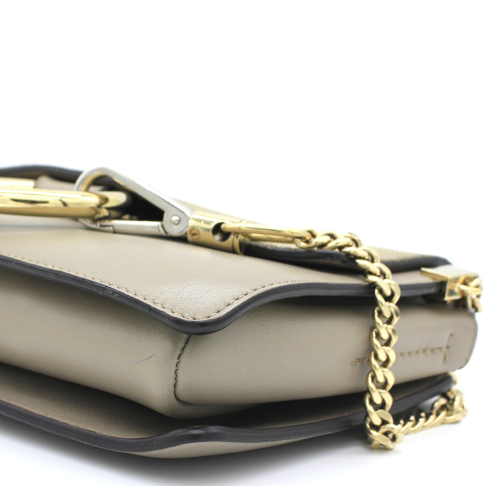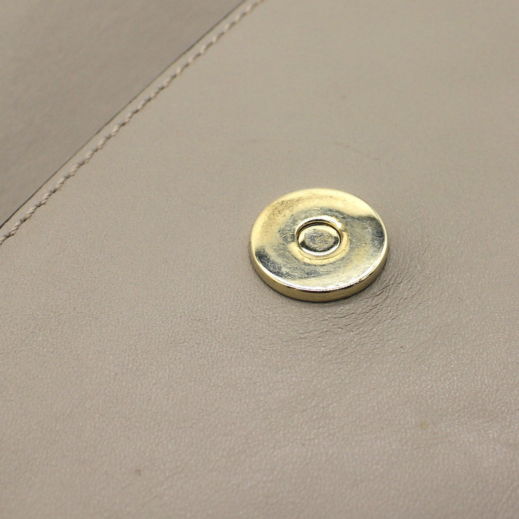 | This stylish shoulder bag is crafted of fine smooth calfskin and suede leather in beige. This bag features an adjustable leather shoulder strap, a suede front flap and polished silver and gold hardware including a decorative ring attached to a clasp and chain. The flap opens with a button snap to a partitioned suede interior with three compartments and a hanging patch pocket. |