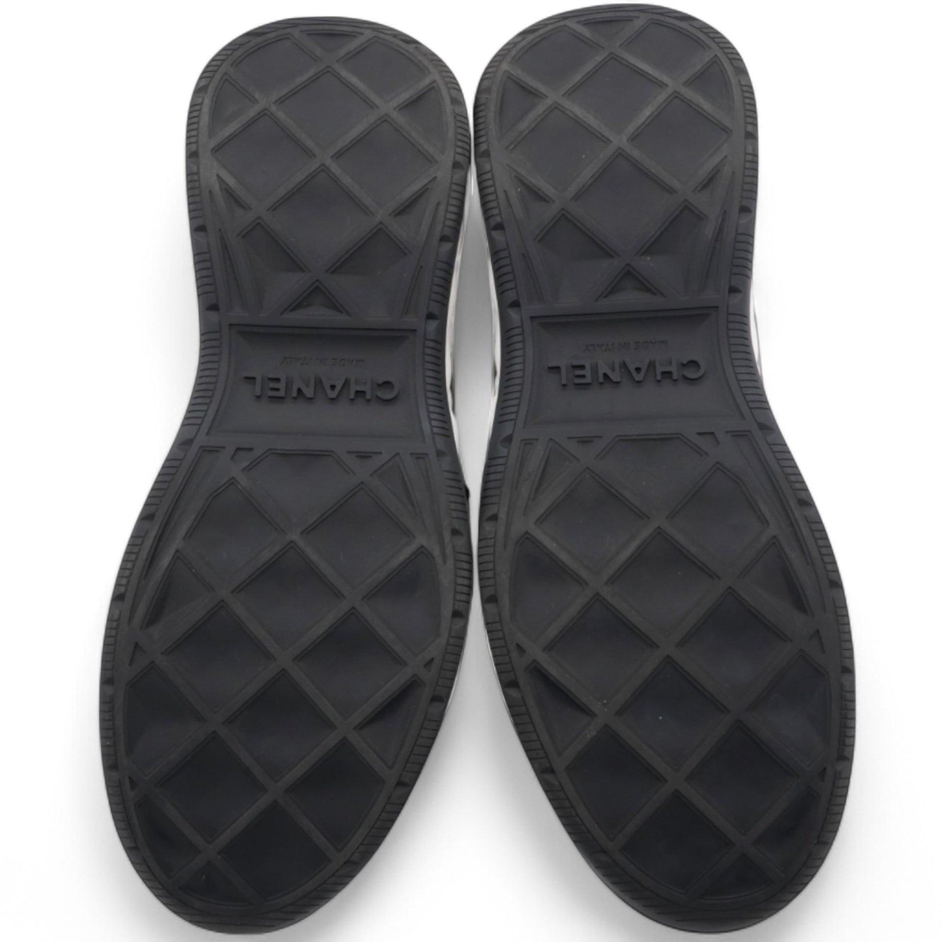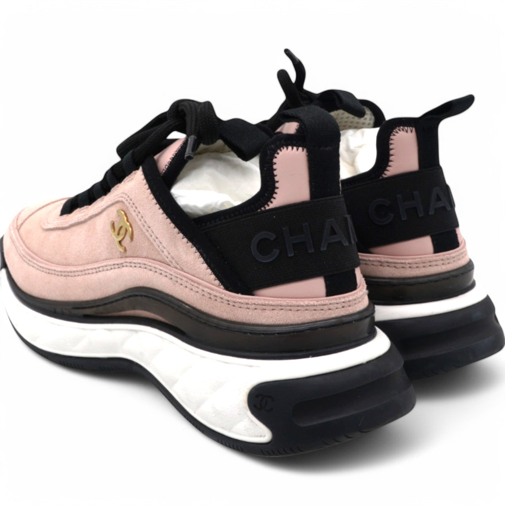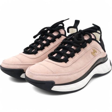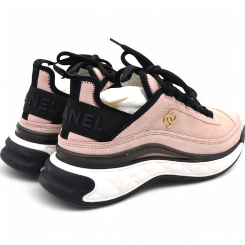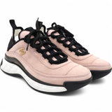 | These stylish sneakers are crafted of black fabric, and pink suede and leather with a gold Chanel CC on each side. |