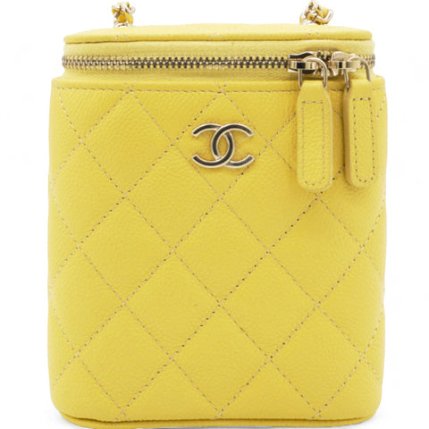 | Our pre-loved Chanel Tiny CC Vanity Shoulder bag Caviar Quilted Mini Vanity Case With Chain in Light Yellow. This stylish crossbody is crafted of luxurious caviar leather in yellow. The bag features a leather threaded gold chain-link shoulder strap and gold hardware. The handbag features a 3/4 wrap-around zipper that opens to a fabric interior. . |