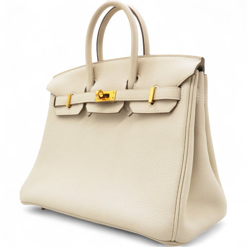 | This classic handbag is beautifully crafted of togo calfskin leather in off white. The bag features rolled leather top handles, a short front flap and strap closure with polished gold plated hardware. This opens to a matching goatskin leather interior with zipper and patch pockets. |