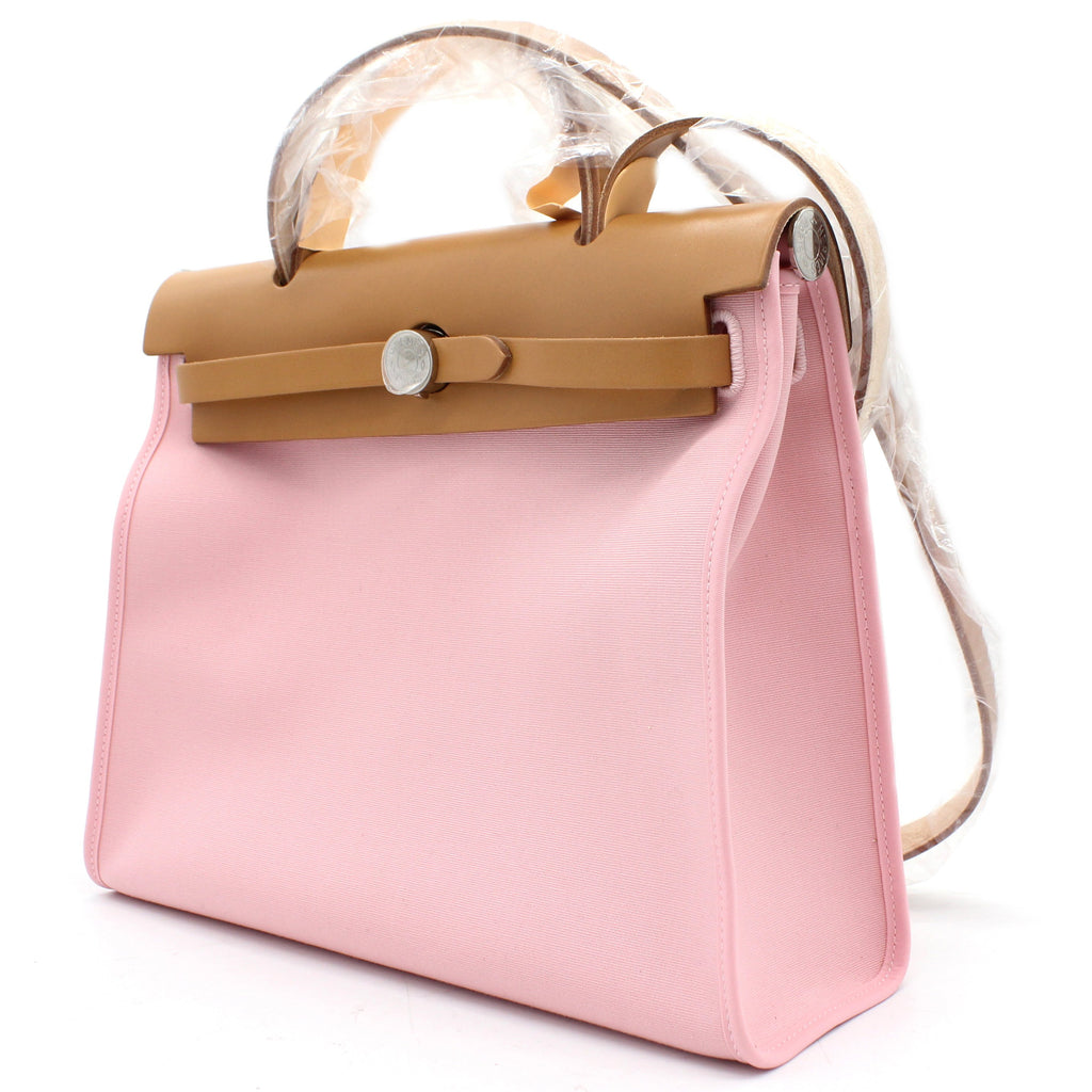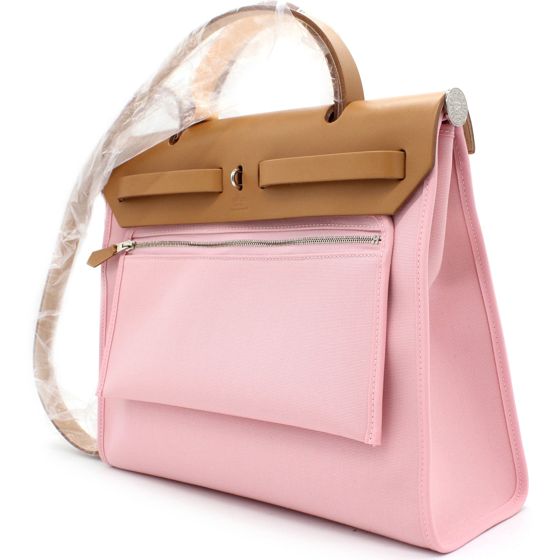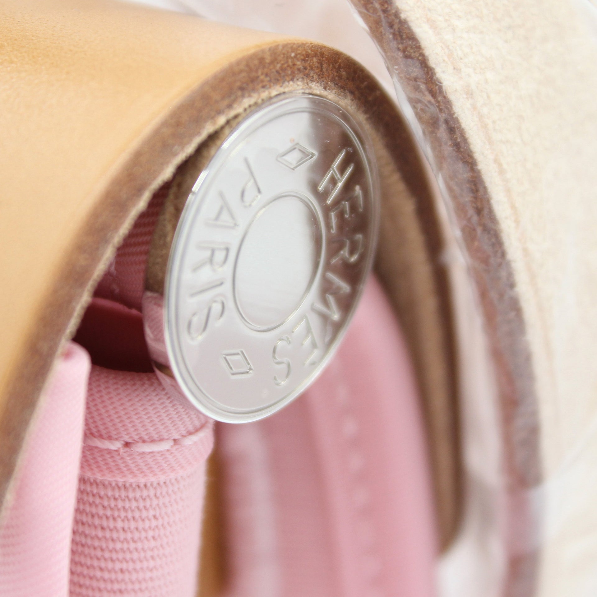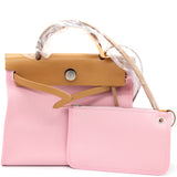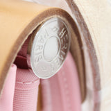 | Constructed with pink fabric and light brown leather, this functional shoulder bag showcases vache hunter leather handle and flap as well as a longer strap for hands-free accessibility and palladium hardware accents. Its frontal lock opens to a pink fabric-lined interior perfect for daily essentials. |