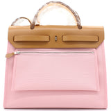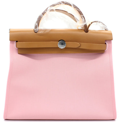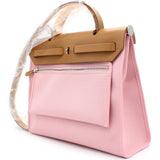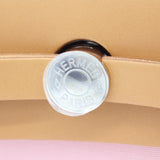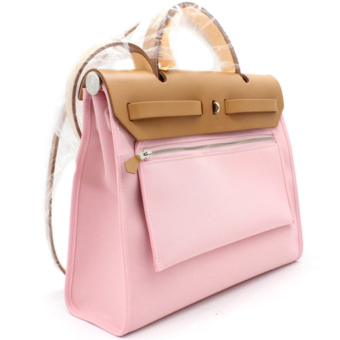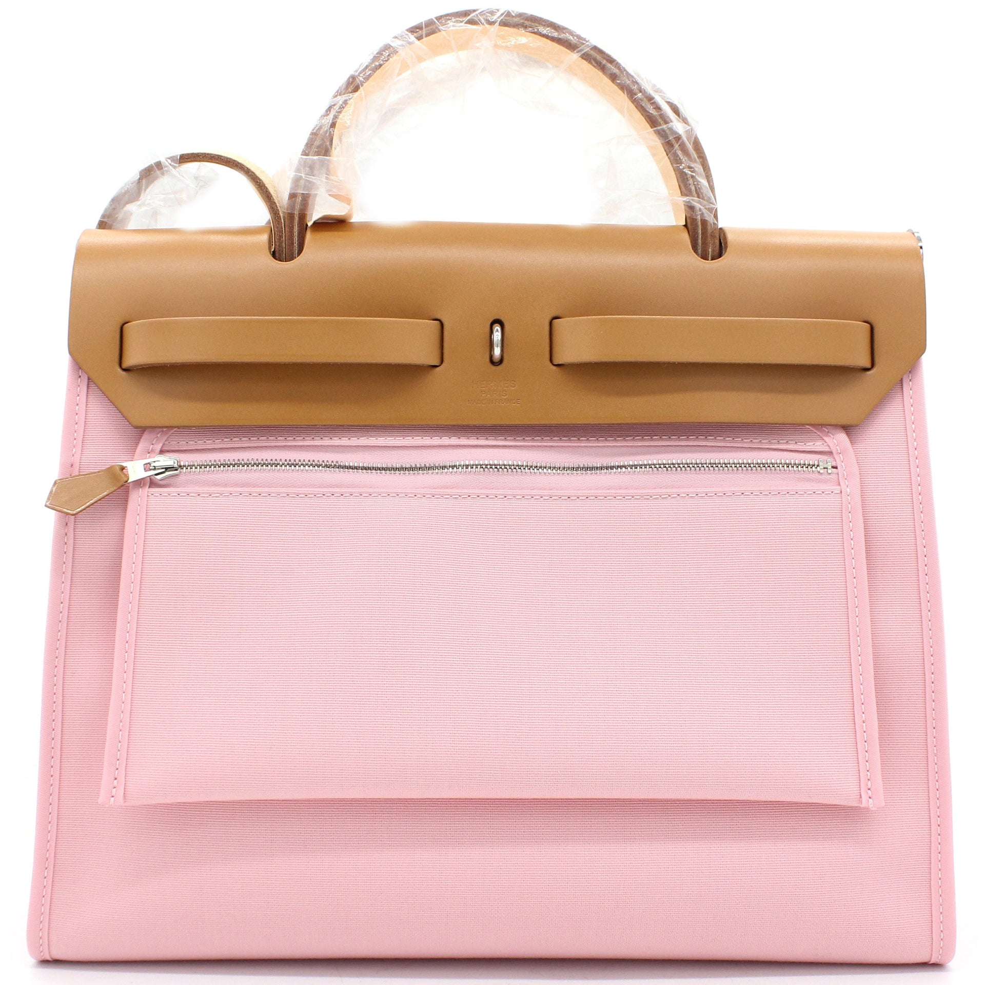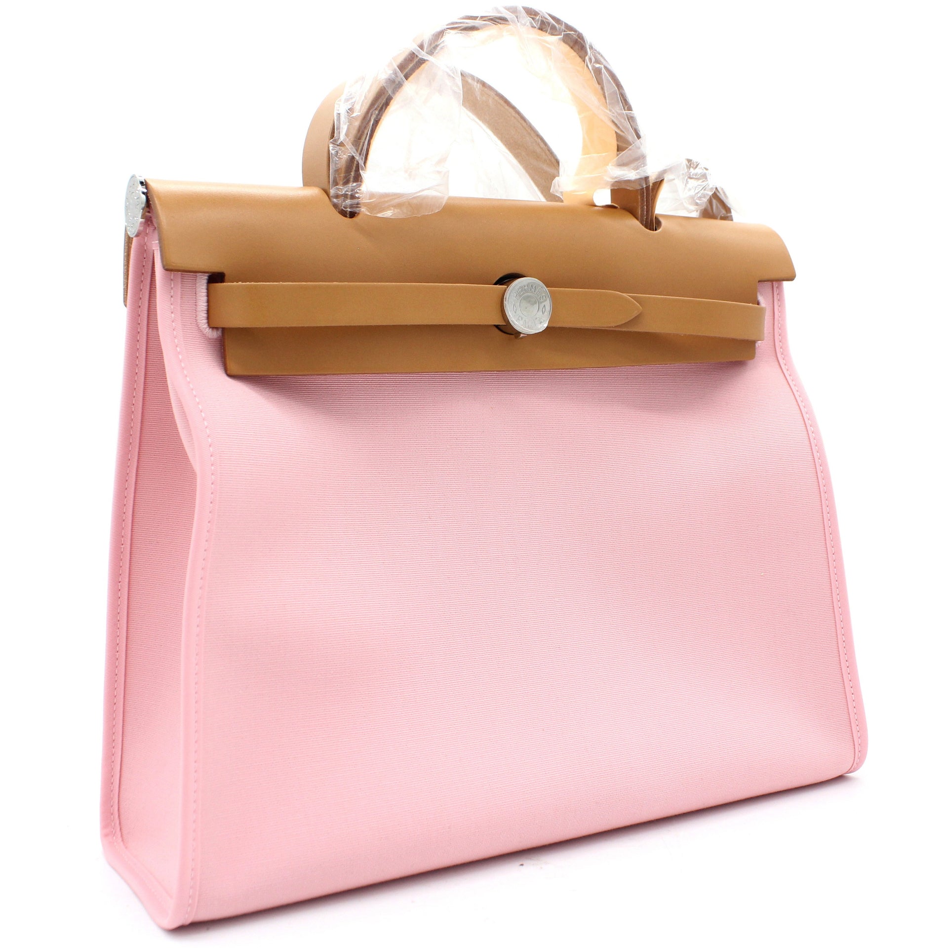| Constructed with pink fabric and light brown leather, this functional shoulder bag showcases vache hunter leather handle and flap as well as a longer strap for hands-free accessibility and palladium hardware accents. Its frontal lock opens to a pink fabric-lined interior perfect for daily essentials. |