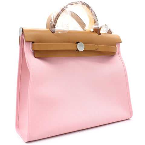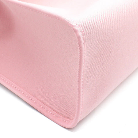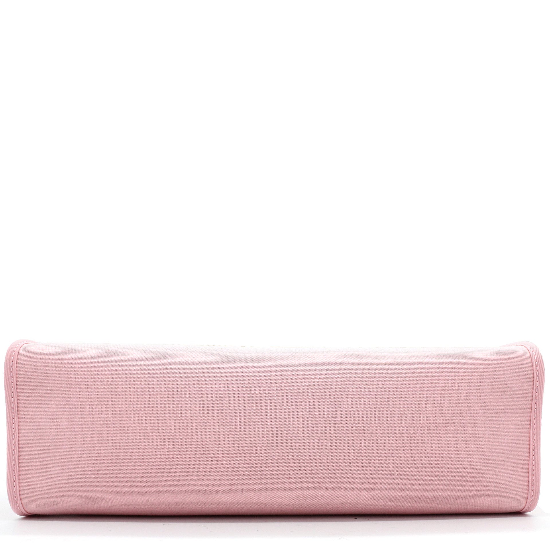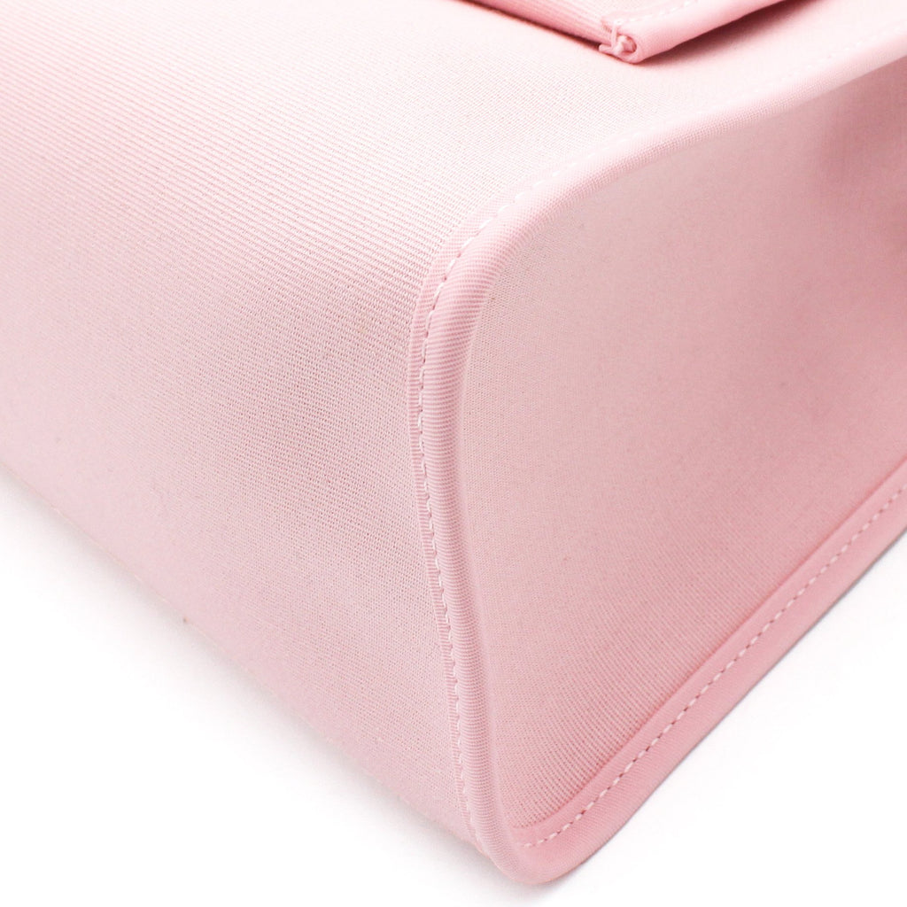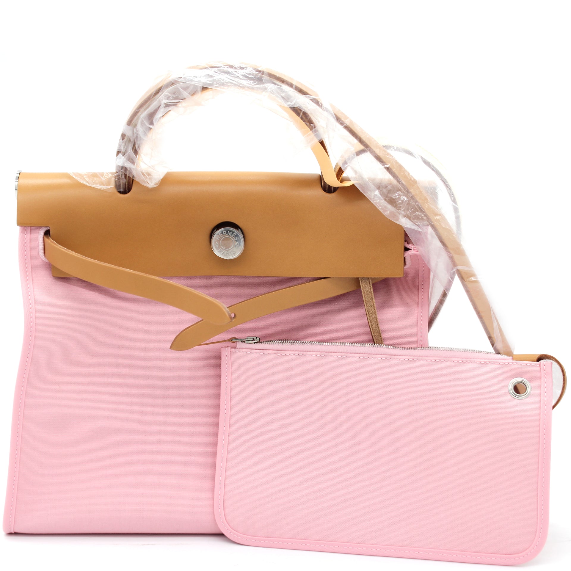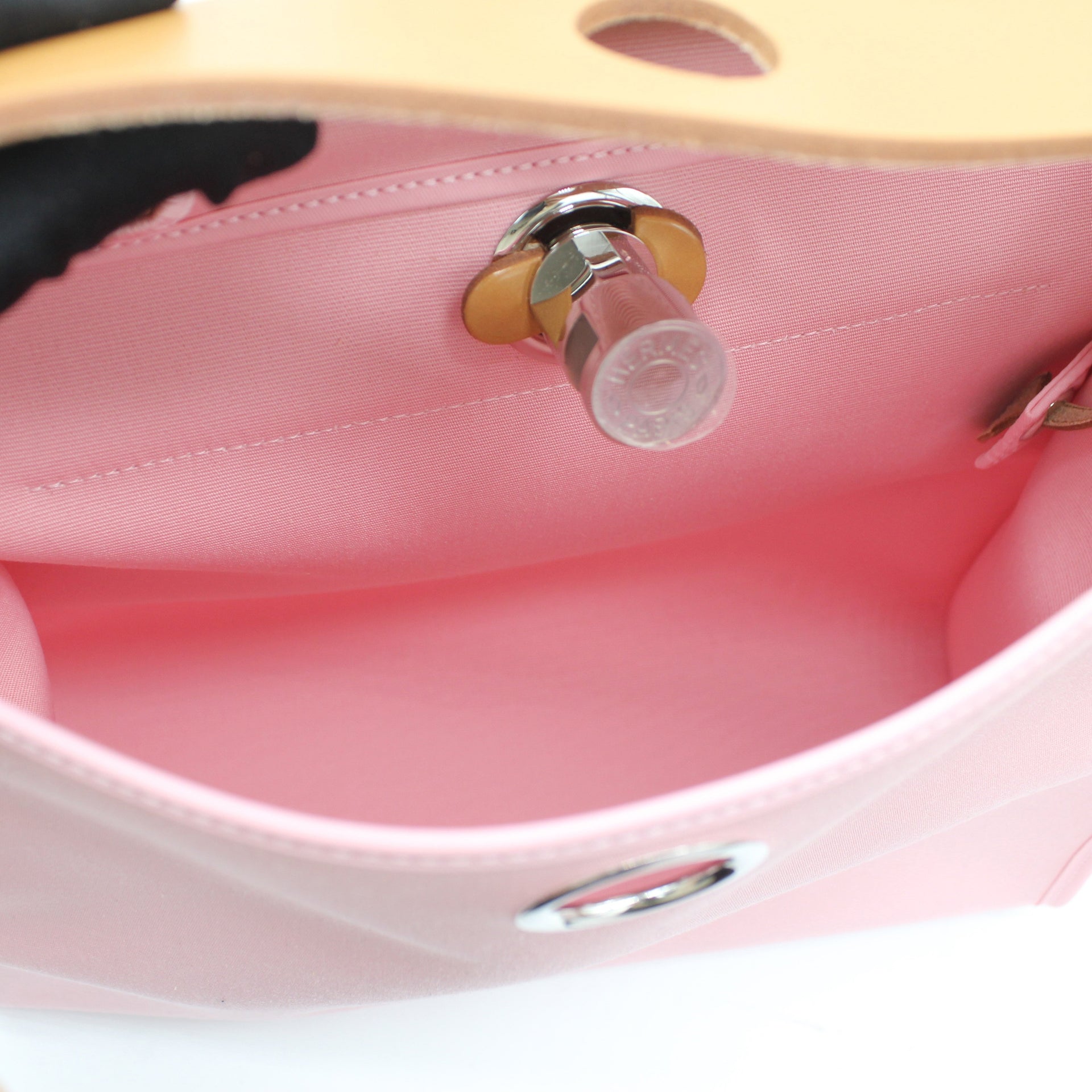 Exterior Material: Pink fabric and light brown leather with leather handle and a long strap. Interior Material: Fabric interior with one main compartment and a separate zipped pocket. Accessories: FULL SET; Receipt; Dust Bag; Box;