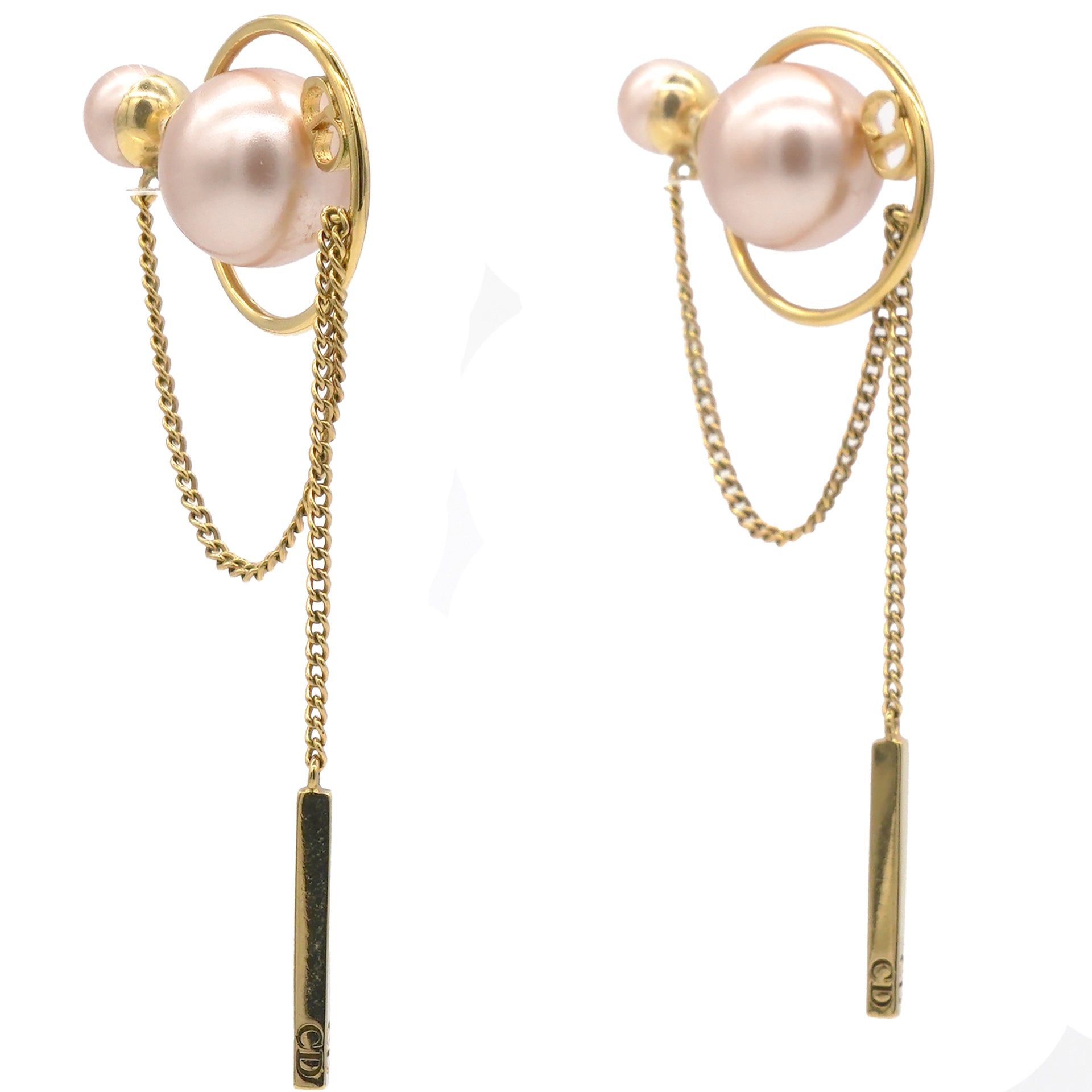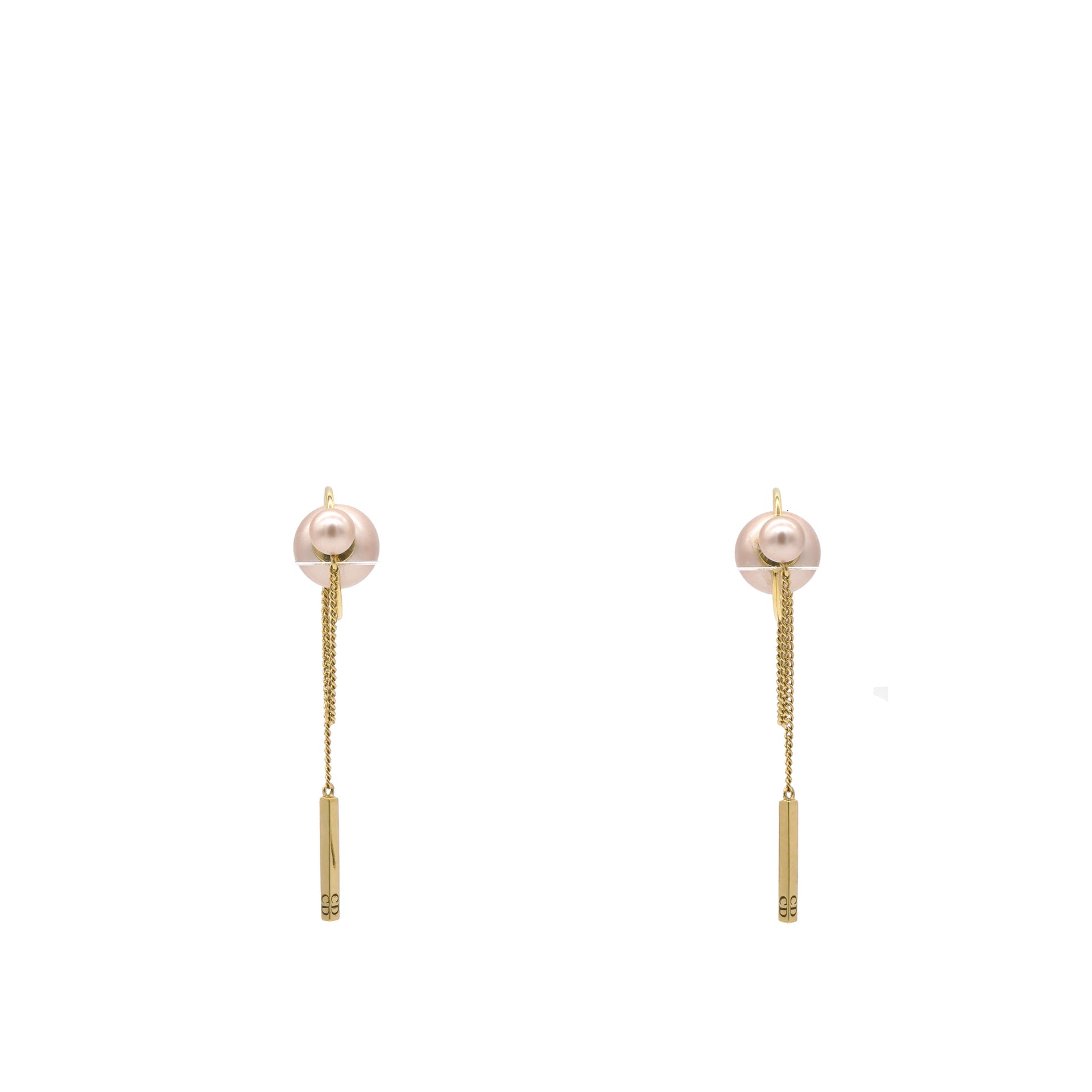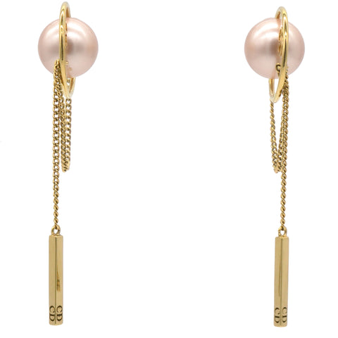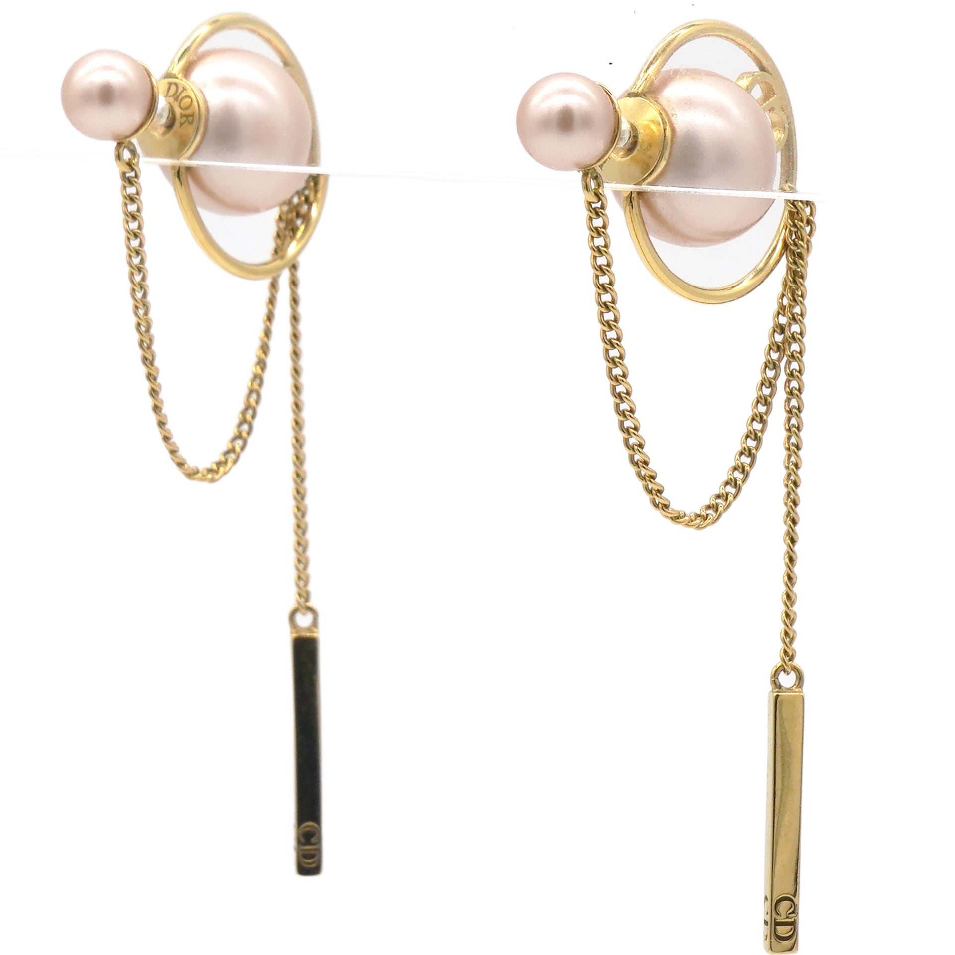 These earrings showcase a small pearl that sits on the ear while the larger one accented with faux pearl peeks out from behind the lobe. The pair is accented with chain accents for an edgy feel.