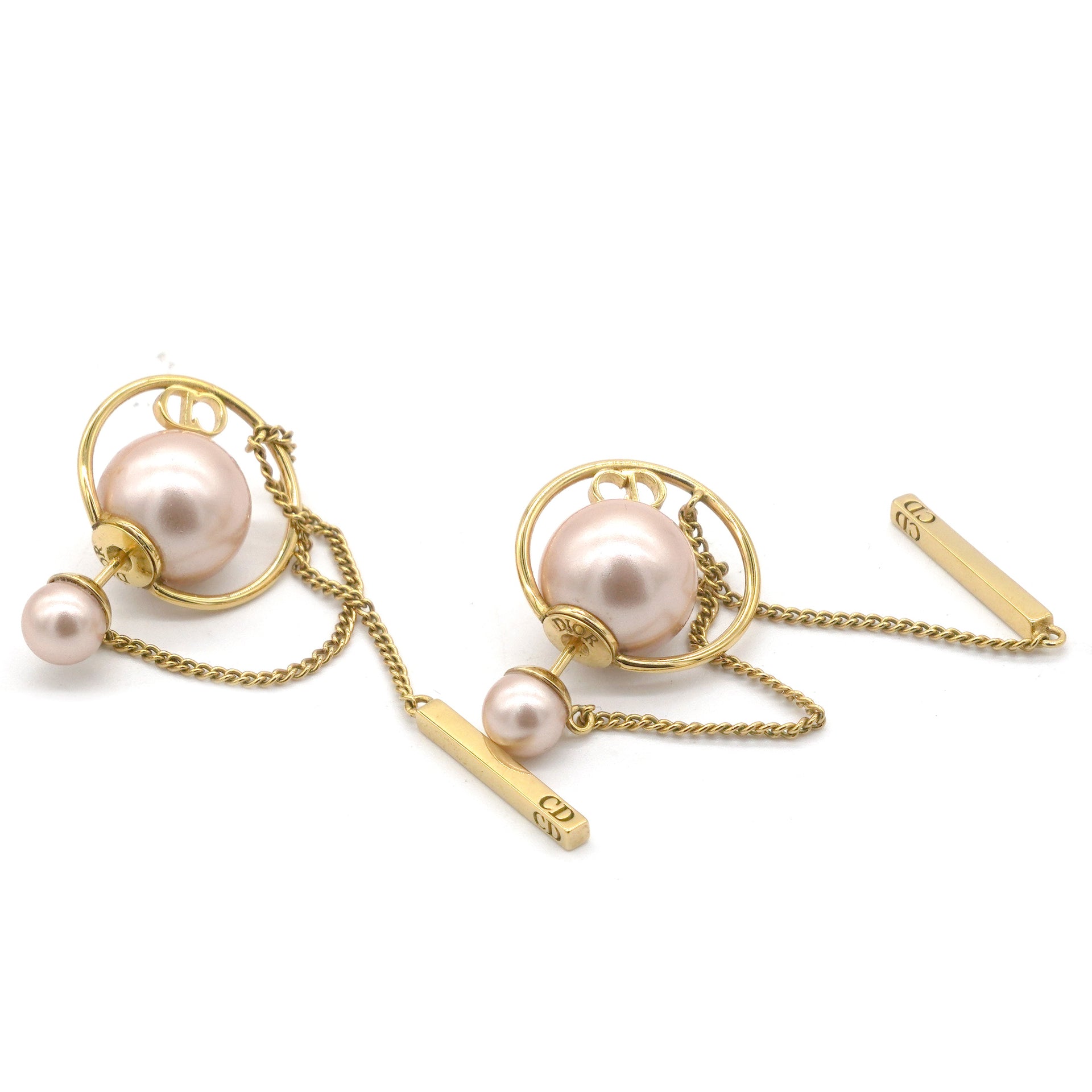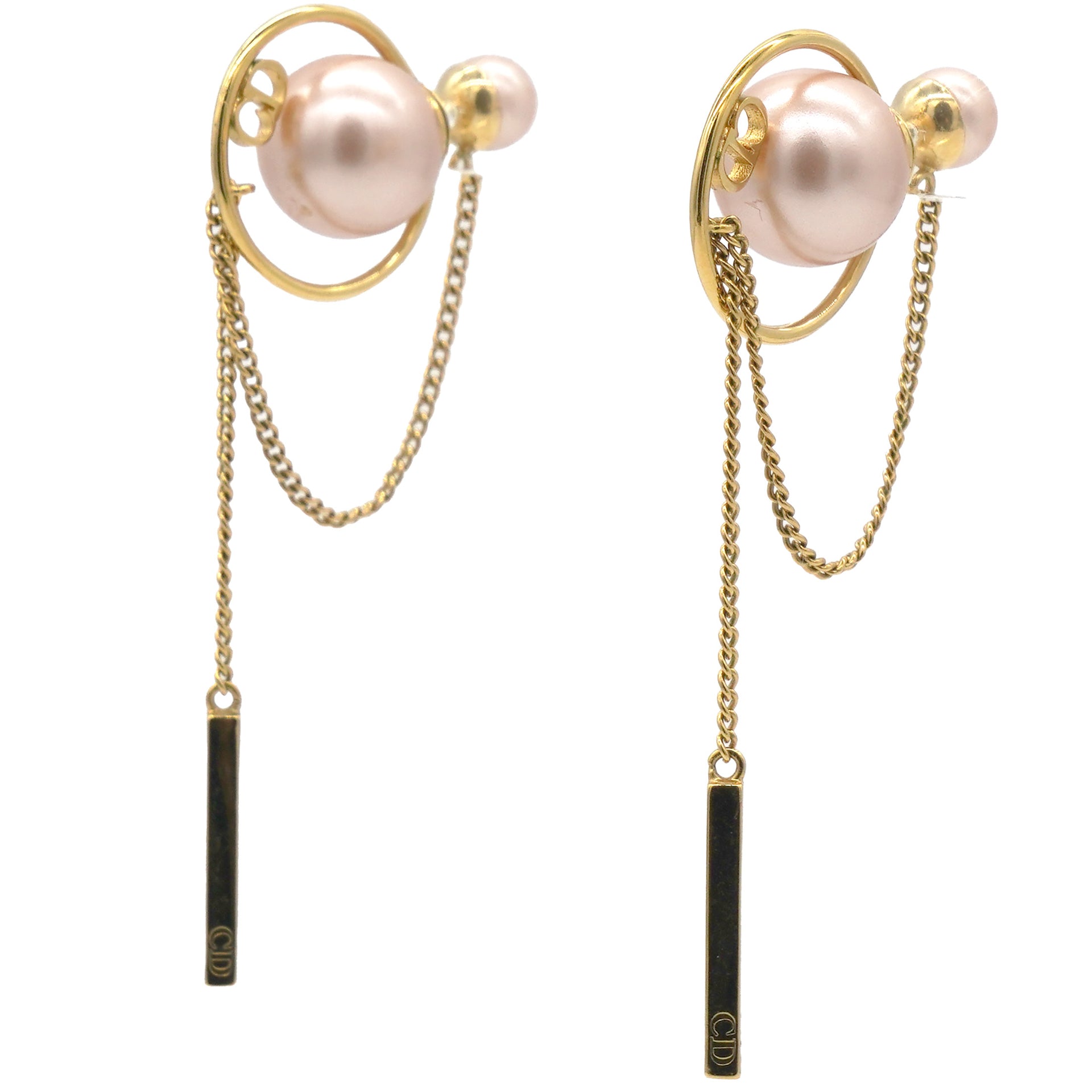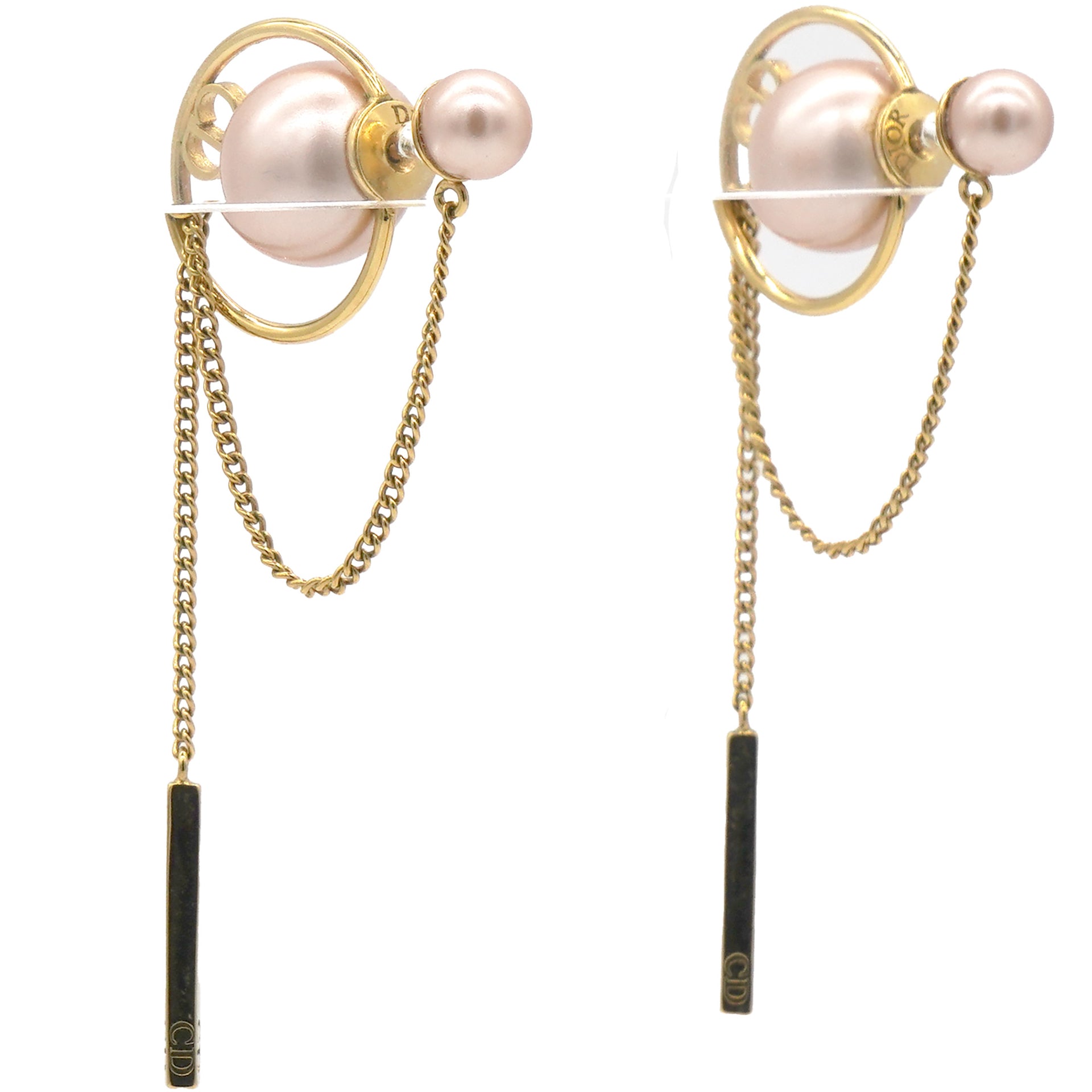 These earrings showcase a small pearl that sits on the ear while the larger one accented with faux pearl peeks out from behind the lobe. The pair is accented with chain accents for an edgy feel.