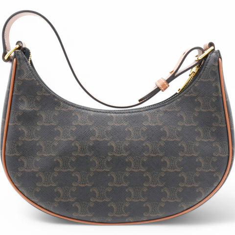 | This chic bag is crafted of fine black coated canvas with brown leather trim. The bag features an adjustable leather strap with gold hardware. The top zipper opens to a brown fabric interior with a patch pocket. |