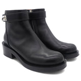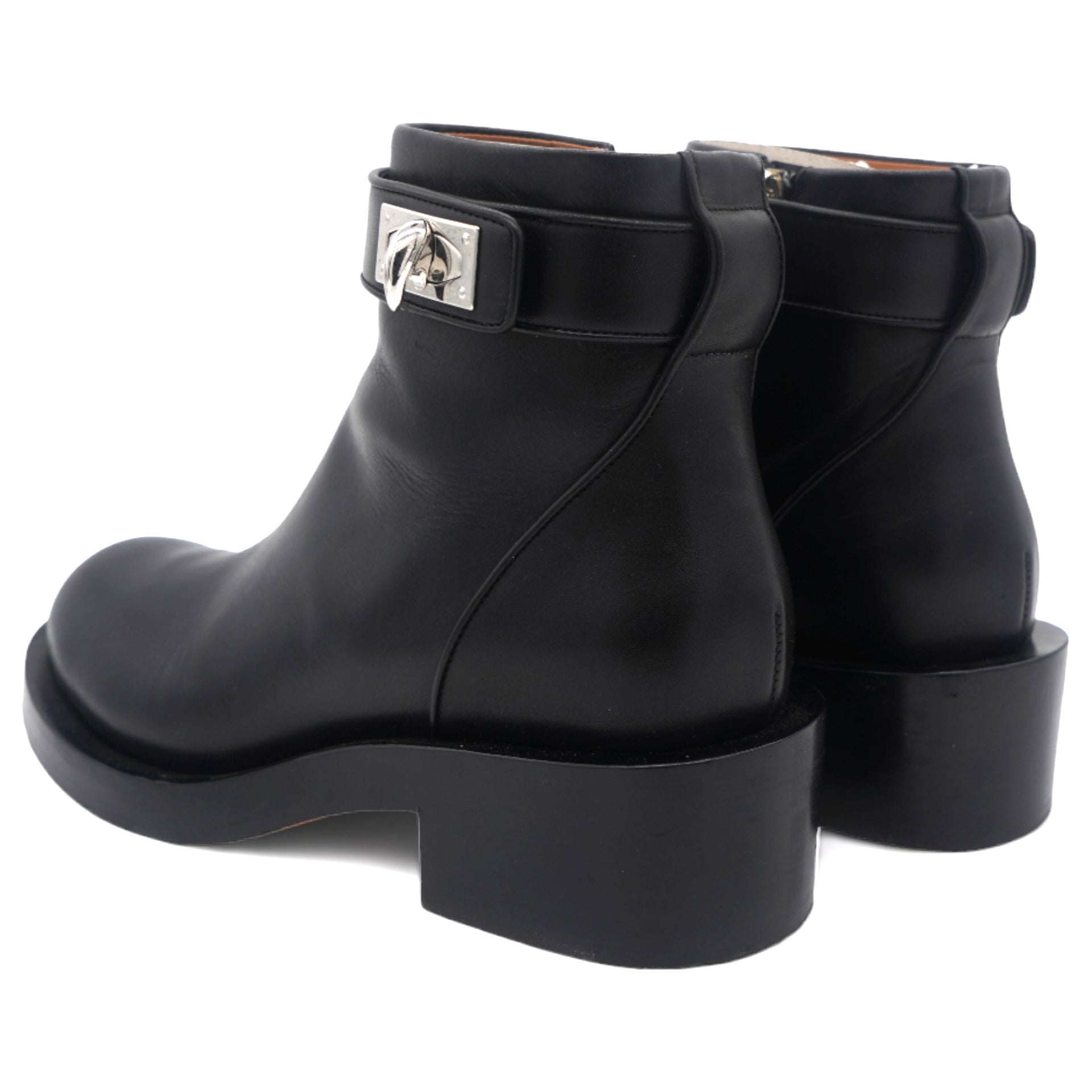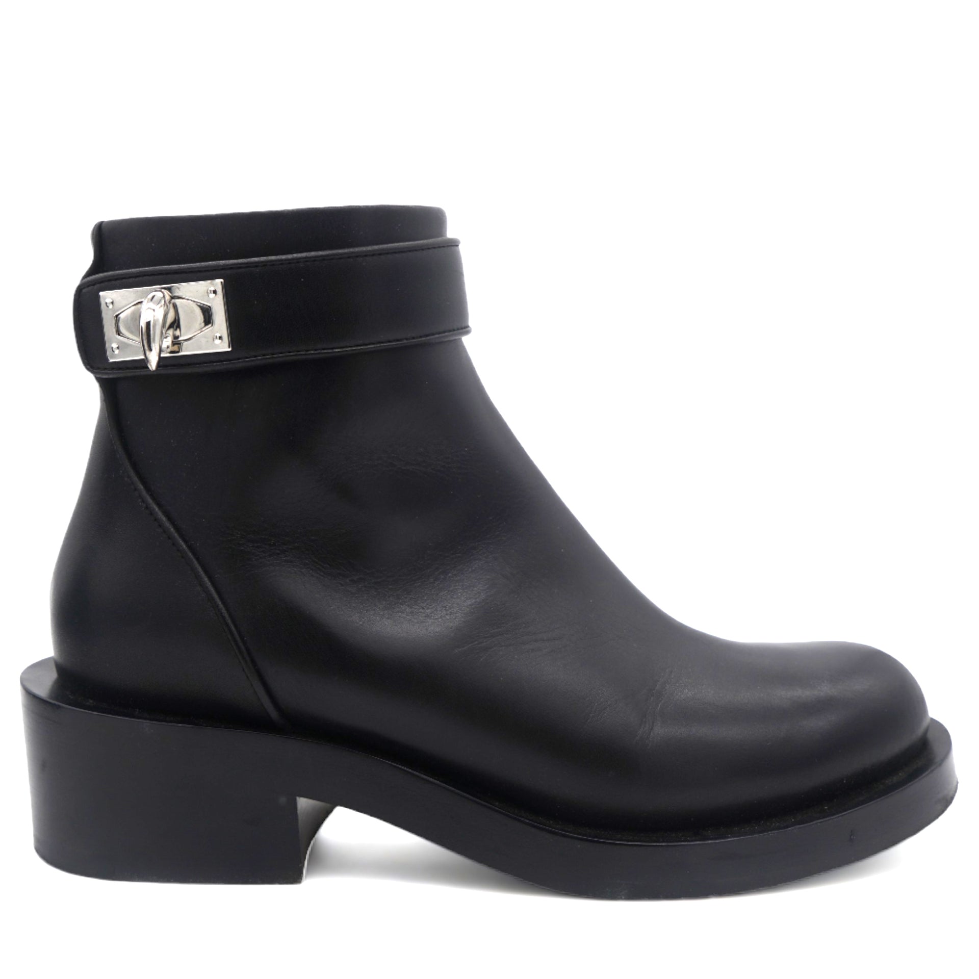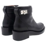 These stylish boots crafted in black leather with turn lock in plated silver around the ankles, zipper closure with 3 cm heels.