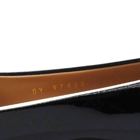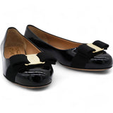 | A modern ballerina flat features a signature grosgrain bow across the toe threaded through a logo-embossed metal buckle. |
