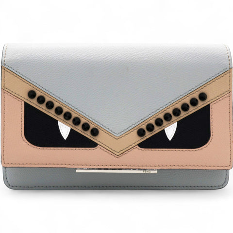 | This delightful wallet on chain is crafted of Fendi Vitello cross-grain leather with frightening monster eyes on the facing flap! The wallet features a silver chain shoulder strap and the flap opens to a card slots, patch pockets, and a currency compartment. |