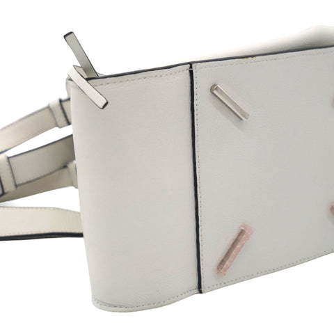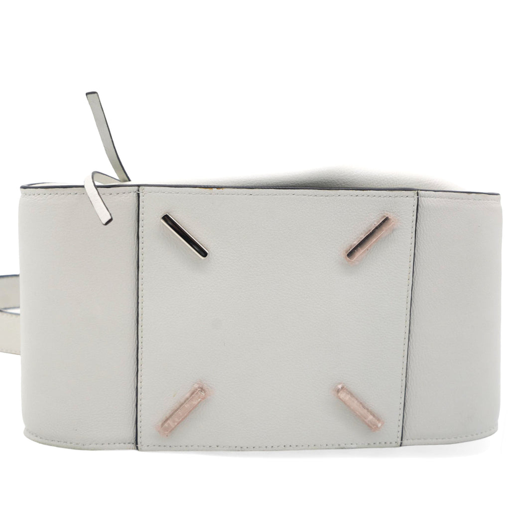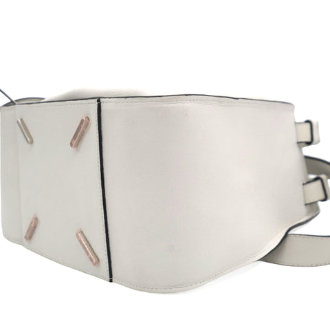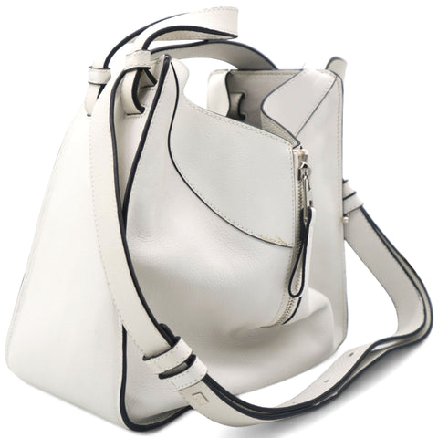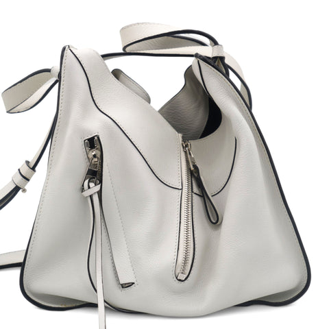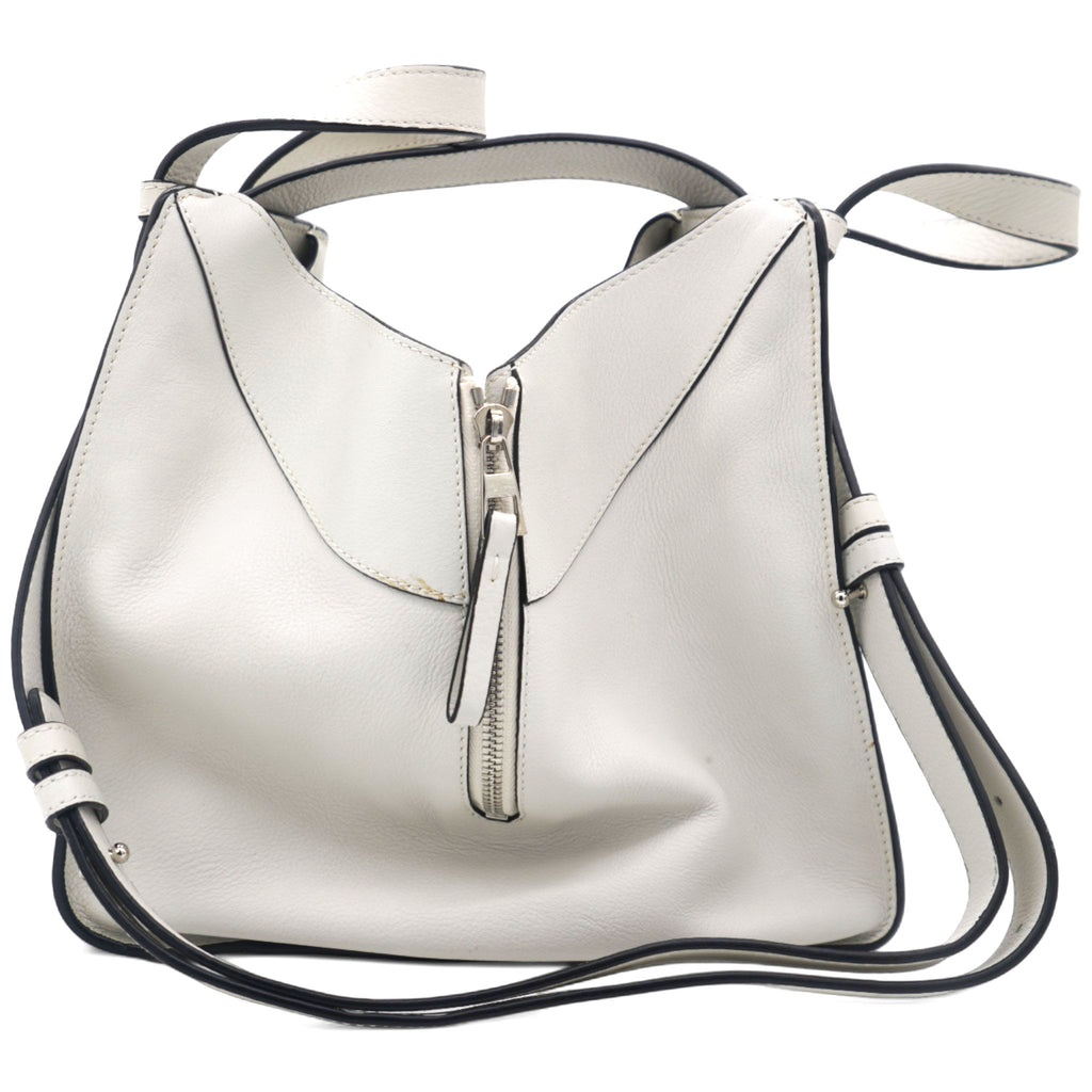 Loewe's high regard for unique designs and quality craftsmanship is exhibited in this small Hammock shoulder bag. Crafted using white leather, the shoulder bag has a highlighting zip detail along the middle, dual short handles with an attached shoulder strap on top, and a spacious fabric interior for your things. It's an accessory that delivers function and timeless allure.