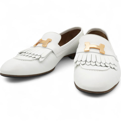 | These sophisticated loafers are crafted from smooth, premium leather, showcasing impeccable craftsmanship. Adorned with classic leather fringes and a bold gold Hermès H emblem, they blend timeless elegance with a touch of modern flair. Perfect for both professional and casual settings, these loafers embody Hermès' dedication to luxury and style. |