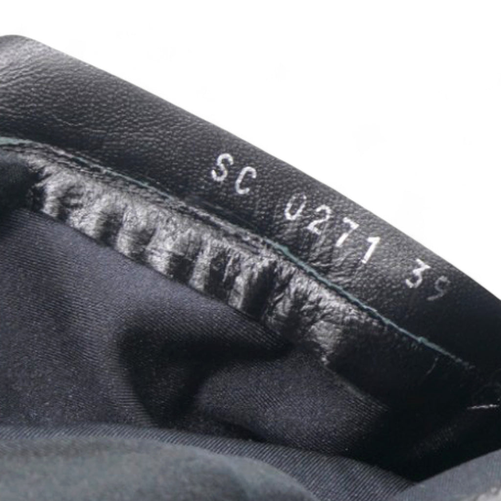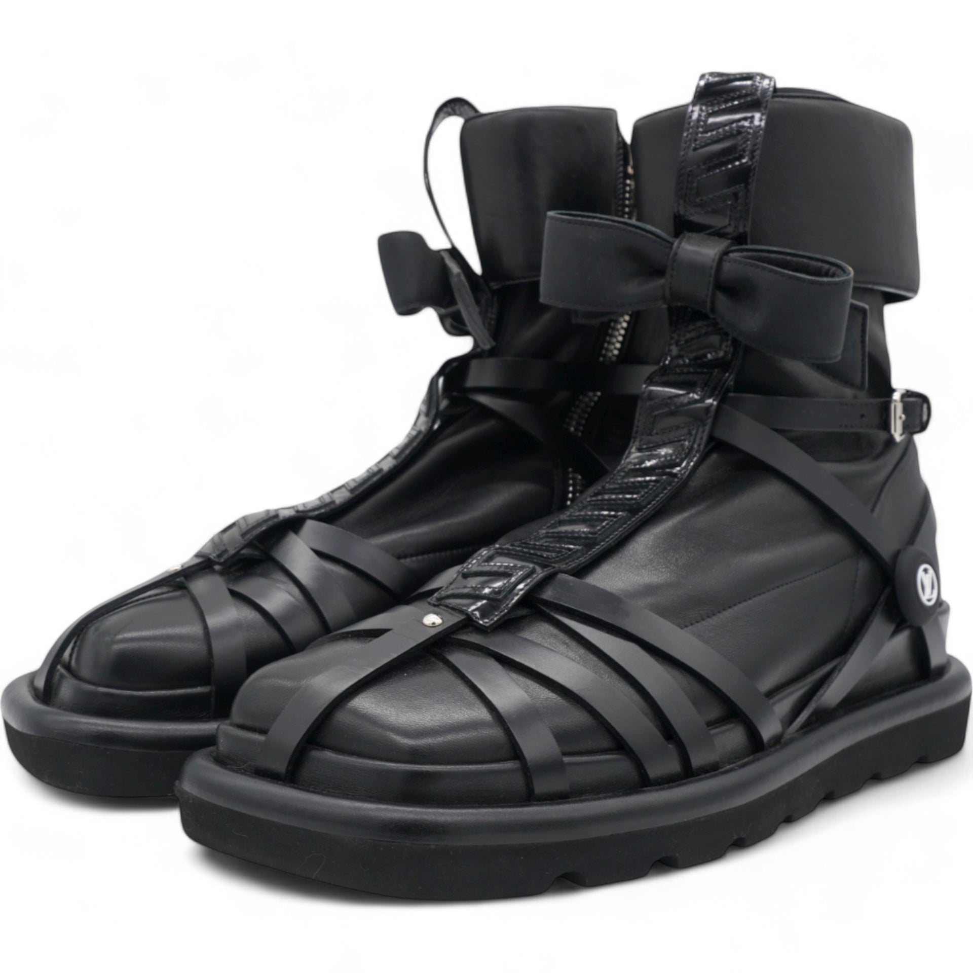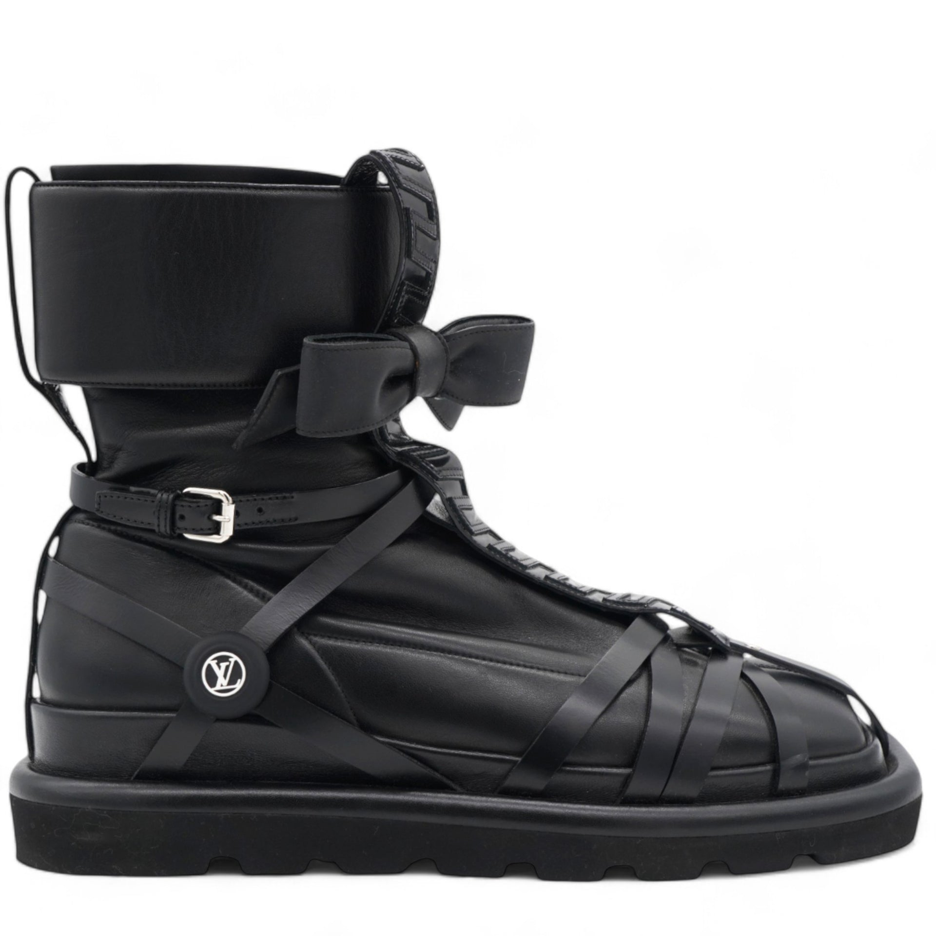 These stylish boots are crafted of black lambskin and calfskin leather with a bow. and Monogram detailing on the back.