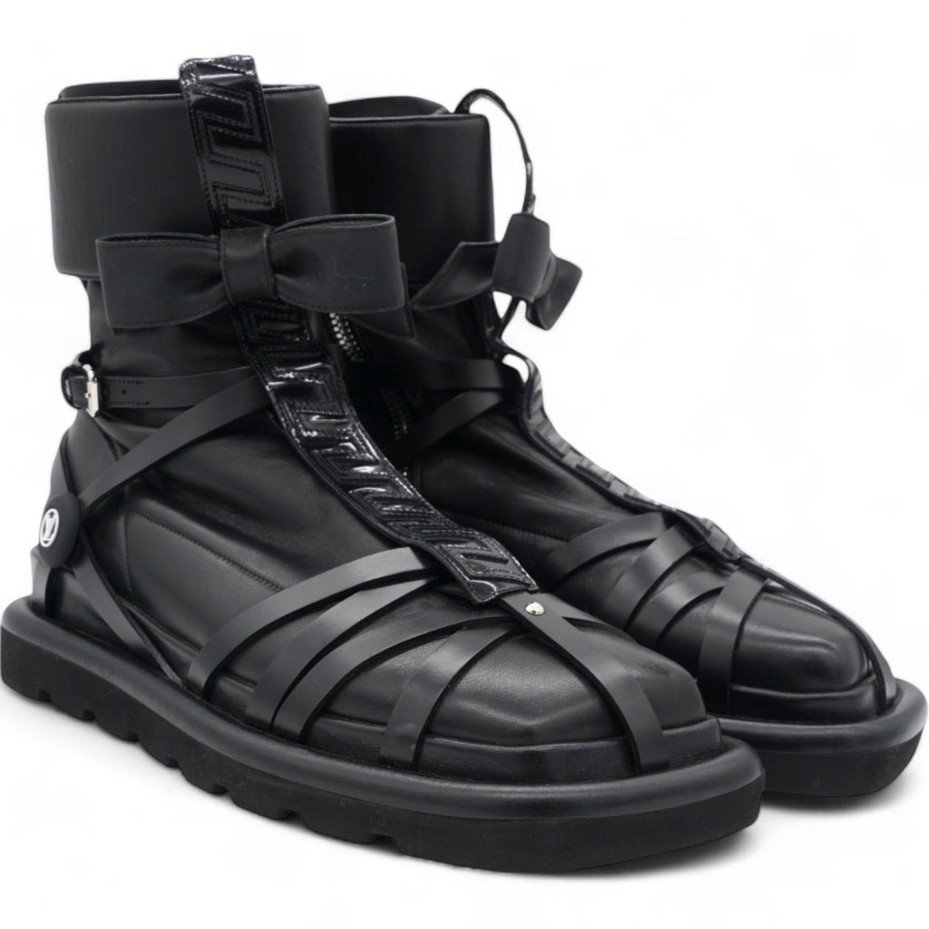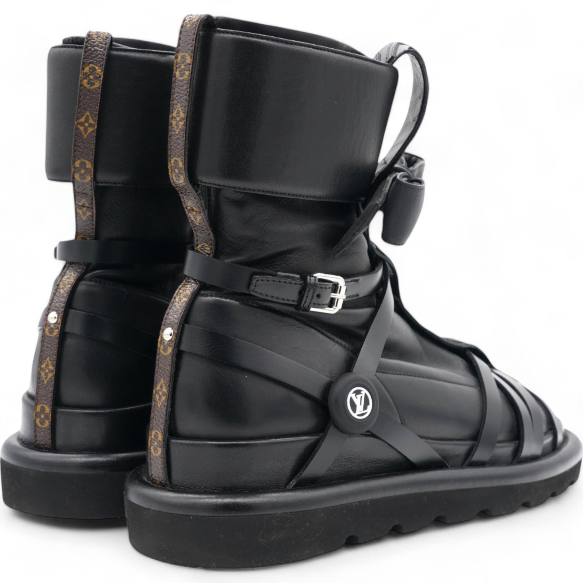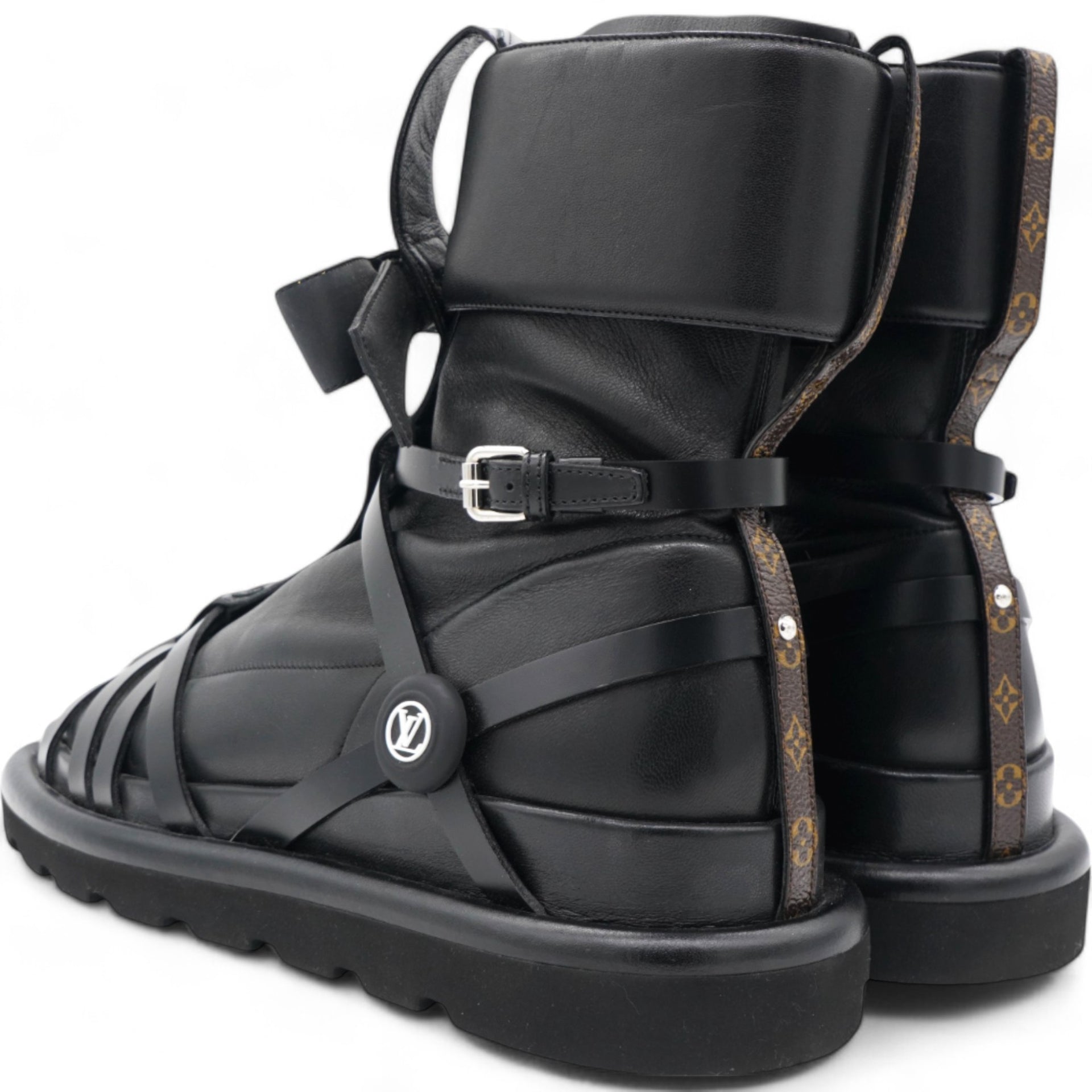 These stylish boots are crafted of black lambskin and calfskin leather with a bow. and Monogram detailing on the back.