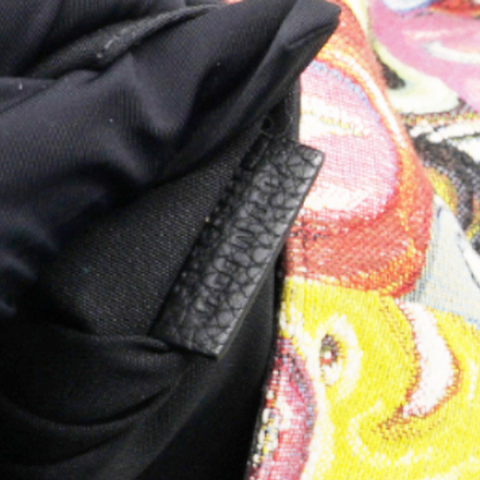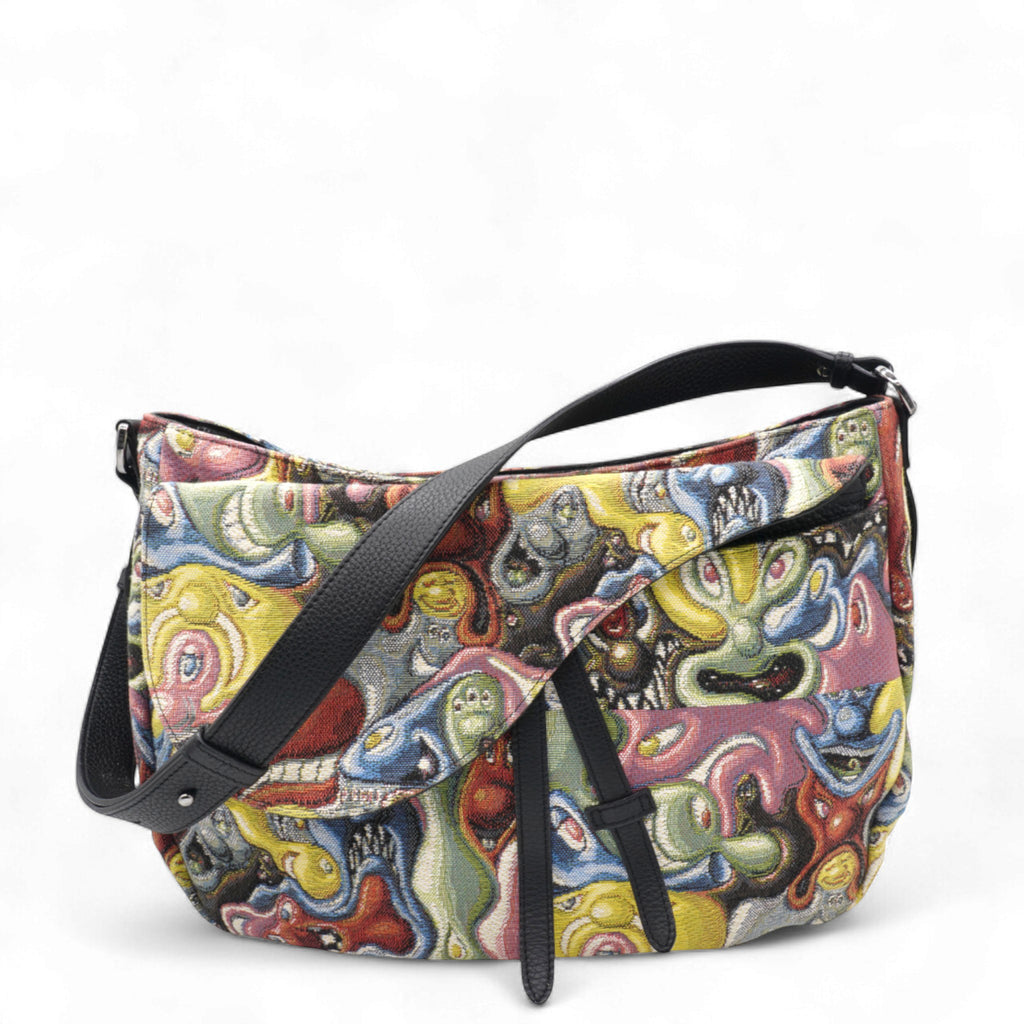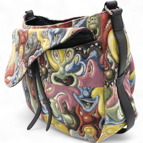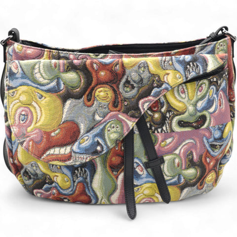 | This stylish handbag is crafted of a multicolor canvas. The bag features an adjustable black leather trim and strap with silver hardware. The top zipper opens to a black fabric interior with a patch pocket. |