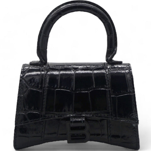 | The Hourglass features an embossed leather body, a rolled top handle, a detachable flat leather shoulder strap, a front flap with magnetic snap closure, and an interior slip pocket. |