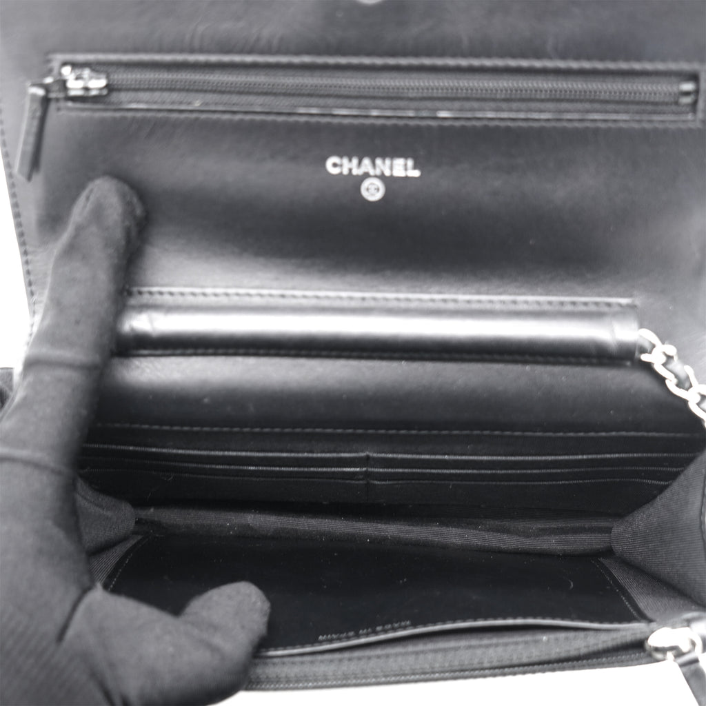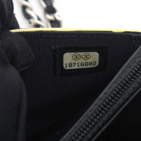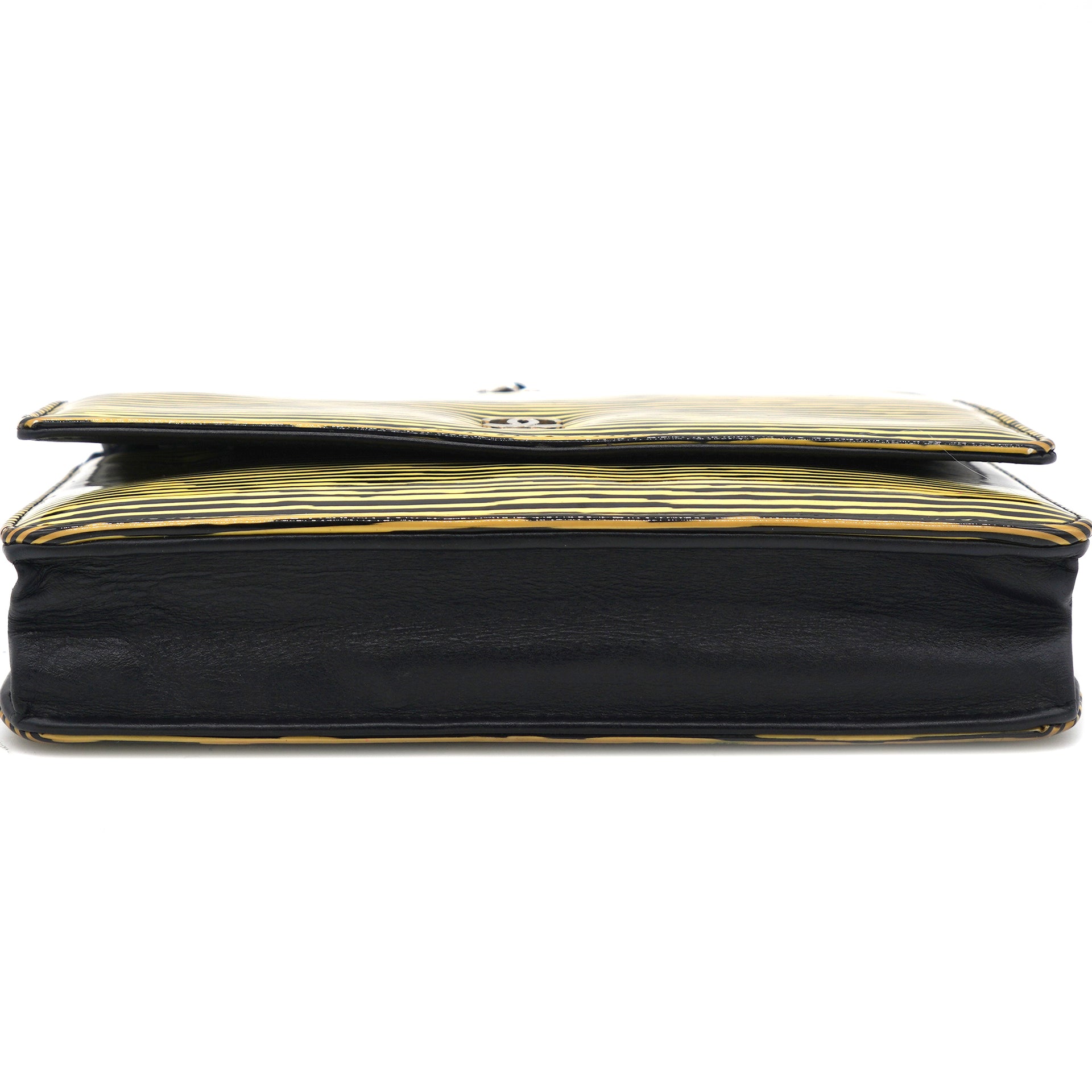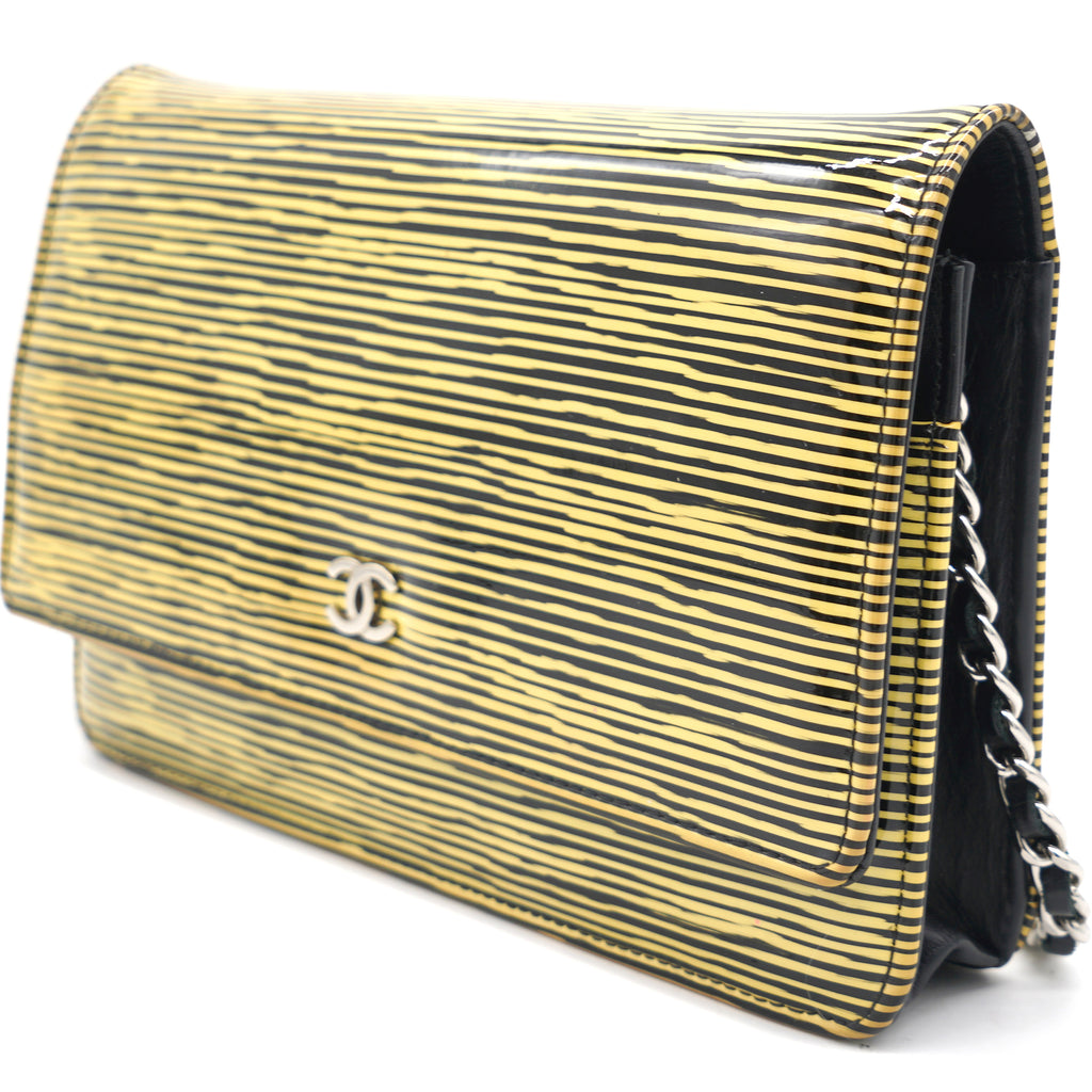 | This sophisticated shoulder bag showcases a classic Chanel wallet on chain with luxurious patent leather with black and yellow stripes. The bag has polished silver chain link shoulder straps threaded with black leather and a silver Chanel CC logo. The flap opens and reveals a black leather interior with credit card slots, slit pocket and zipper pocket. |