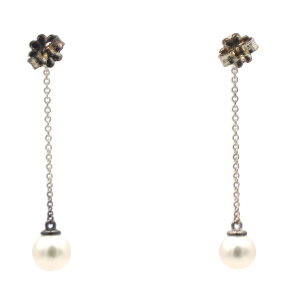 | The dream to own a pair of the prettiest earrings ends with these from Tiffany & Co. Crafted from silver, they have been breathtakingly designed with a bead and a dangling chain holding a cultured pearl. Give your face the radiance by wearing this pair with your dresses. |